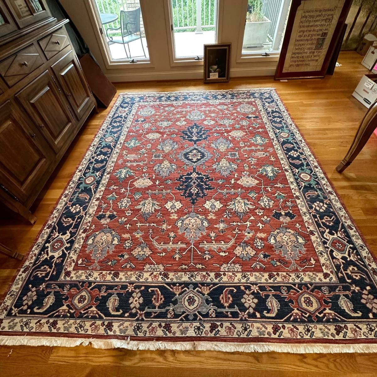 Blue, rust and cream colored area rug. No labels. No visible stains. Measures 10’2” x 7’11”. Local pick up only