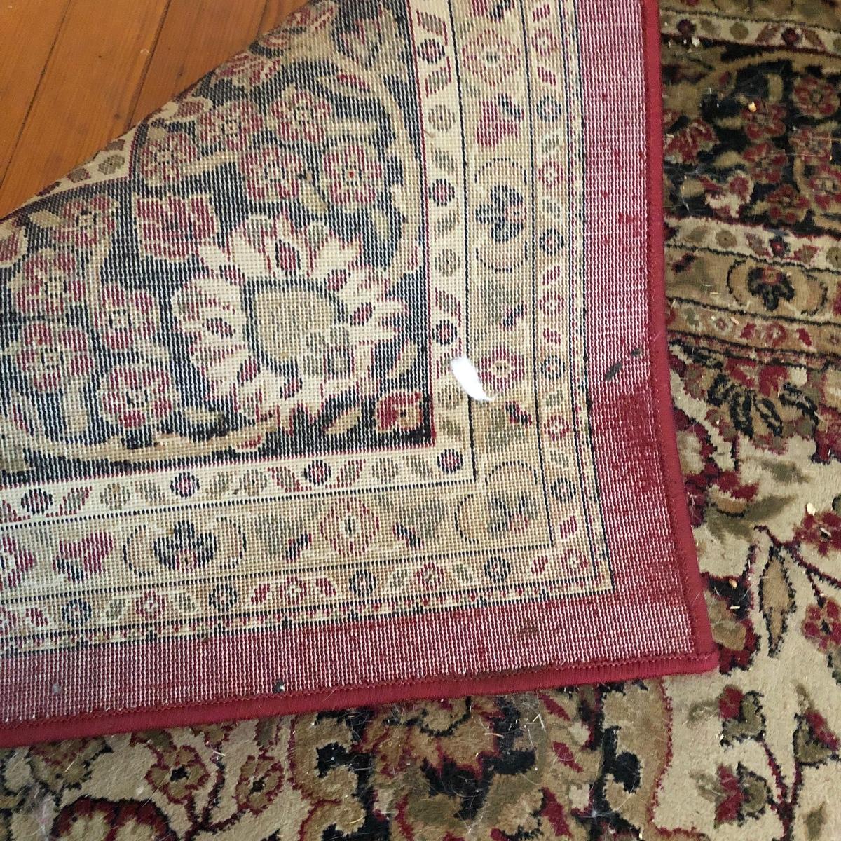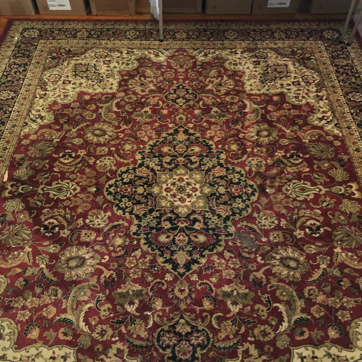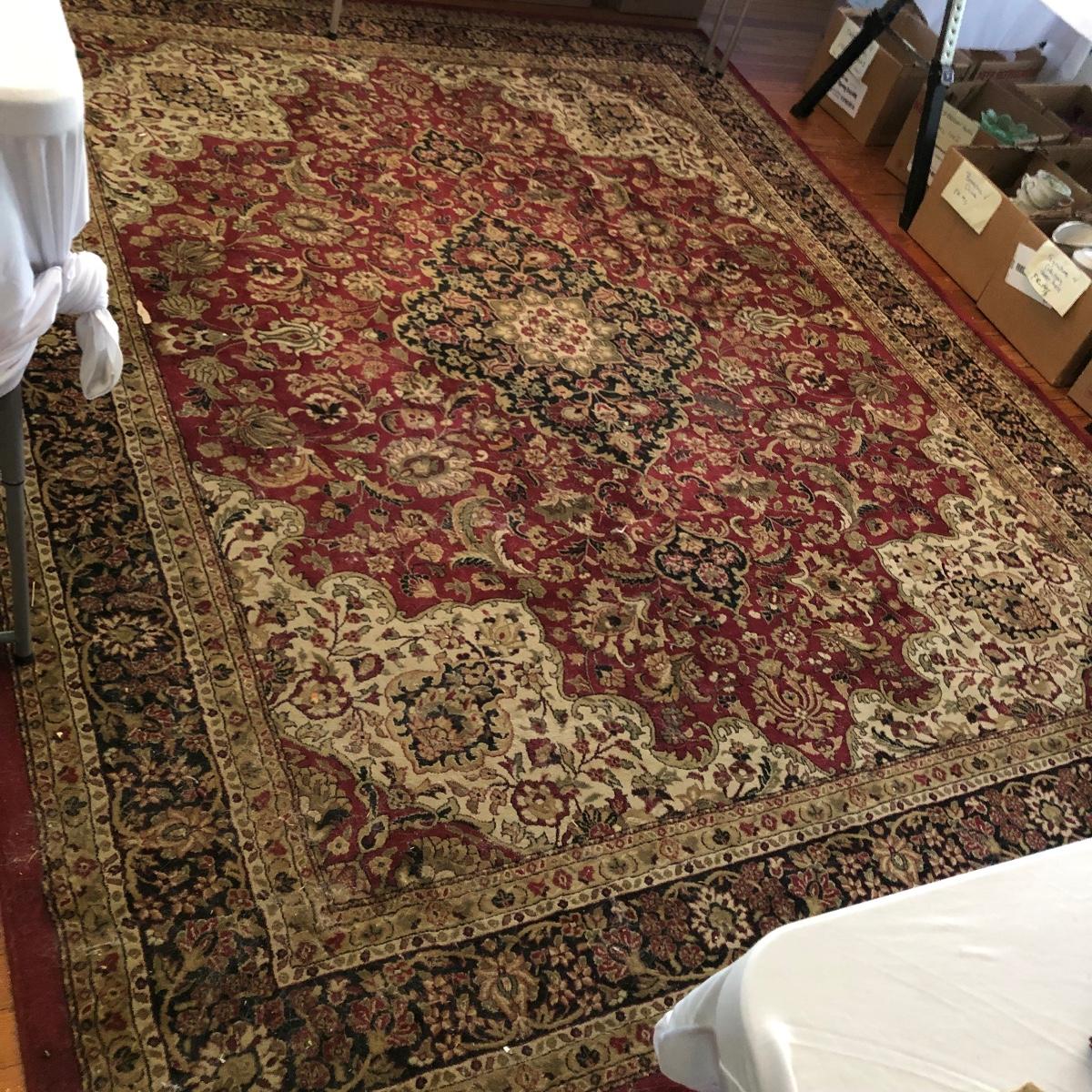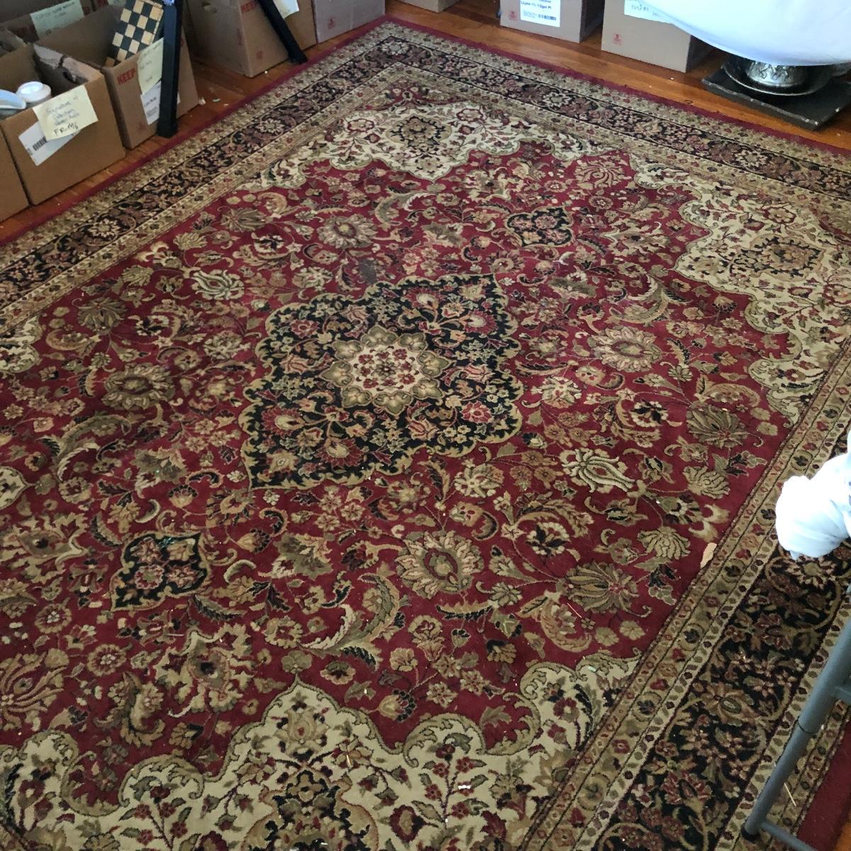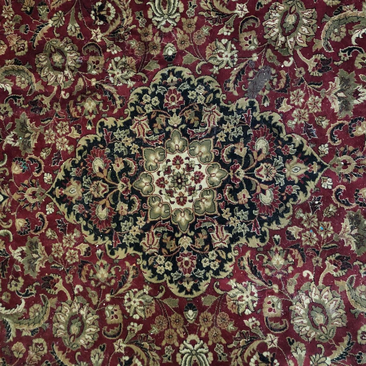 Lot includes a large area rug in a maroon color with blue and brown floral design.. Rug measures 94” x 118”.