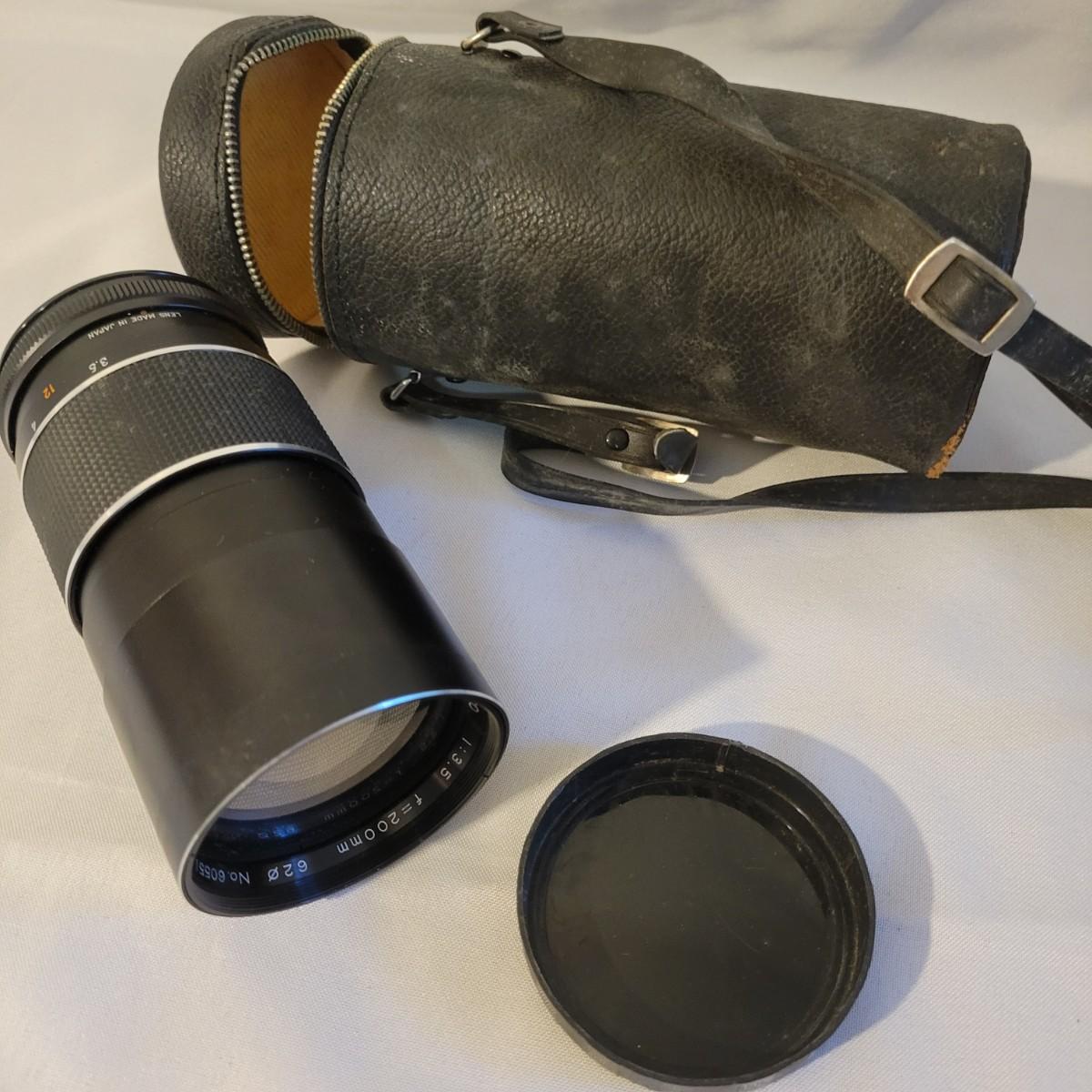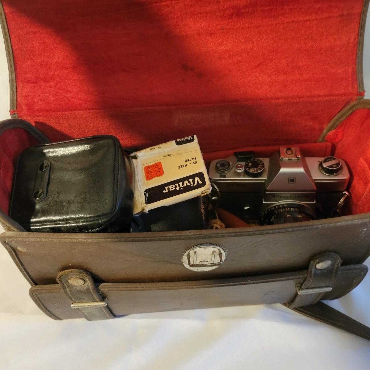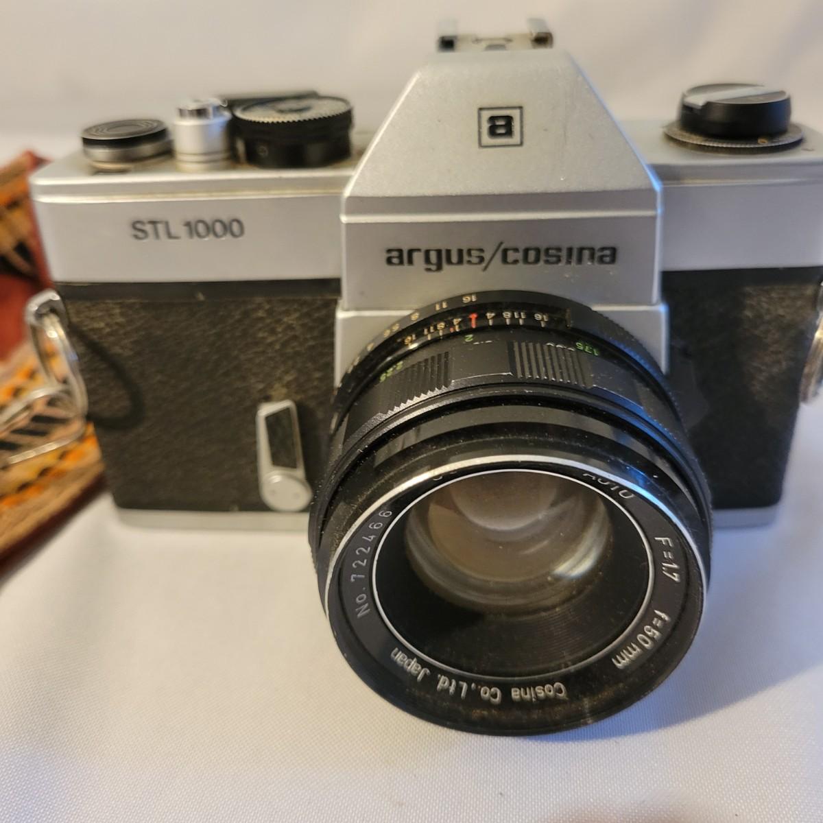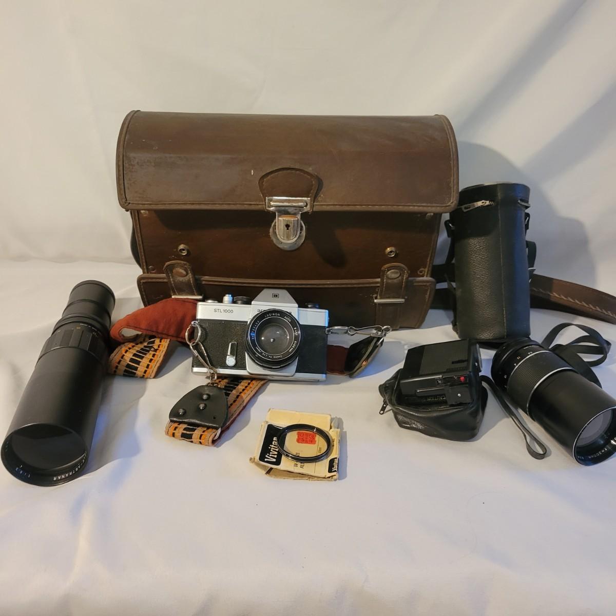 A vintage Argus/Cosina STL1000 35mm camera in good condition that includes a neck strap. Also included in this lot is a telephoto lens manufactured by Tele-Astranar, an additional lens manufactured by Montgomery Ward with its own leather case, an attachable flash and an UV filter. All of this comes in a handsome leather camera bag with telephoto lens compartment and storage for your camera and other items. Also included is a Konica Color CV Hexagon video camera. The cord is slightly rusted. Battery powered but cannot confirm it turns on. Measures about 9in. Bag measures approximately 14" x 6" x 10" Shipping available
