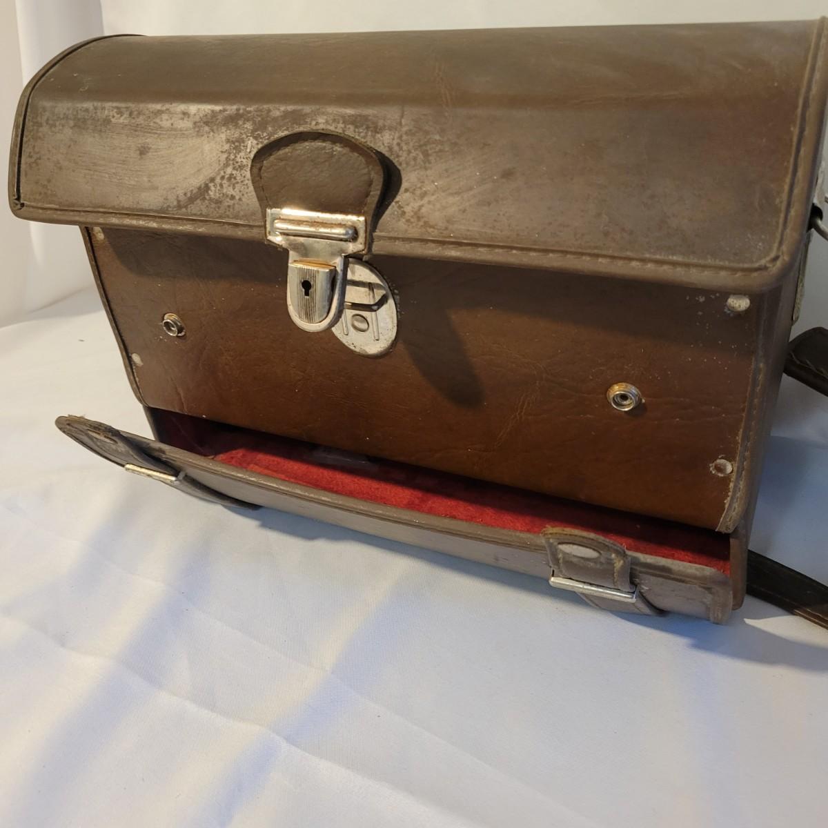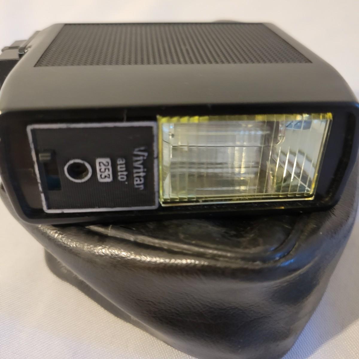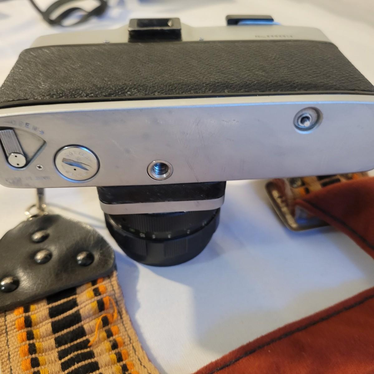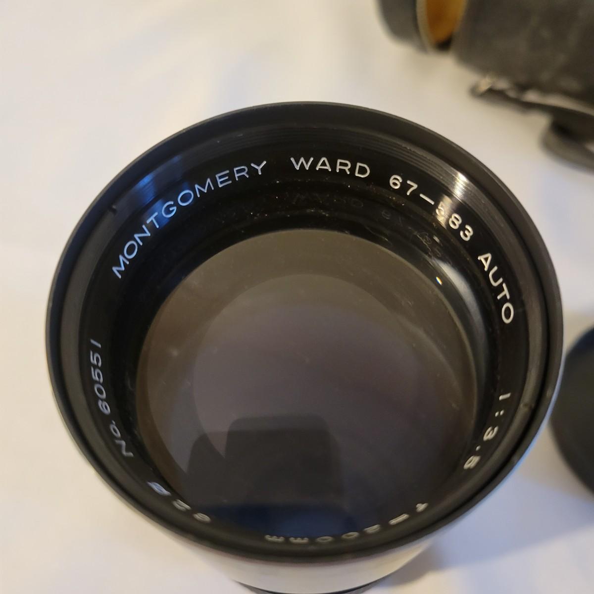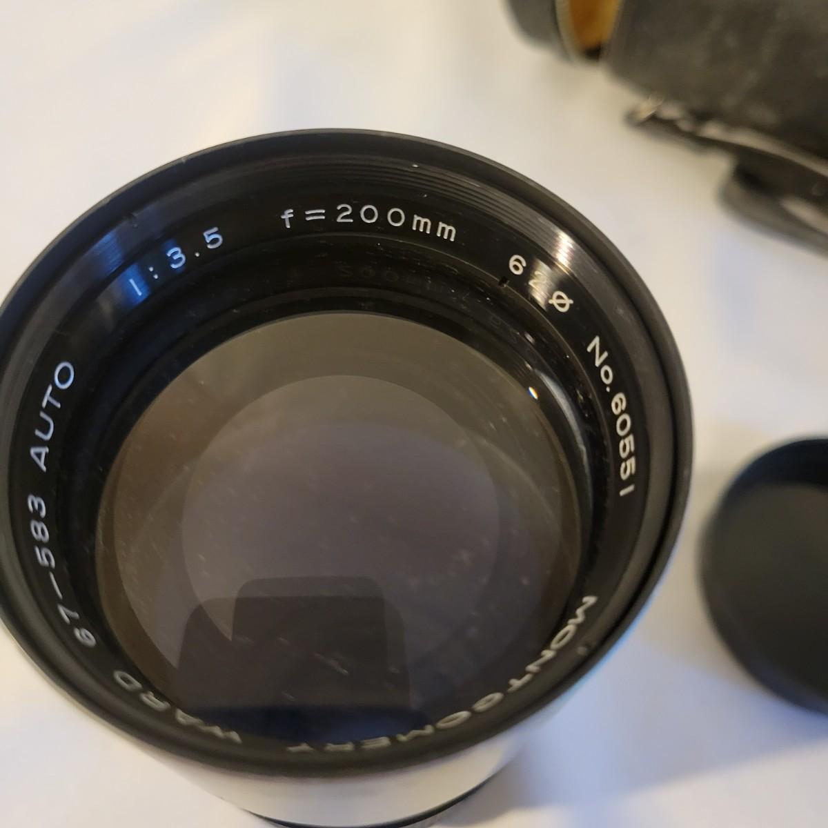 A vintage Argus/Cosina STL1000 35mm camera in good condition that includes a neck strap. Also included in this lot is a telephoto lens manufactured by Tele-Astranar, an additional lens manufactured by Montgomery Ward with its own leather case, an attachable flash and an UV filter. All of this comes in a handsome leather camera bag with telephoto lens compartment and storage for your camera and other items. Also included is a Konica Color CV Hexagon video camera. The cord is slightly rusted. Battery powered but cannot confirm it turns on. Measures about 9in. Bag measures approximately 14" x 6" x 10" Shipping available
