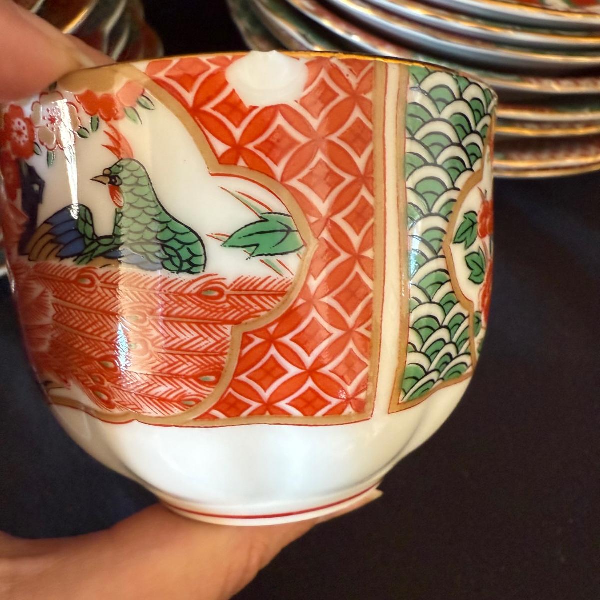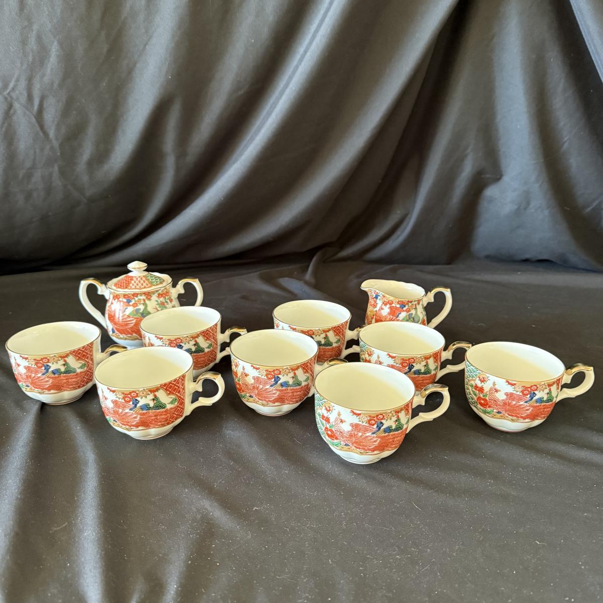 This lot contains a stunning and impressive Arita Imari 46pc China set. Included in this set is a serving bowl, a serving dish with lid, a serving plate, a creamer, a sugar bowl, eight tea cups, eight saucers, nine 10”D dinner plates, eight 7.5”D x 1.5”H bowls, and eight scalloped 7”D salad plates. This gorgeous porcelain set features vibrant peacocks and gold trim. Only noticeable damage is a small chip in a teacup, see pictures for details. Shipping available. Shipping can be costly. We suggest contacting our preferred local shipping provider, Postage Express, with dimensions and getting an estimate before bidding: (828) 255-9250 or shipping@postageexpressnc.com.