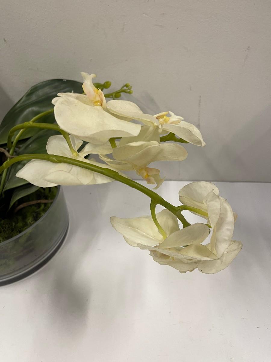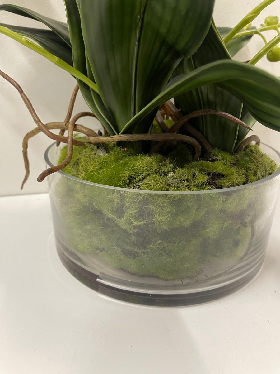 Artificial orchid plant. Clear glass planter is approx 8" x 3 1/2". Plant is approx 16" high.