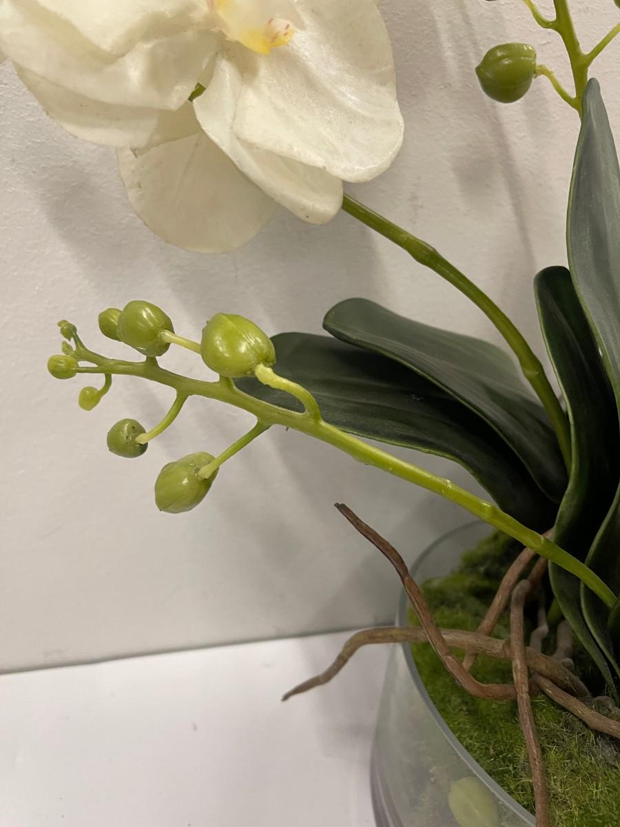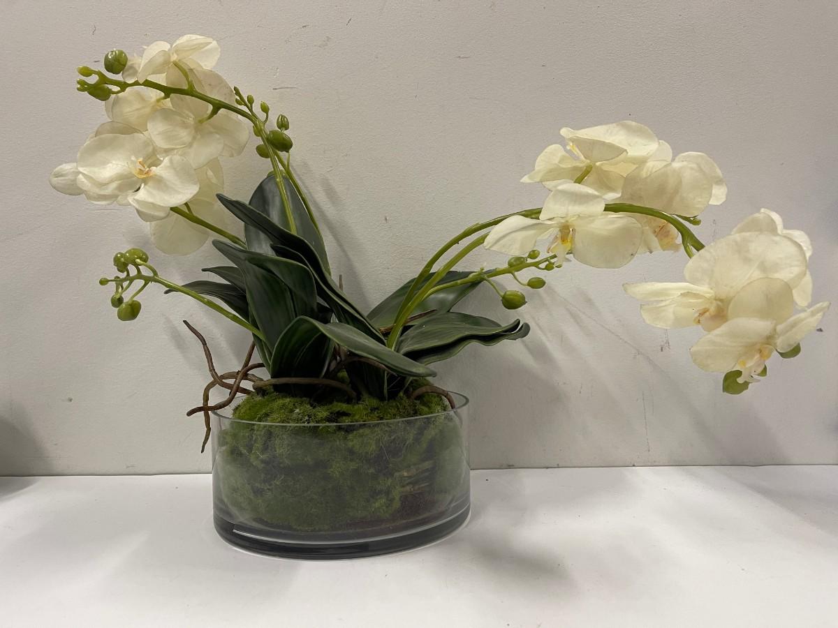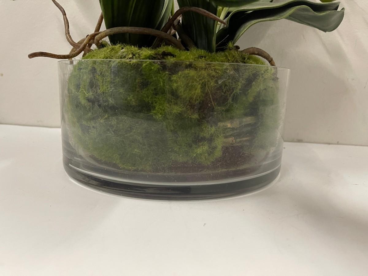 Artificial orchid plant. Clear glass planter is approx 8" x 3 1/2". Plant is approx 16" high.