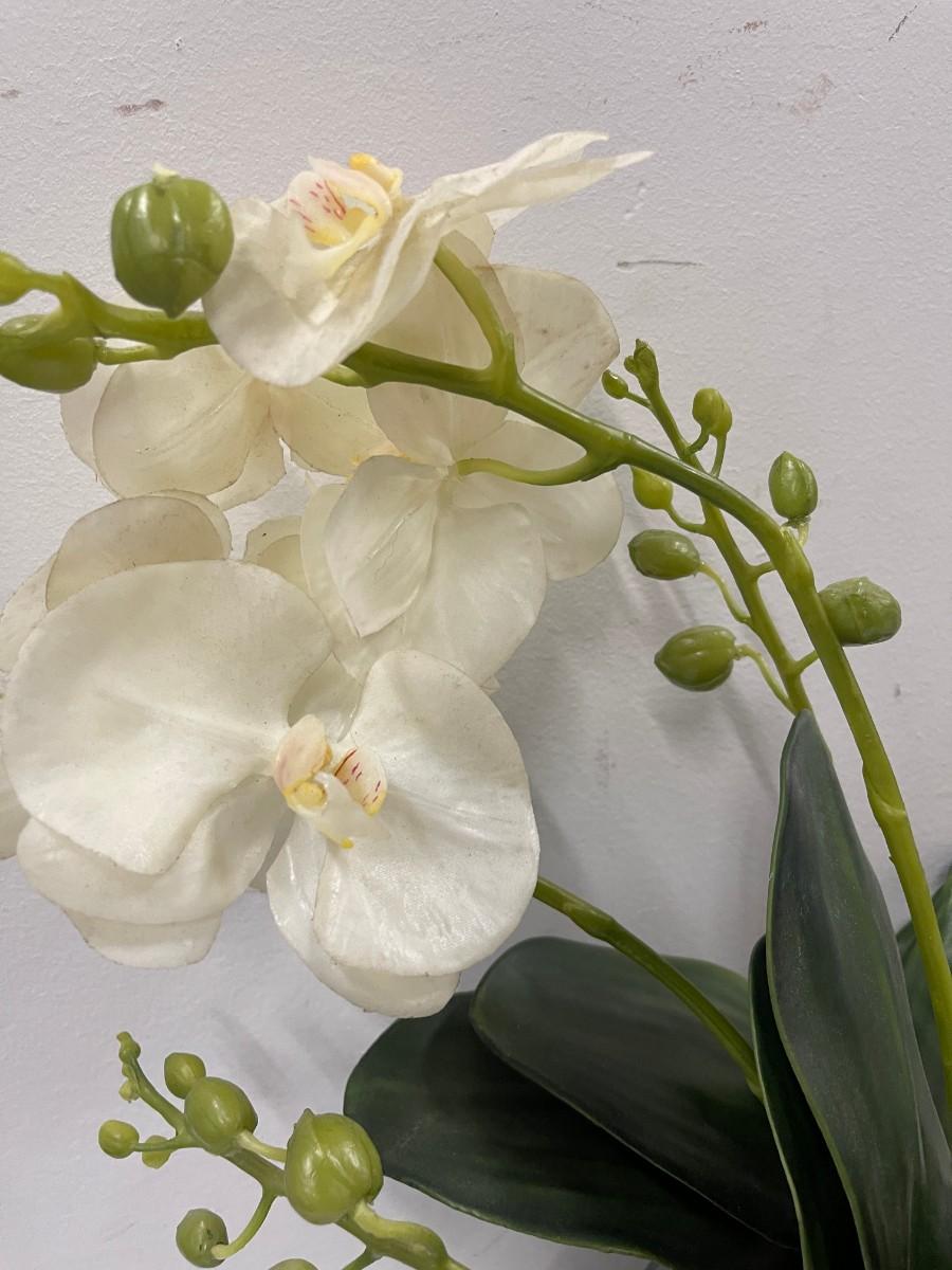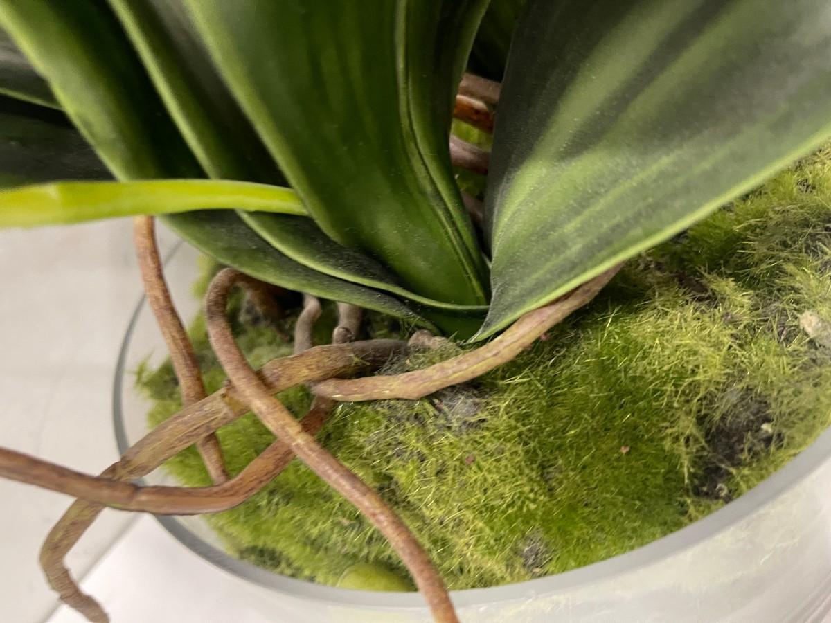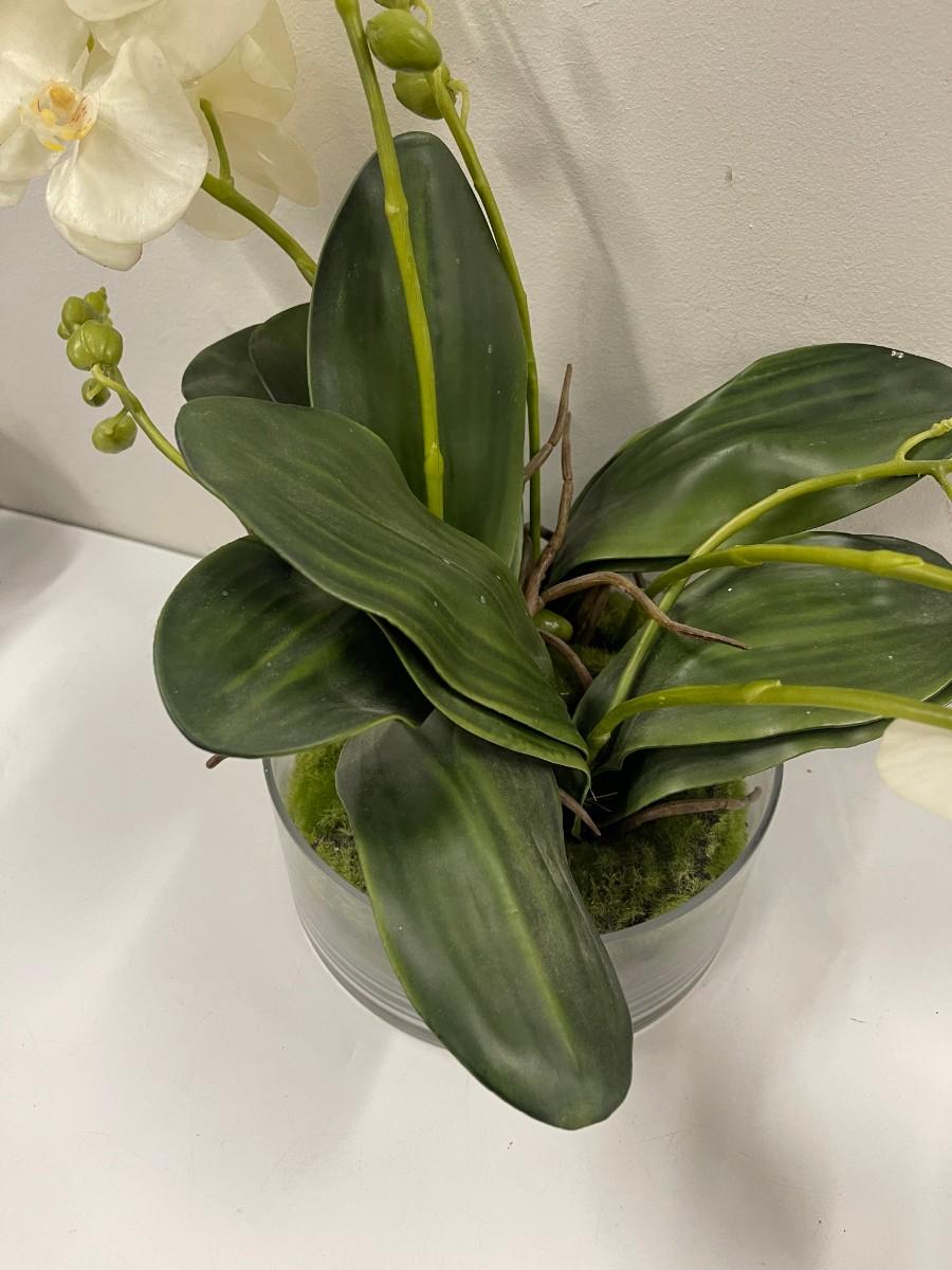 Artificial orchid plant. Clear glass planter is approx 8" x 3 1/2". Plant is approx 16" high.