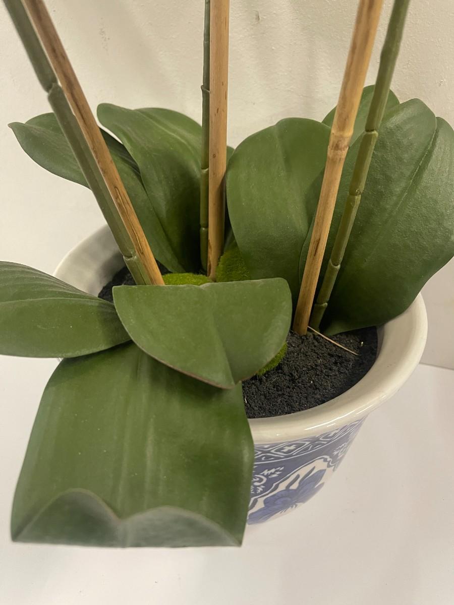 Artitificial potted orchid in blue and white porcelain planter. 7 1/2" x 22 1/2" (to top of plant)