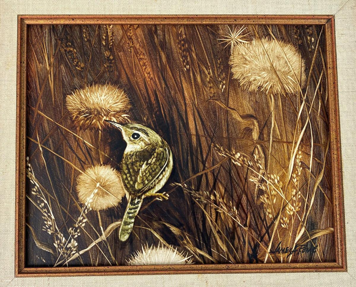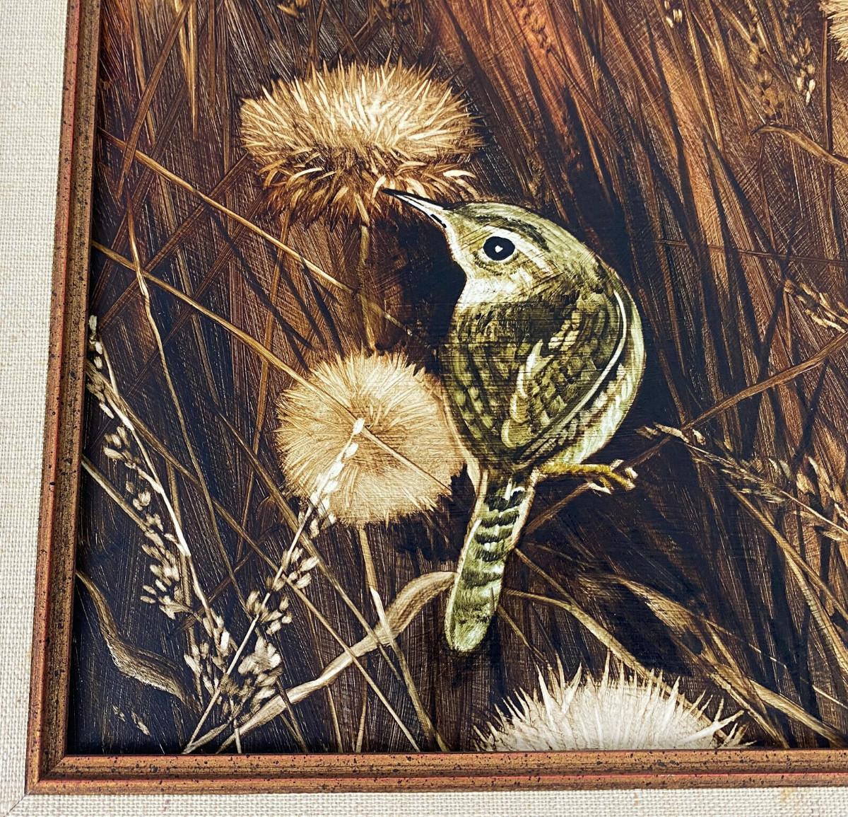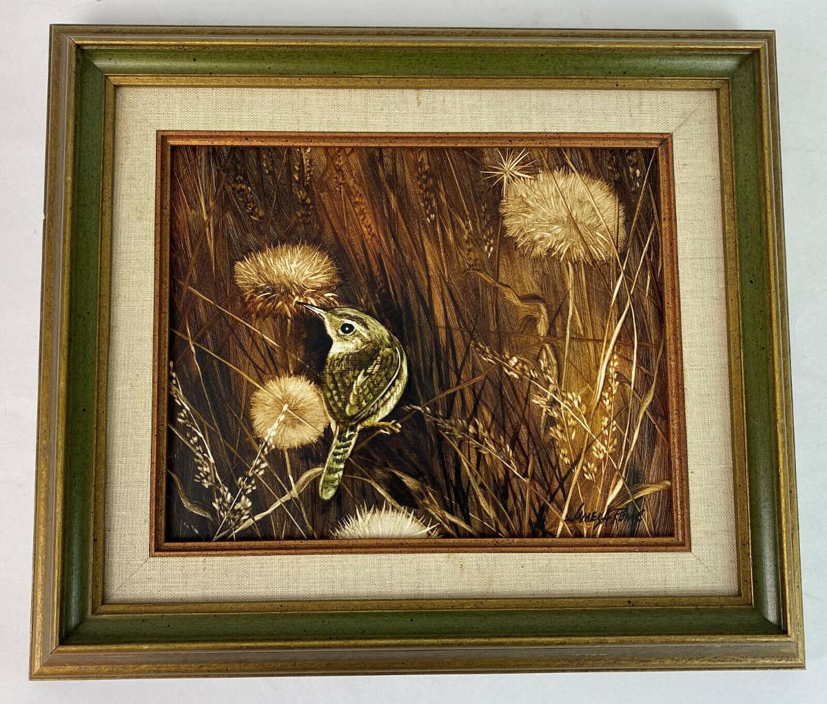 In excellent condition here is a marvelously detailed woodcut of a House Wren titled "BIRDS and SEEDS"...deftly colored...by Arizona artist James A. Rome (American, b. 1936)...Well-framed 14.5 x 12.5"..the image is 9.5 x 7.5"....Signed by the artist...This estate find is offered with no reserve...