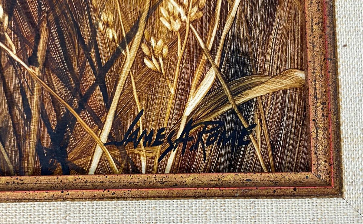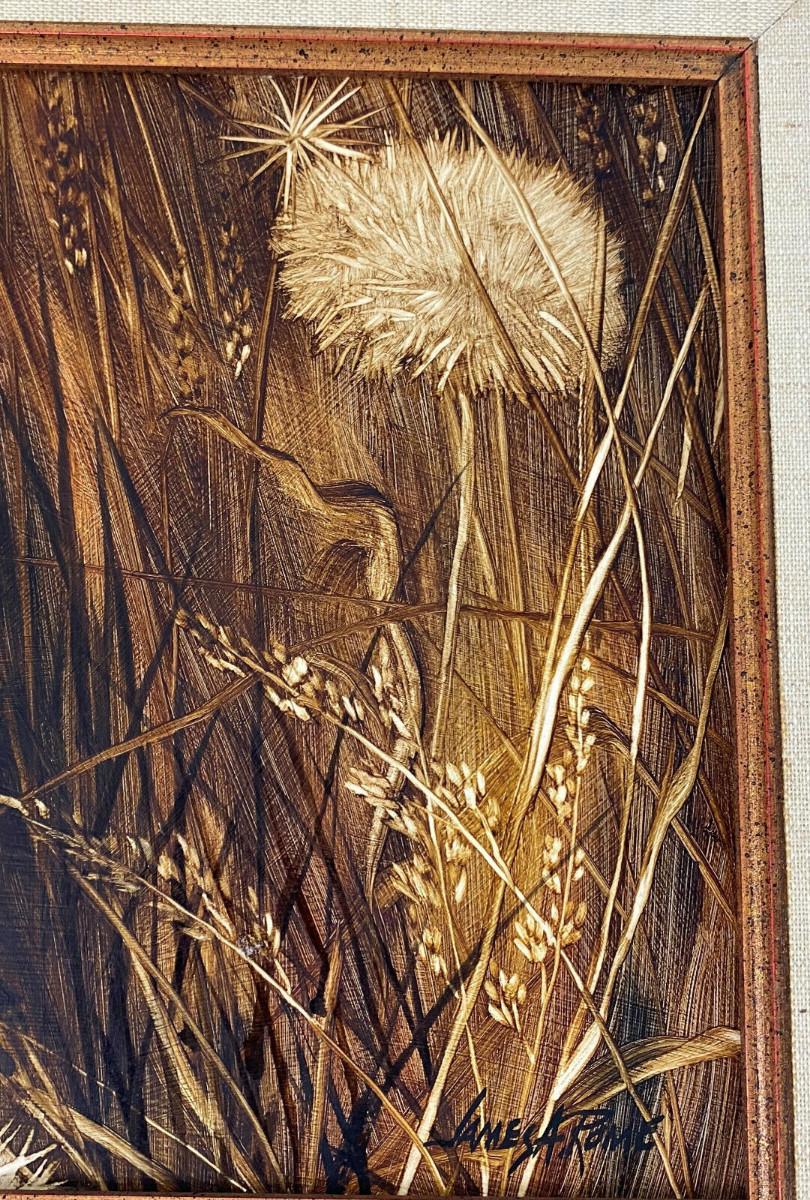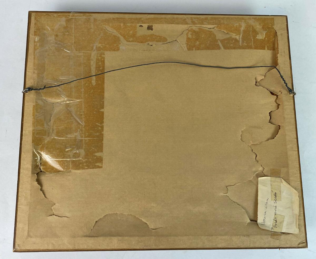 In excellent condition here is a marvelously detailed woodcut of a House Wren titled "BIRDS and SEEDS"...deftly colored...by Arizona artist James A. Rome (American, b. 1936)...Well-framed 14.5 x 12.5"..the image is 9.5 x 7.5"....Signed by the artist...This estate find is offered with no reserve...