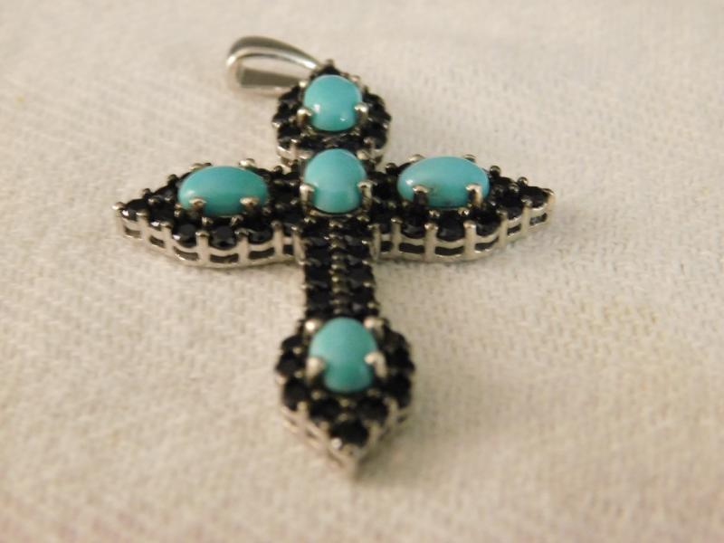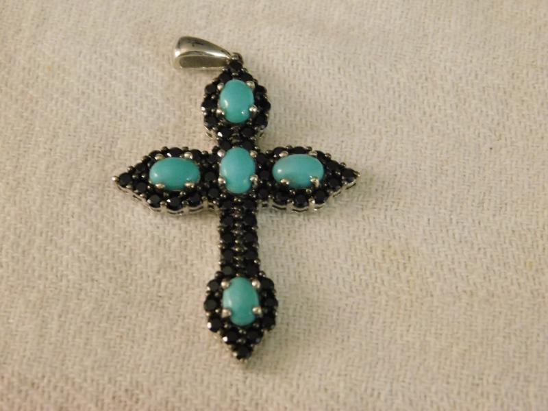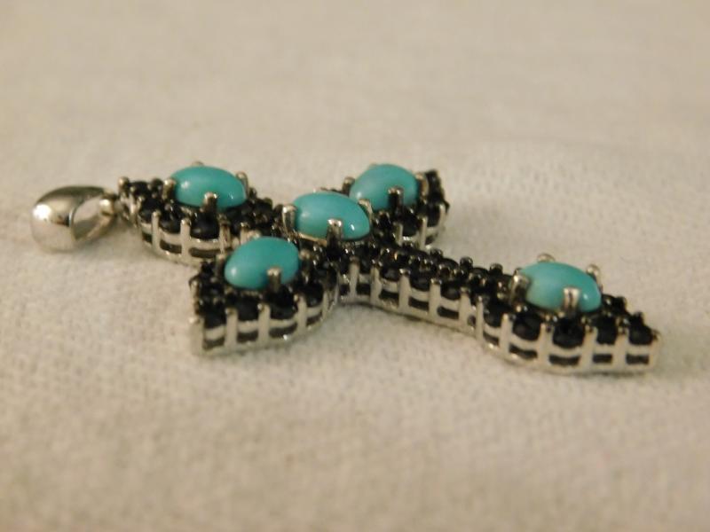 Arizona Sleeping Beauty Torquoise Cross Pendant With Thai Black Spinel 1 1/2" in size. Without chain and set in sterling silver.