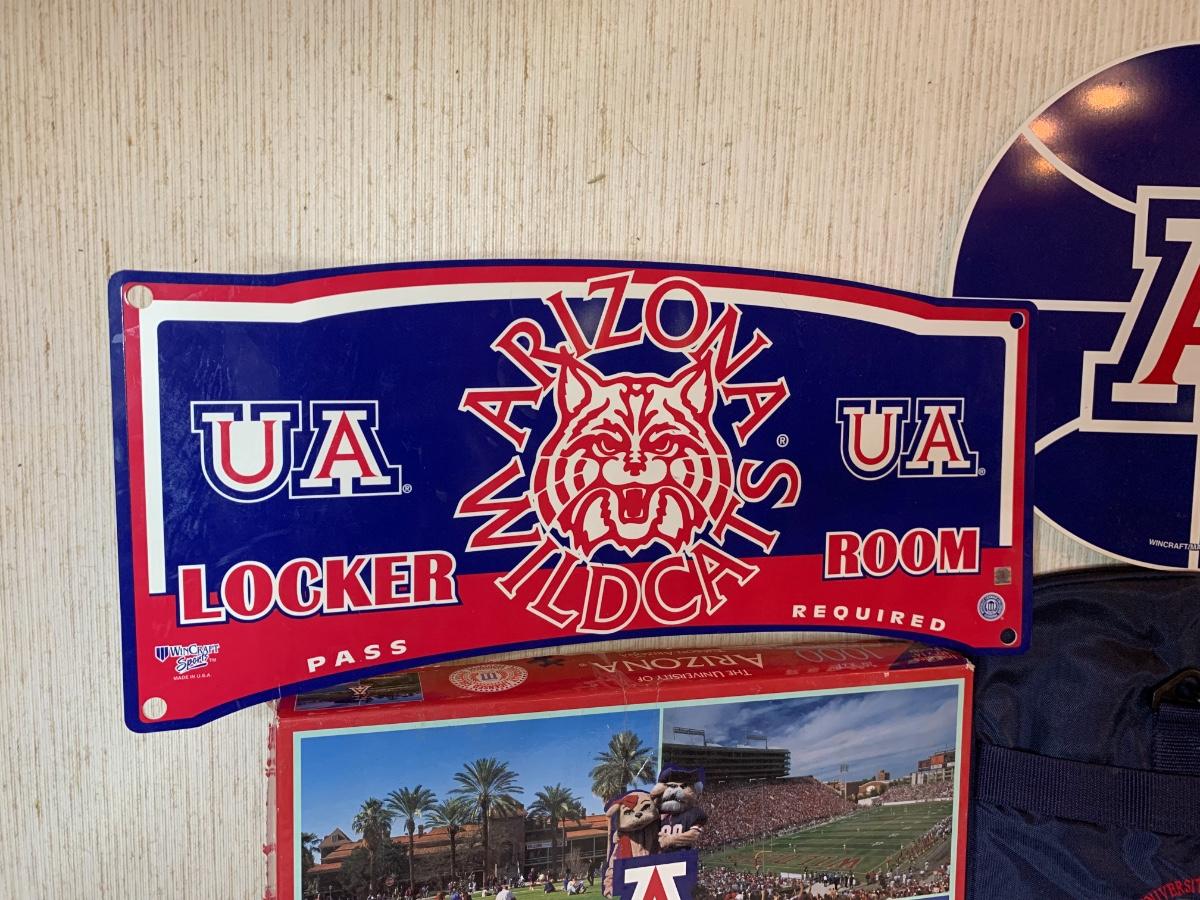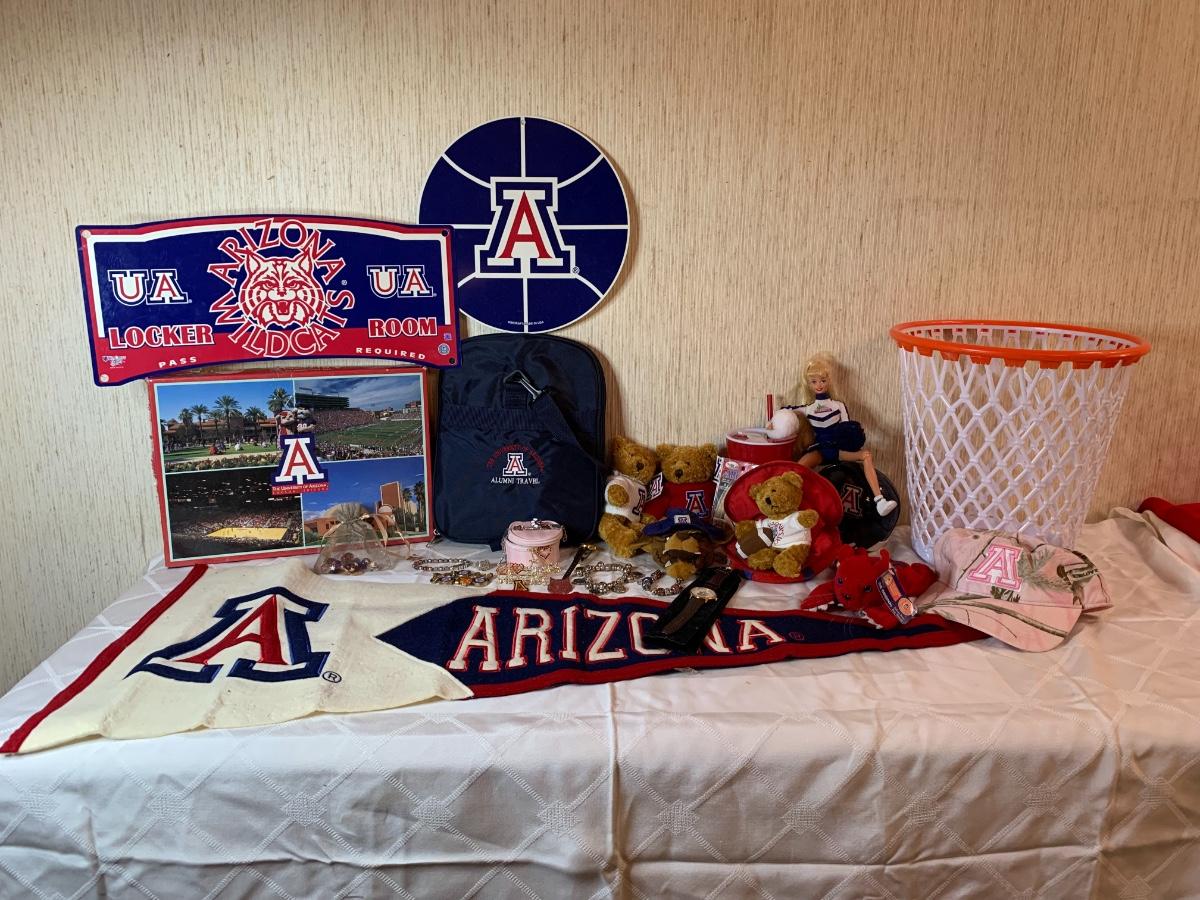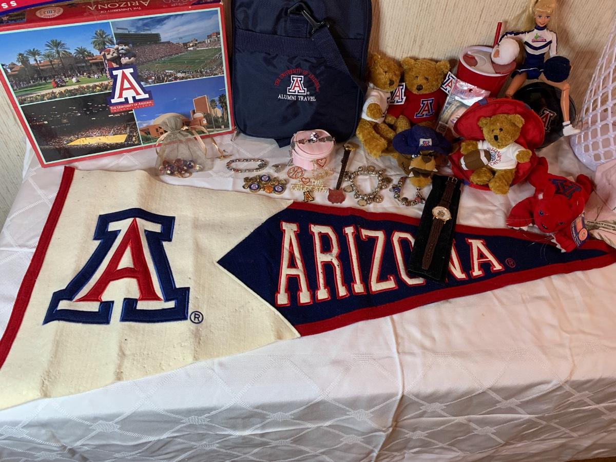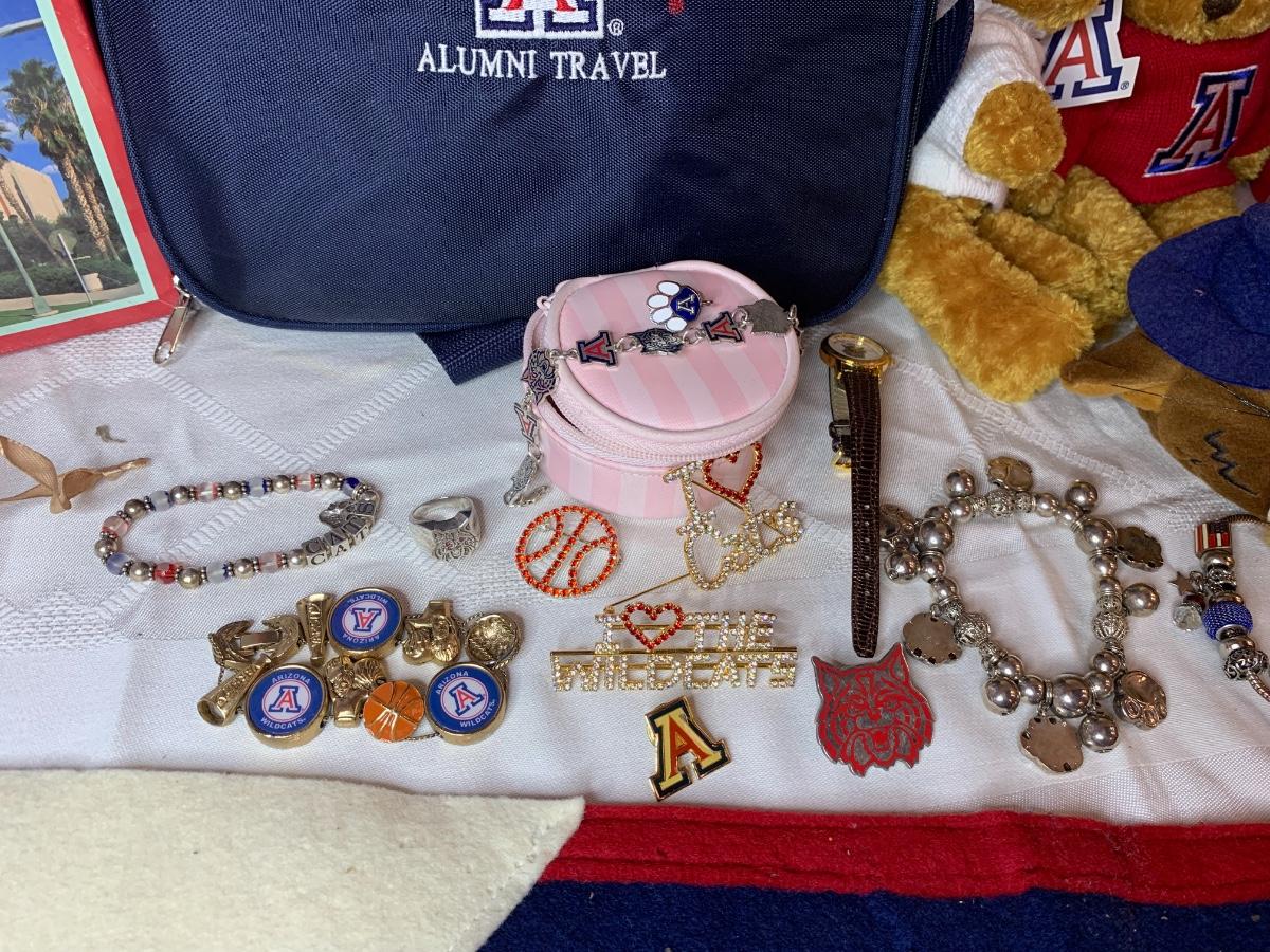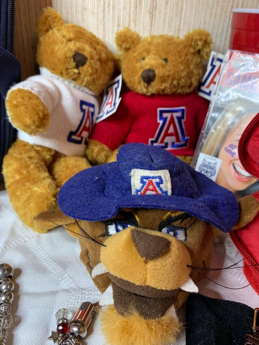 Misc Arizona Wildcats memorabilia including vintage wildcats felt pennant flag, misc wildcat stuffed animals, basketball wastebasket, wildcat small travel bag, wildcats jewelry and more