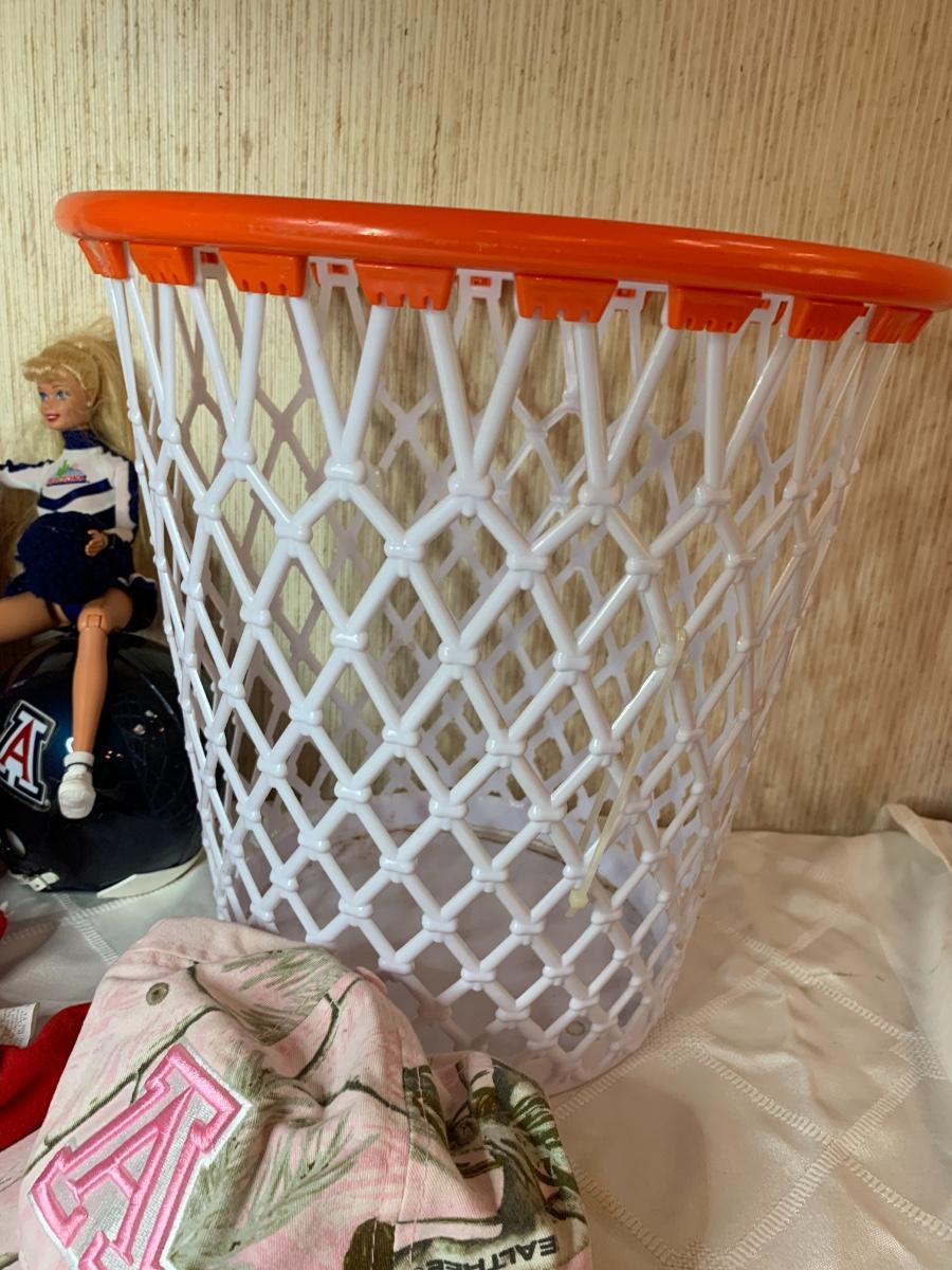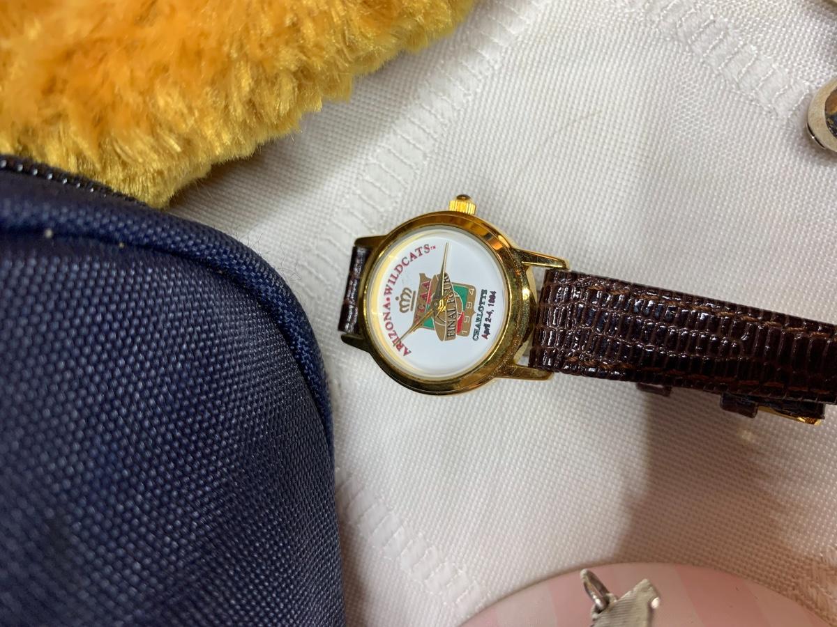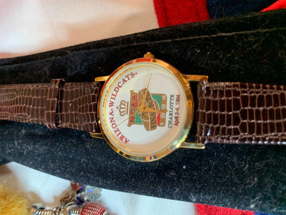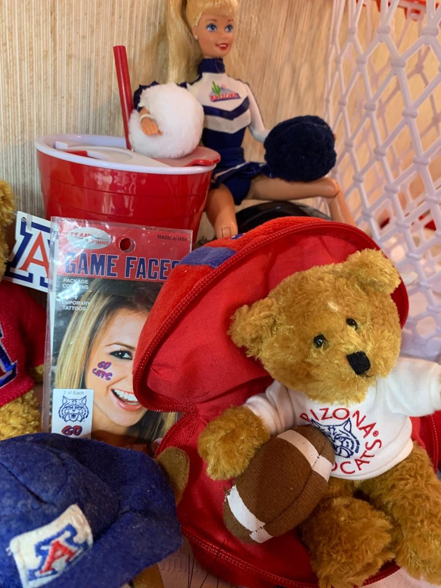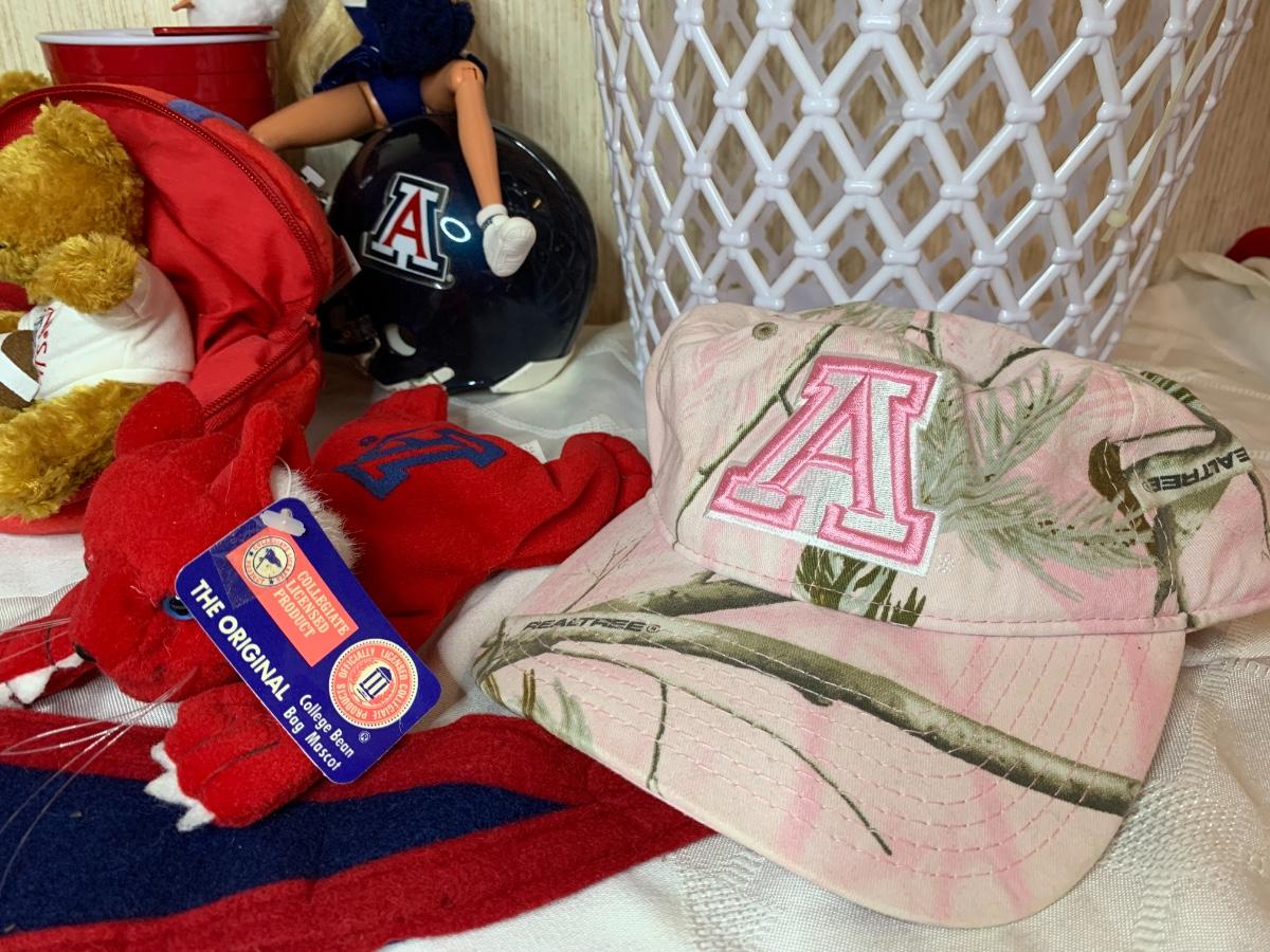 Misc Arizona Wildcats memorabilia including vintage wildcats felt pennant flag, misc wildcat stuffed animals, basketball wastebasket, wildcat small travel bag, wildcats jewelry and more