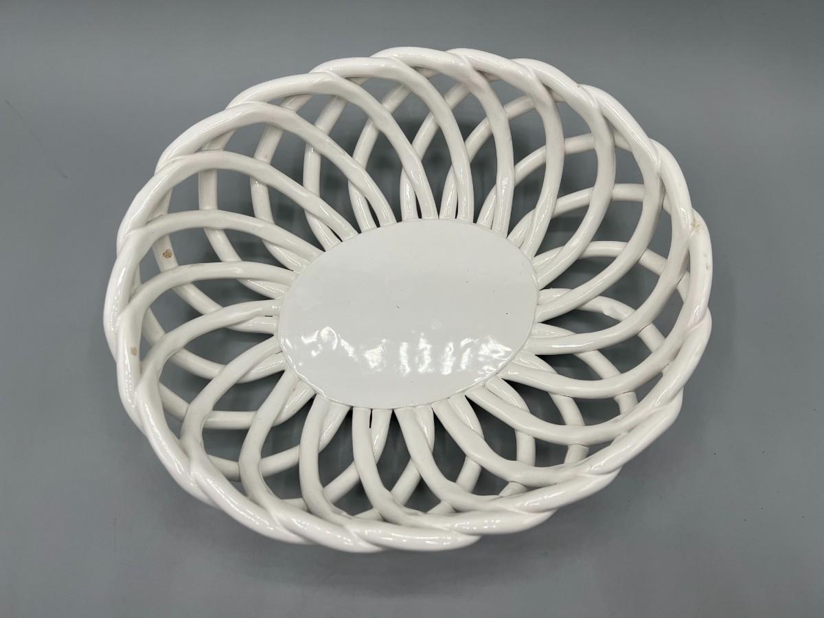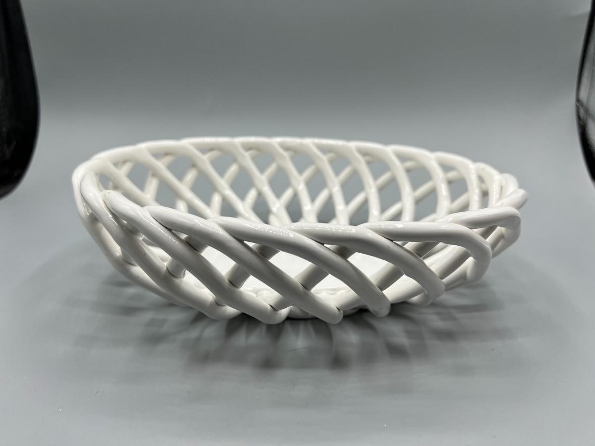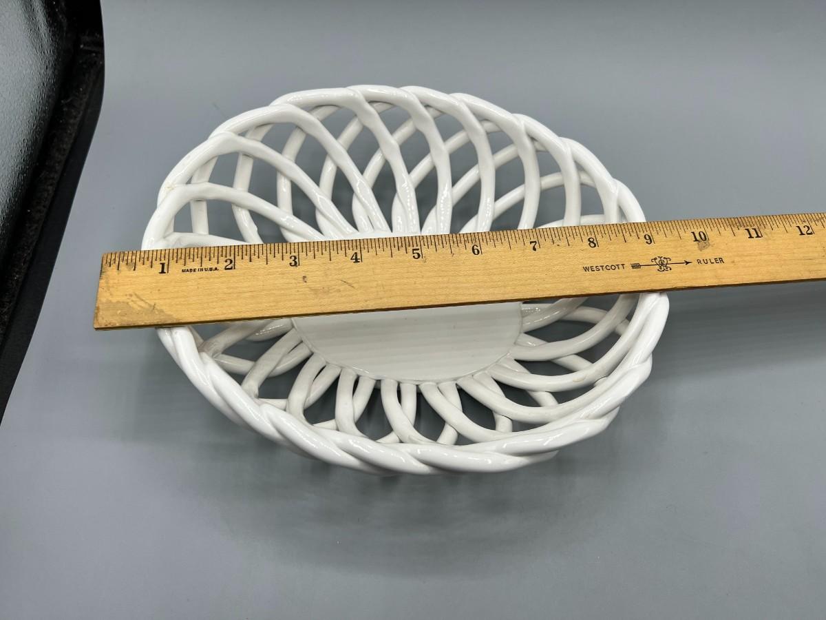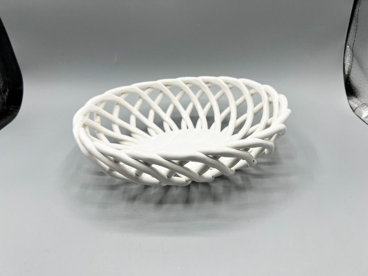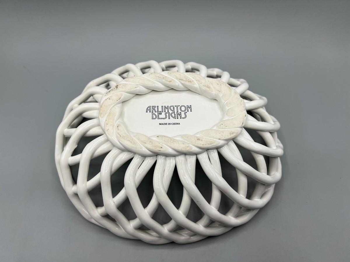 White basket style ceramic serving bowl from Arlington Designs. About 8" size. Displays nice.