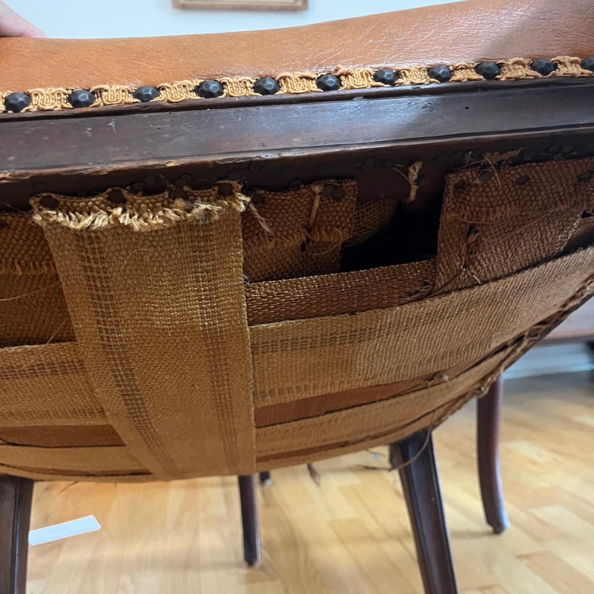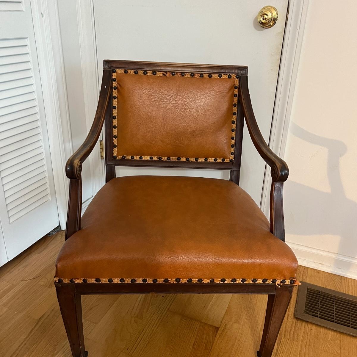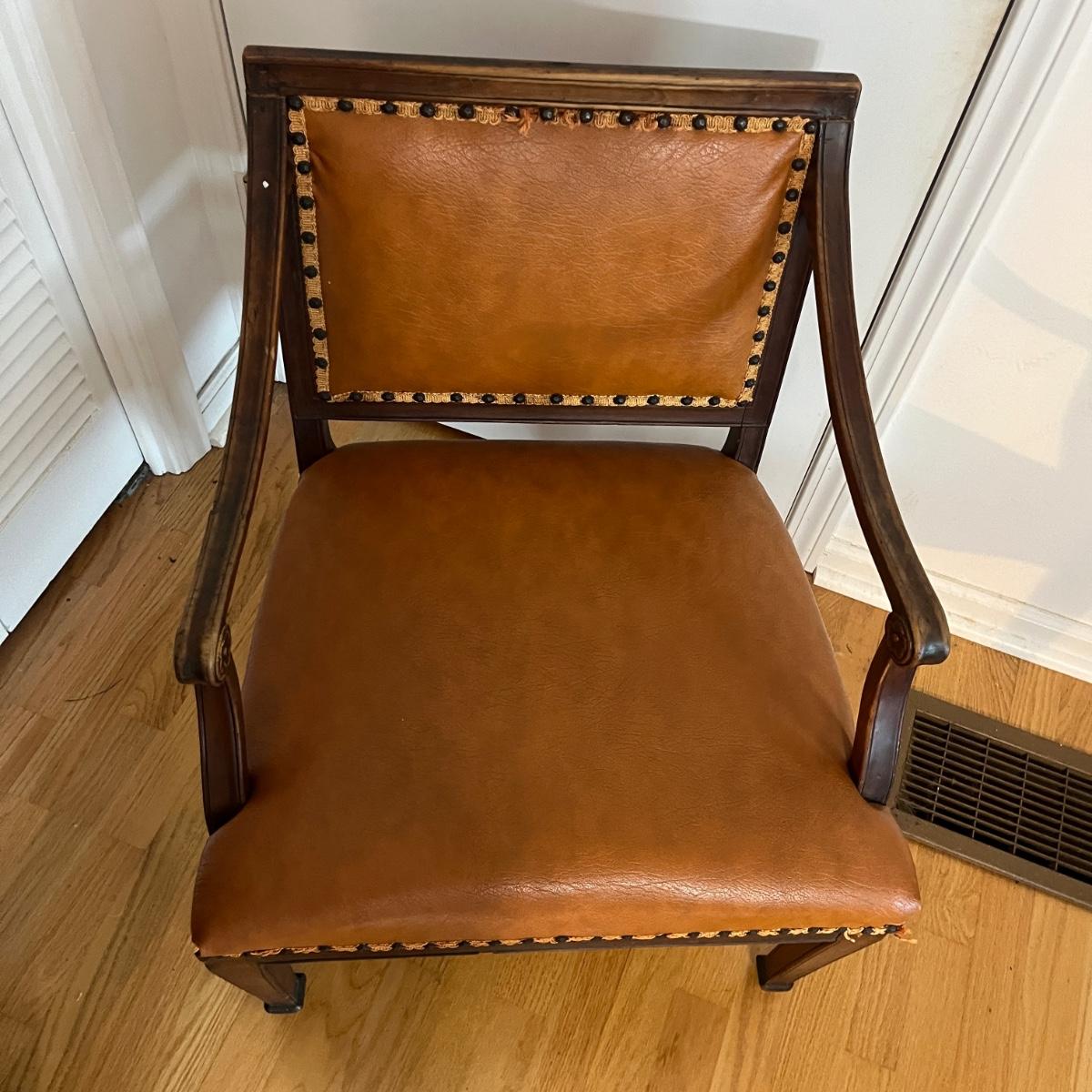 Lot includes a Wooden framed arm chair with nail head accents and a padded faux leather seat and back. Chair measures 23” x 21” x 31” with a 16” seat height.