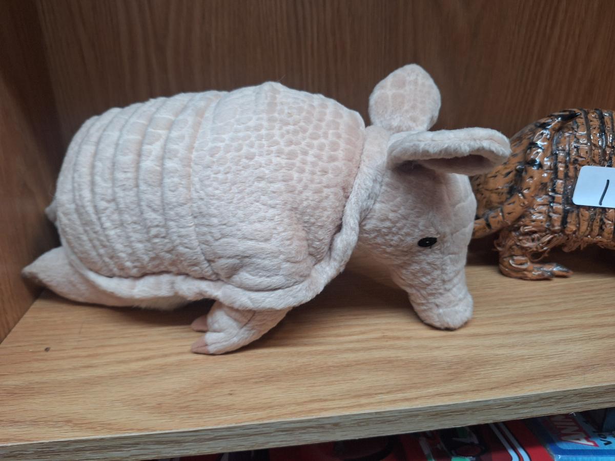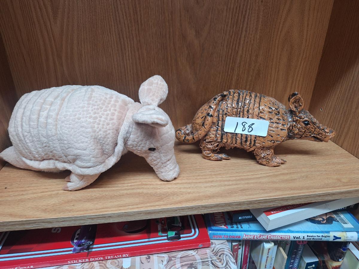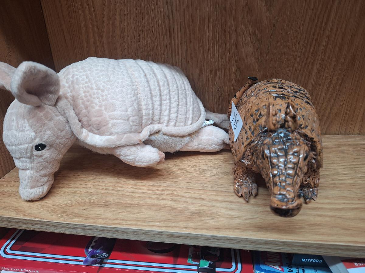a plush and some kind of pottery armadillo. - the pottery one is signed Alvin Cudjo on the bottom