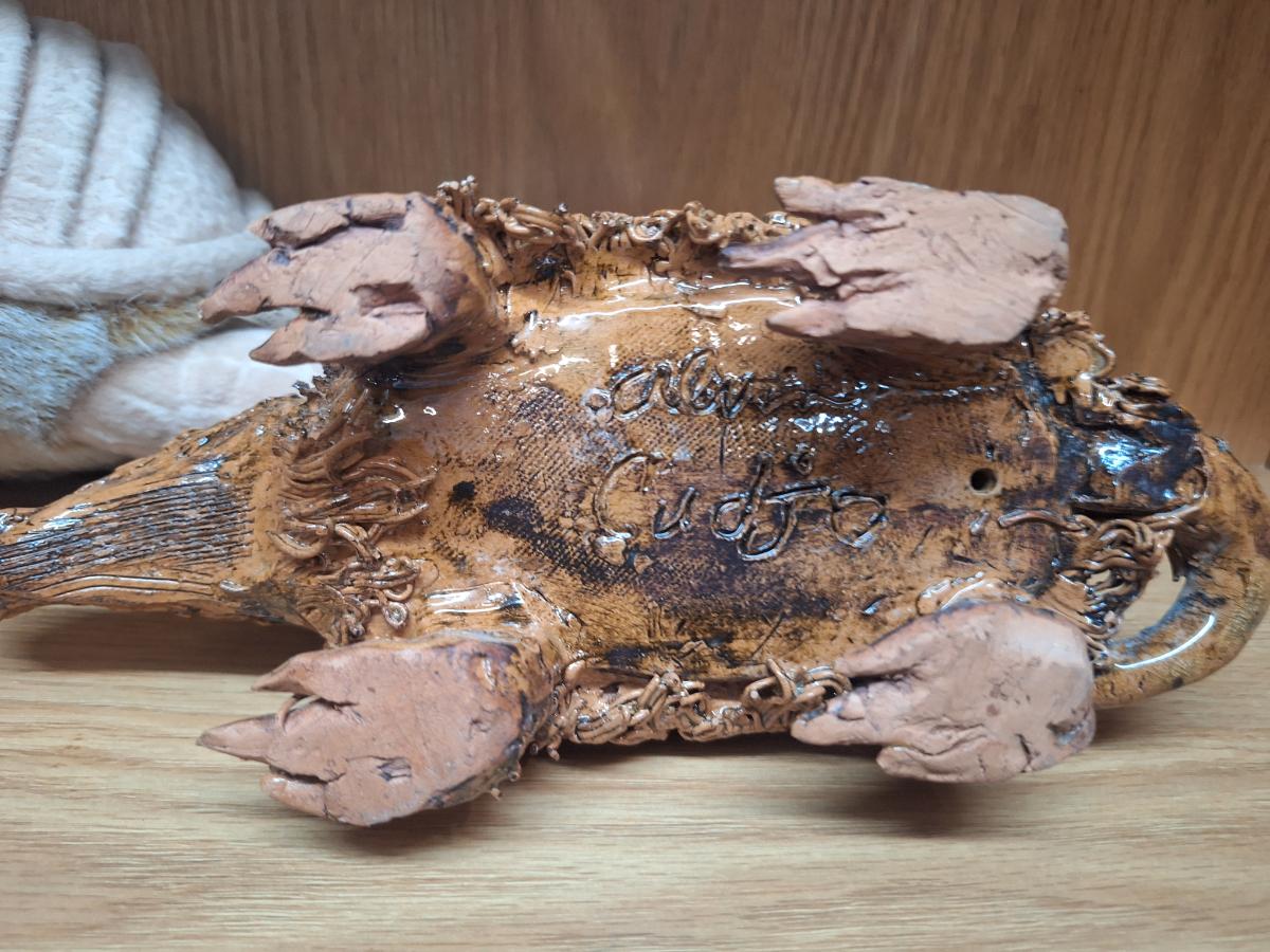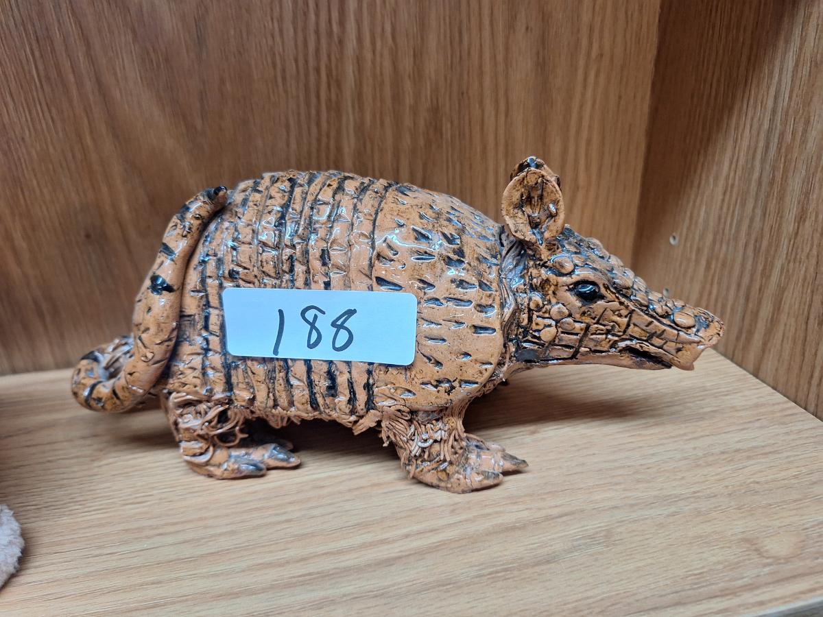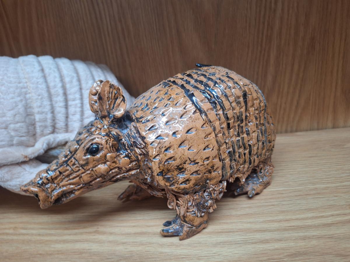 a plush and some kind of pottery armadillo. - the pottery one is signed Alvin Cudjo on the bottom