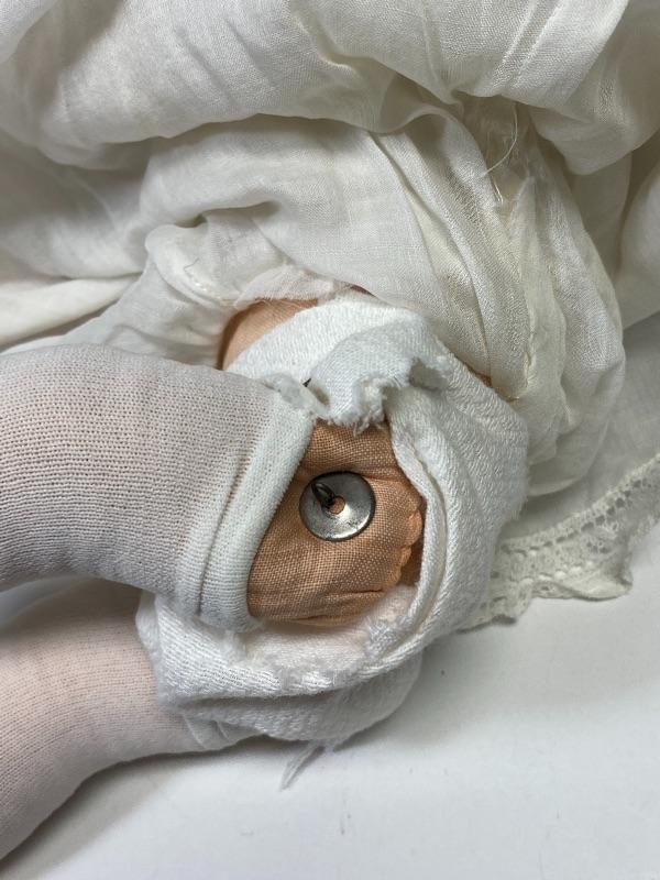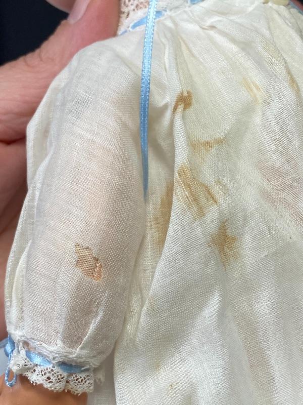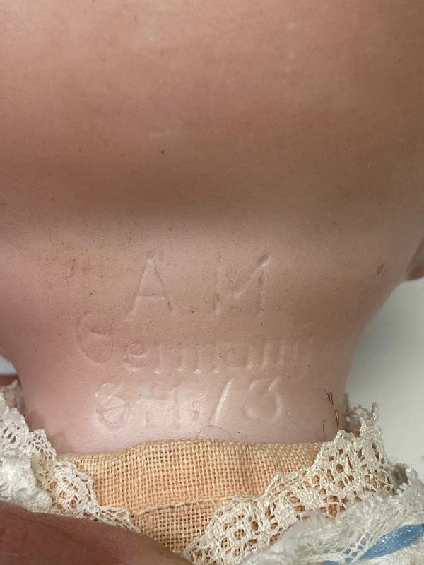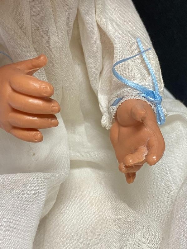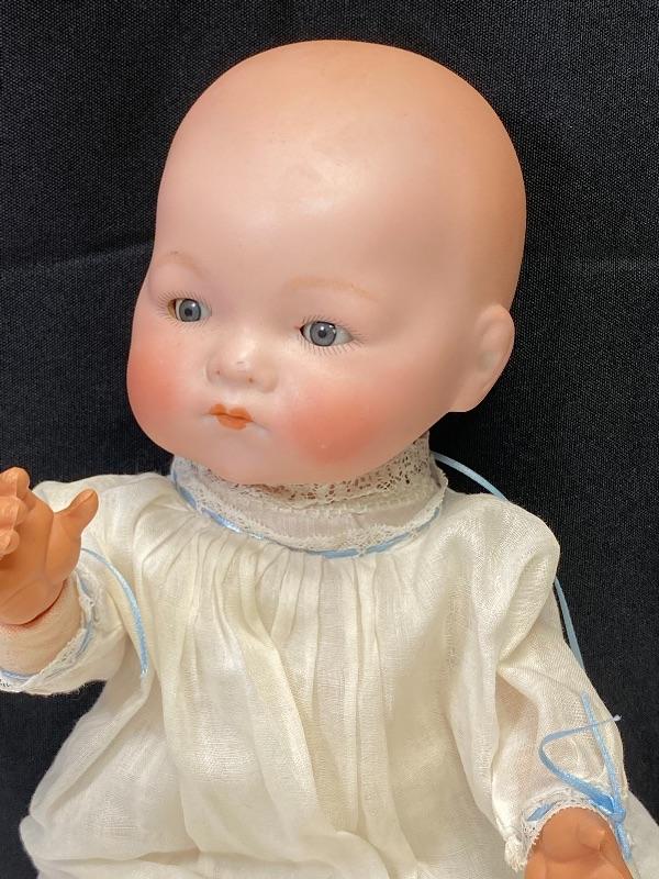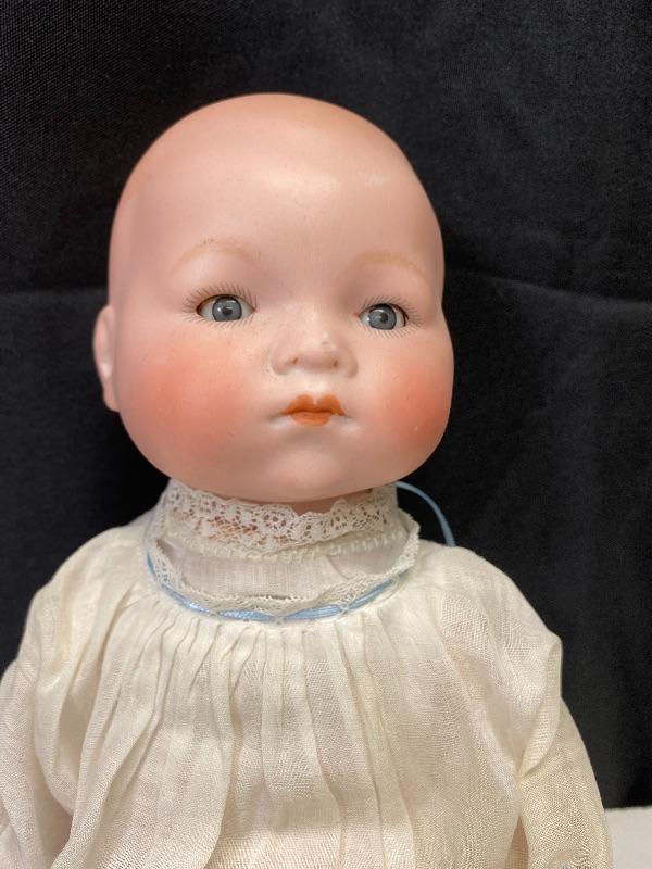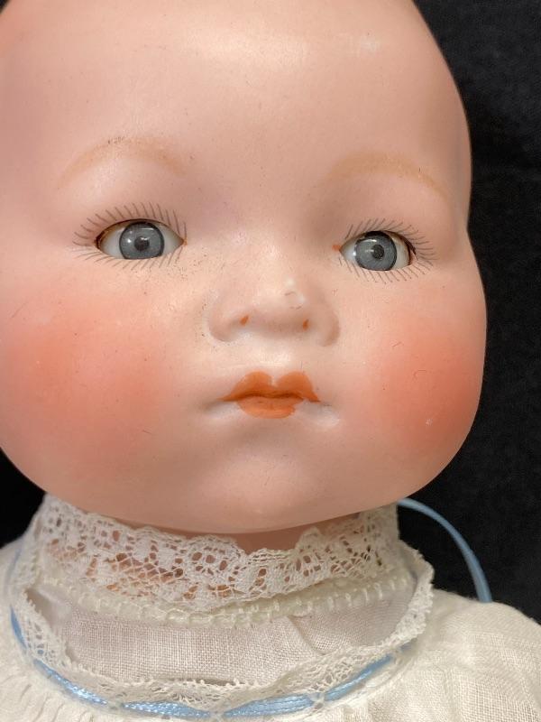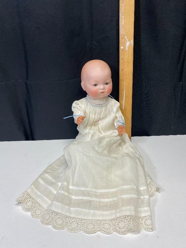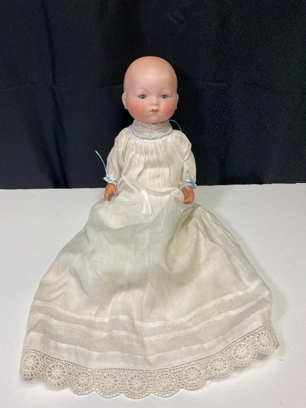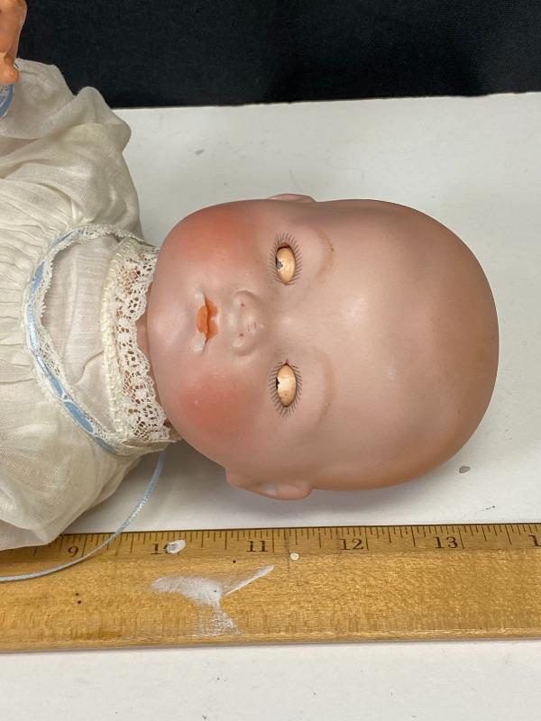 Vintage Armand Marseille sleepy eye baby doll. Bisque head, painted features, blue sleep eyes. Body is cloth with jointed shoulders and hips. Hands are celluloid plastic. Back of head is marked AM Germany 341/3. Wearing long gown and bonnet.
