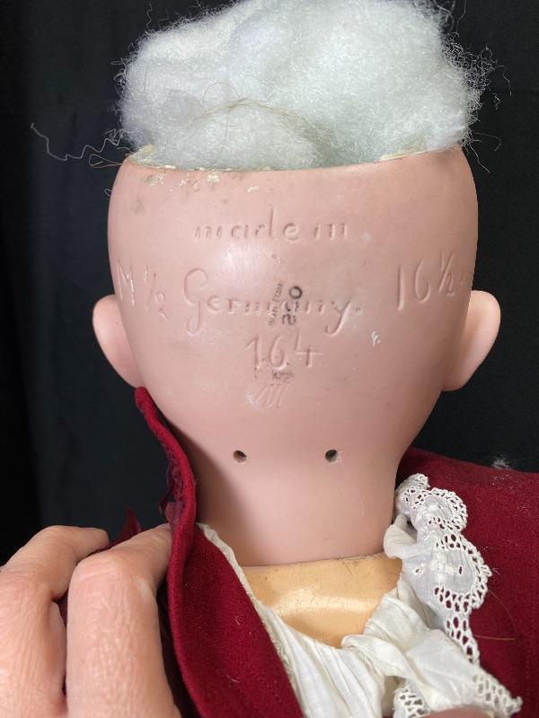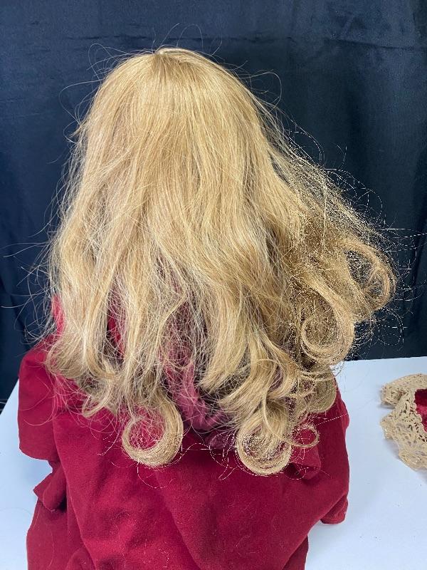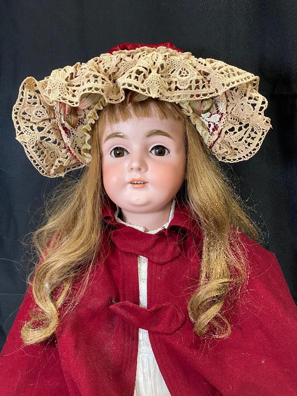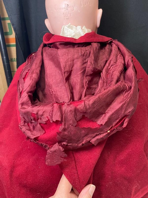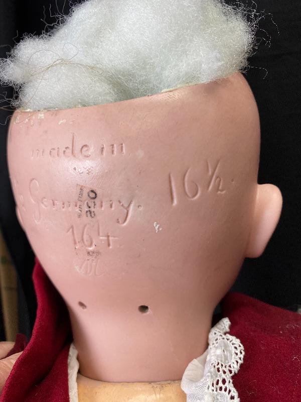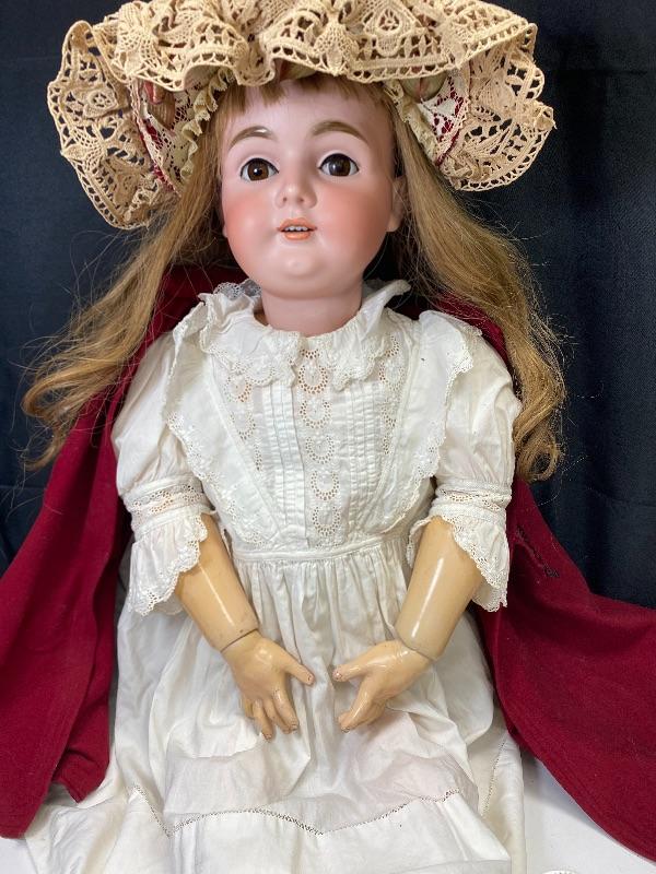 Vintage Armand Marseille 30" doll. Brown fixed eyes, real hair wig in an ash blonde. New cast head reads "Made in Germany M1/2 16 1/2 164" on the neck. Joints are tight. Looks to be a vintage composite body with repro head. Wearing red cape, lining is falling apart.