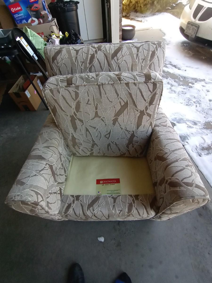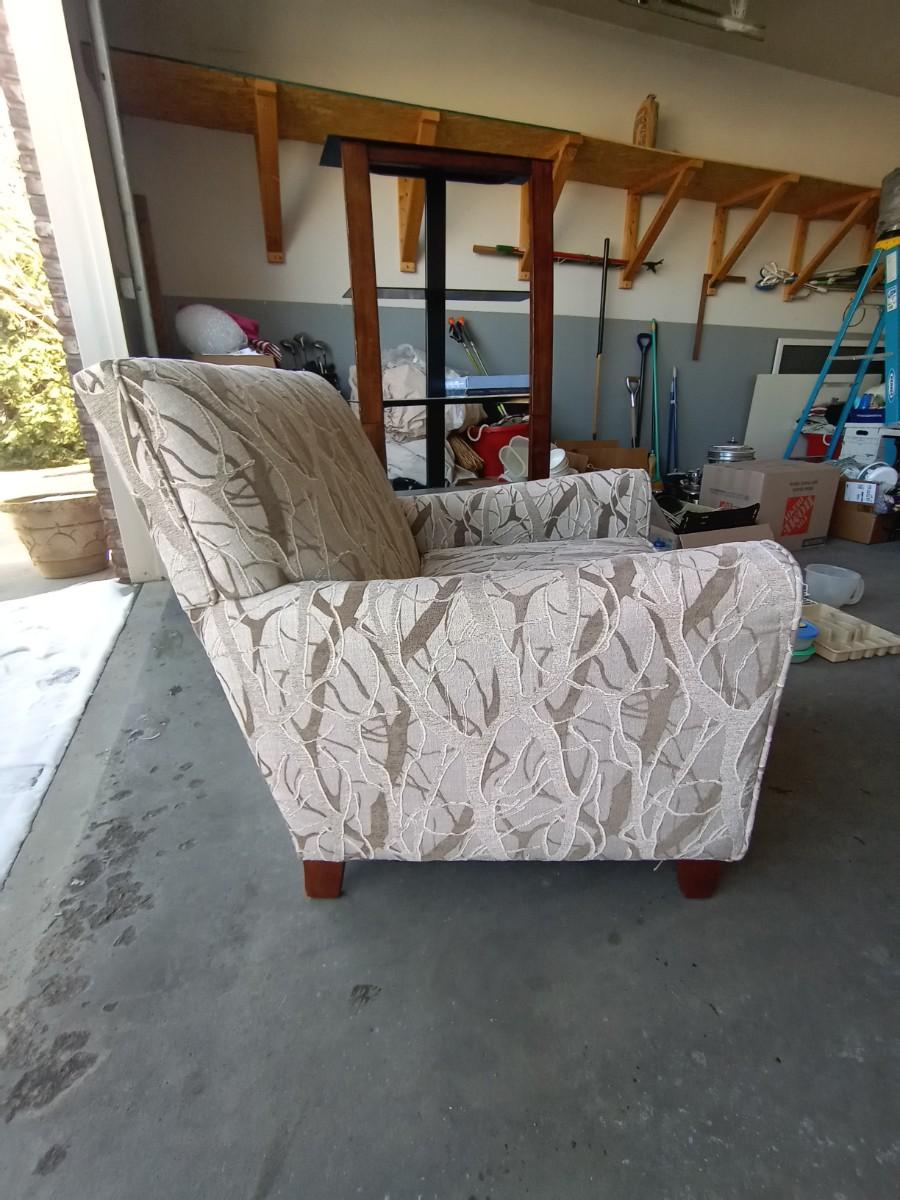 VERY NICE TAN AND CREAM UPHOLSTERED ARM CHAIR