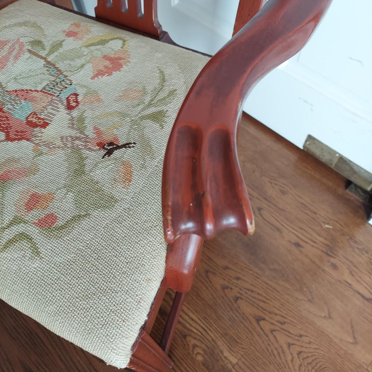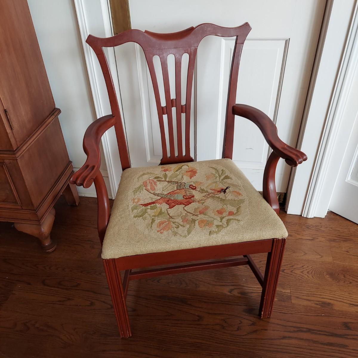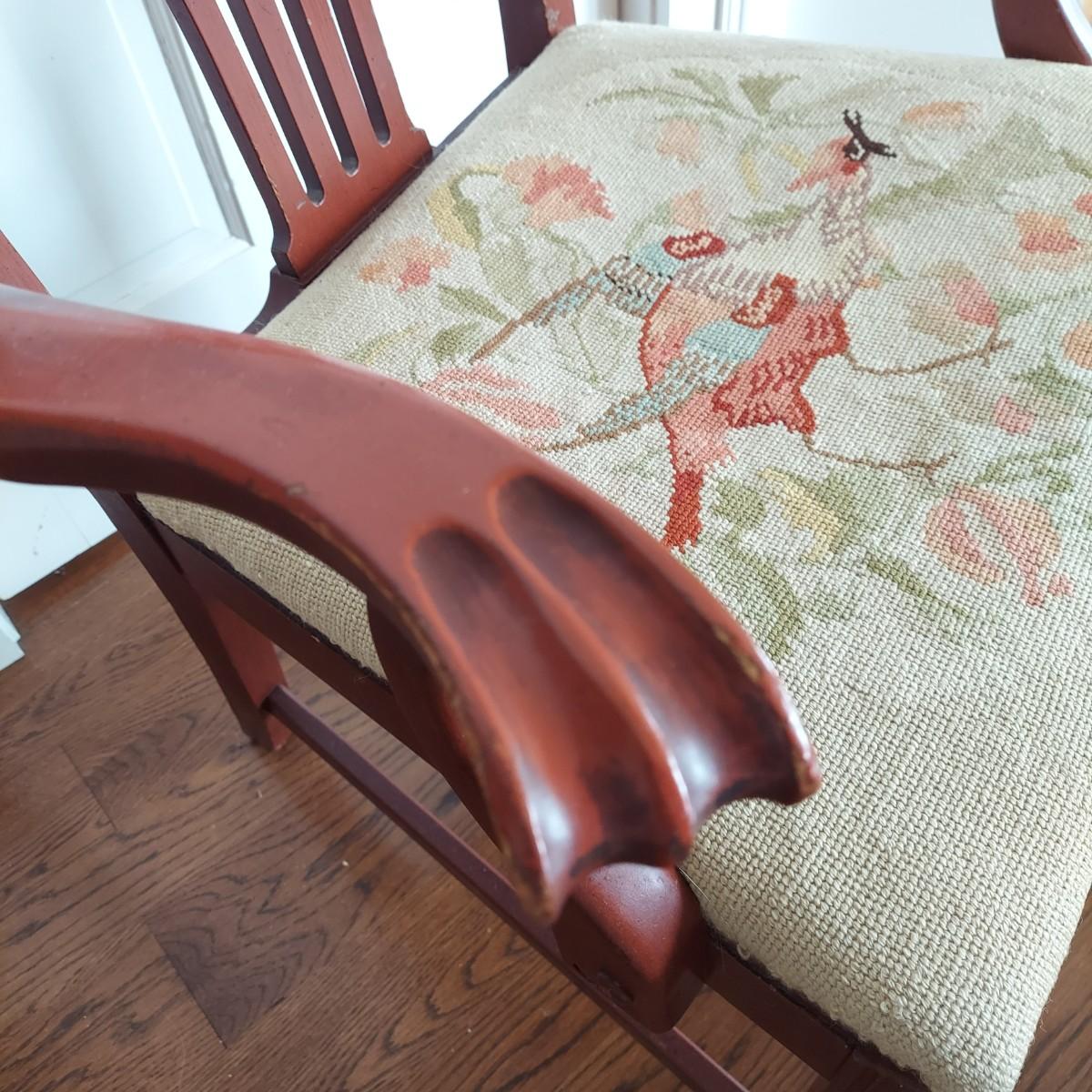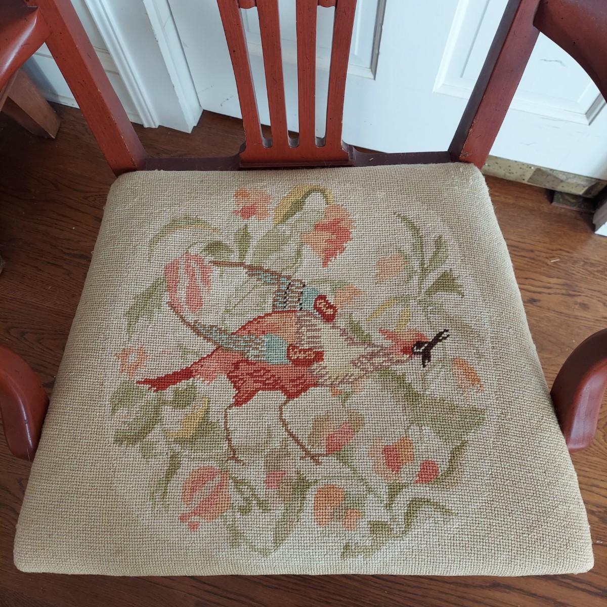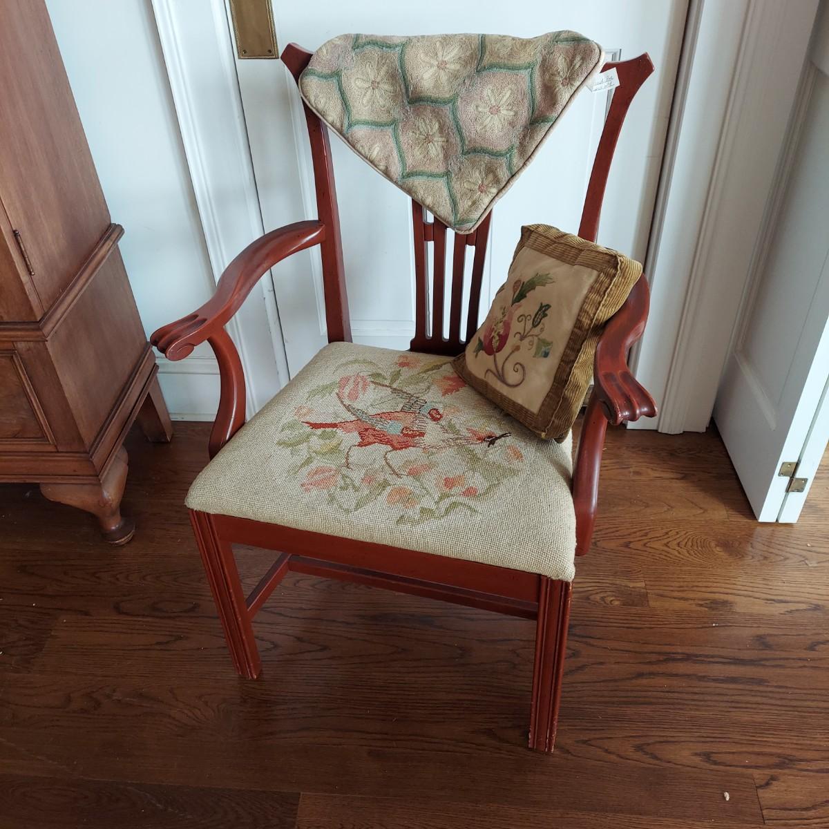 Lot includes a wooden chair with a needlepoint upholstered seat cushion. Plus an embroidered pillow and a pillow cover. Per the handwritten tag, the pillow cover is 100+ years old. The chair measures 27” x 22” x 36"H w/ an 18"H seat height. Please see photos for details. Local Pickup Only