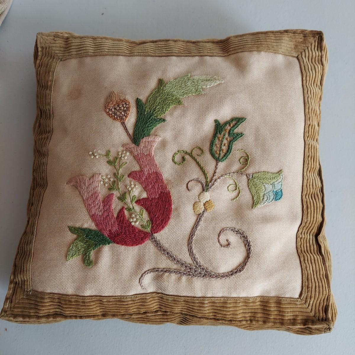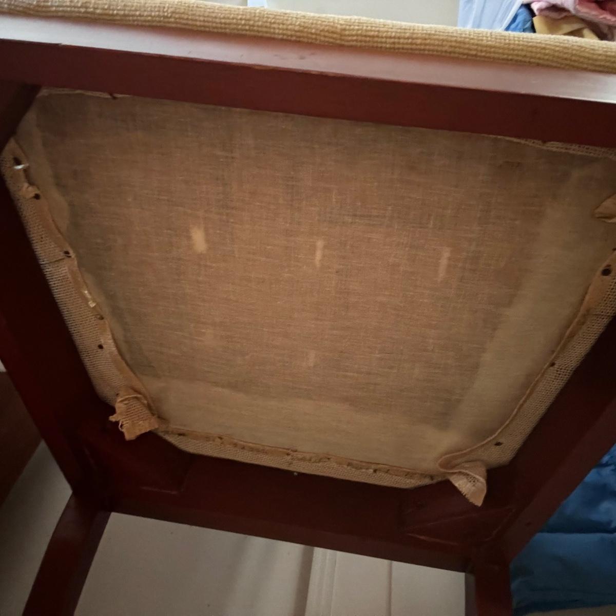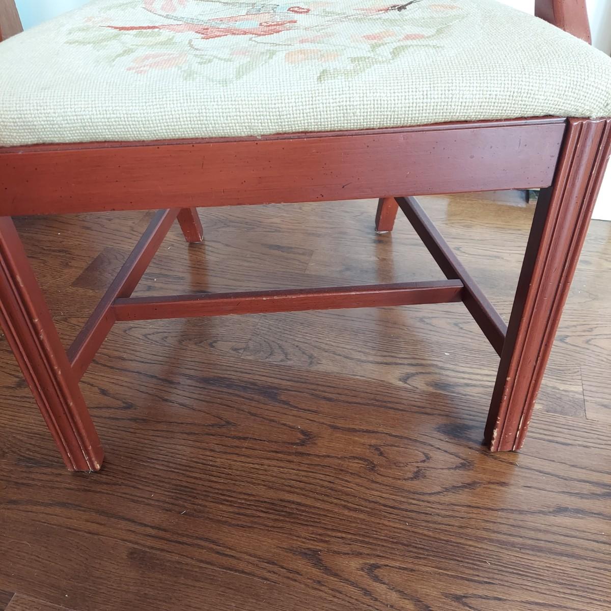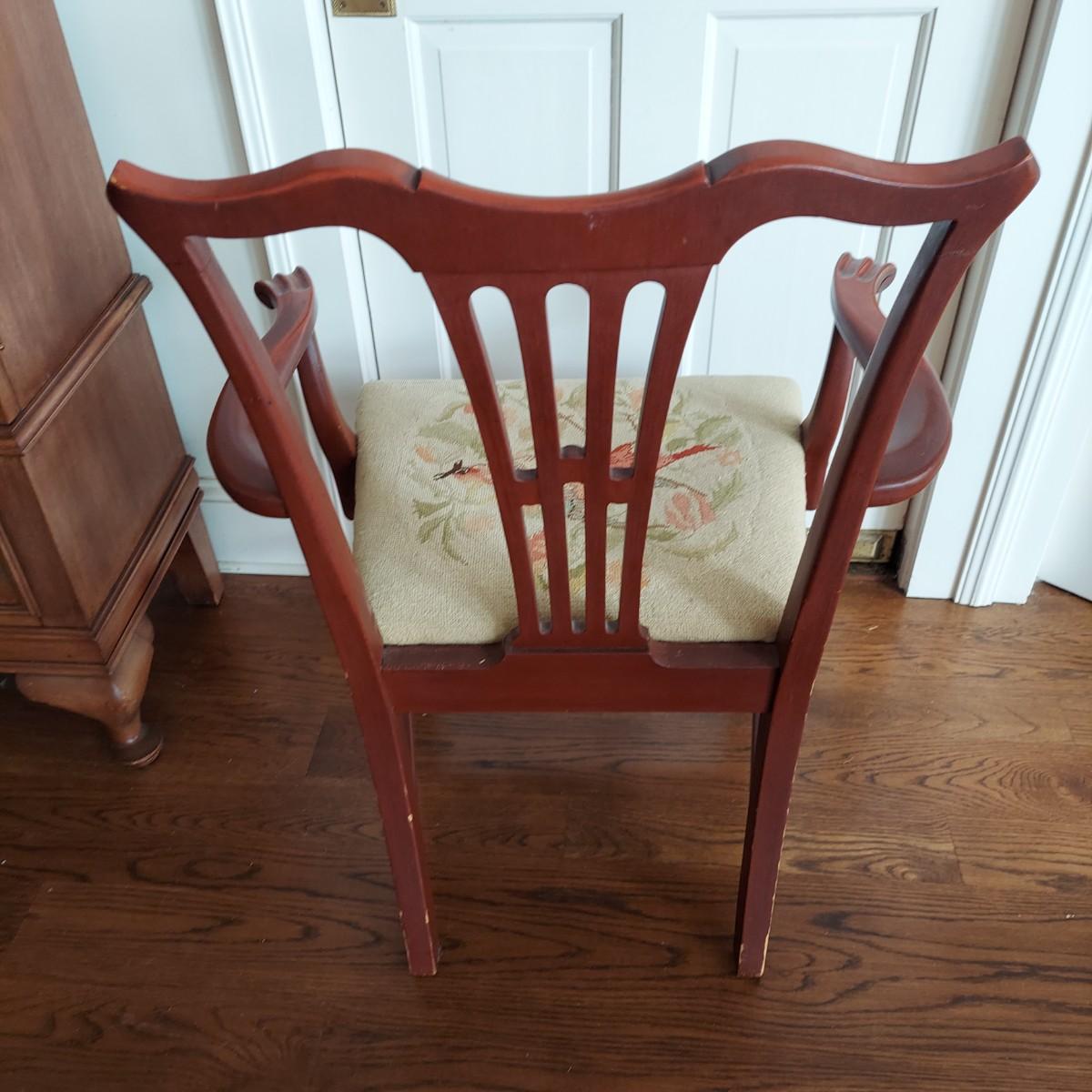 Lot includes a wooden chair with a needlepoint upholstered seat cushion. Plus an embroidered pillow and a pillow cover. Per the handwritten tag, the pillow cover is 100+ years old. The chair measures 27” x 22” x 36"H w/ an 18"H seat height. Please see photos for details. Local Pickup Only