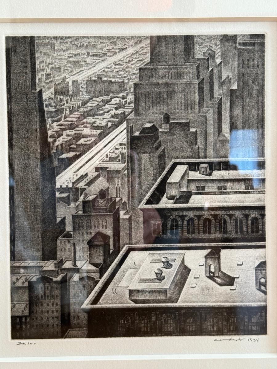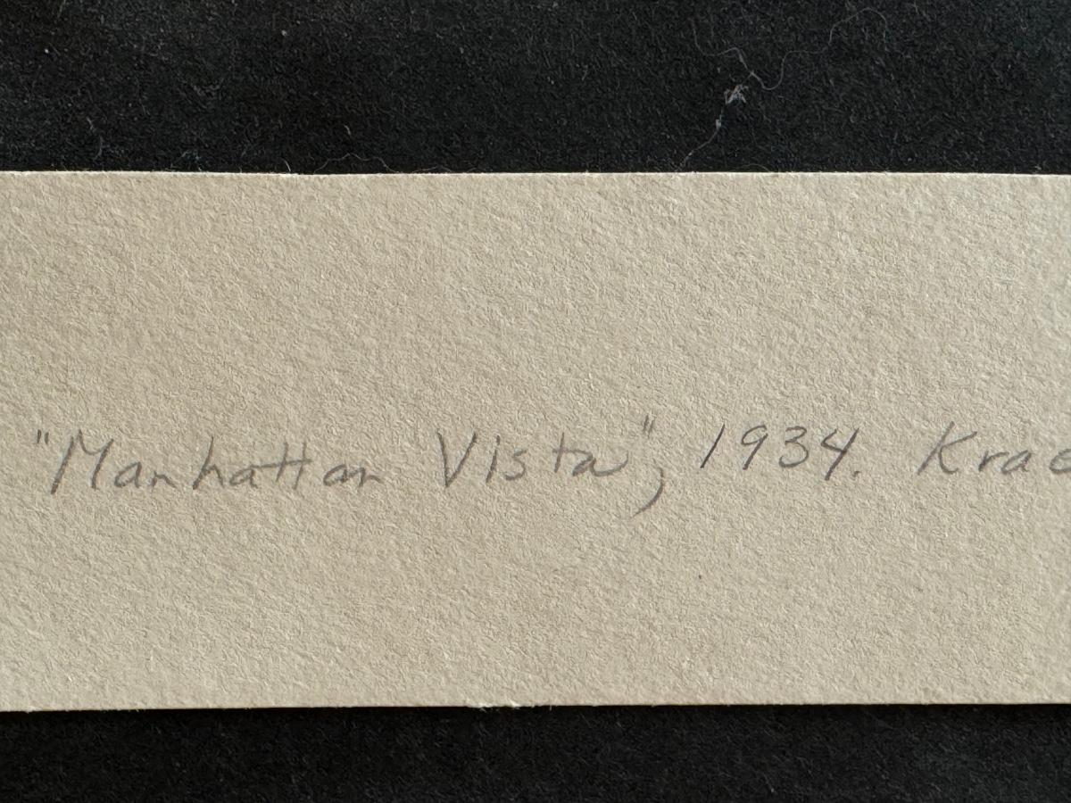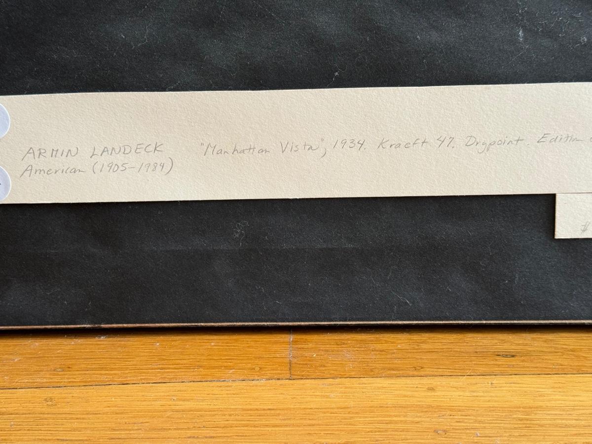 Armin Landeck, Manhattan Vista, 1934 Kraeft 47. Drypoint on wove paper, full margins, edition 100, signed, dated and annotated with pencil and the printer’s blind stamp .