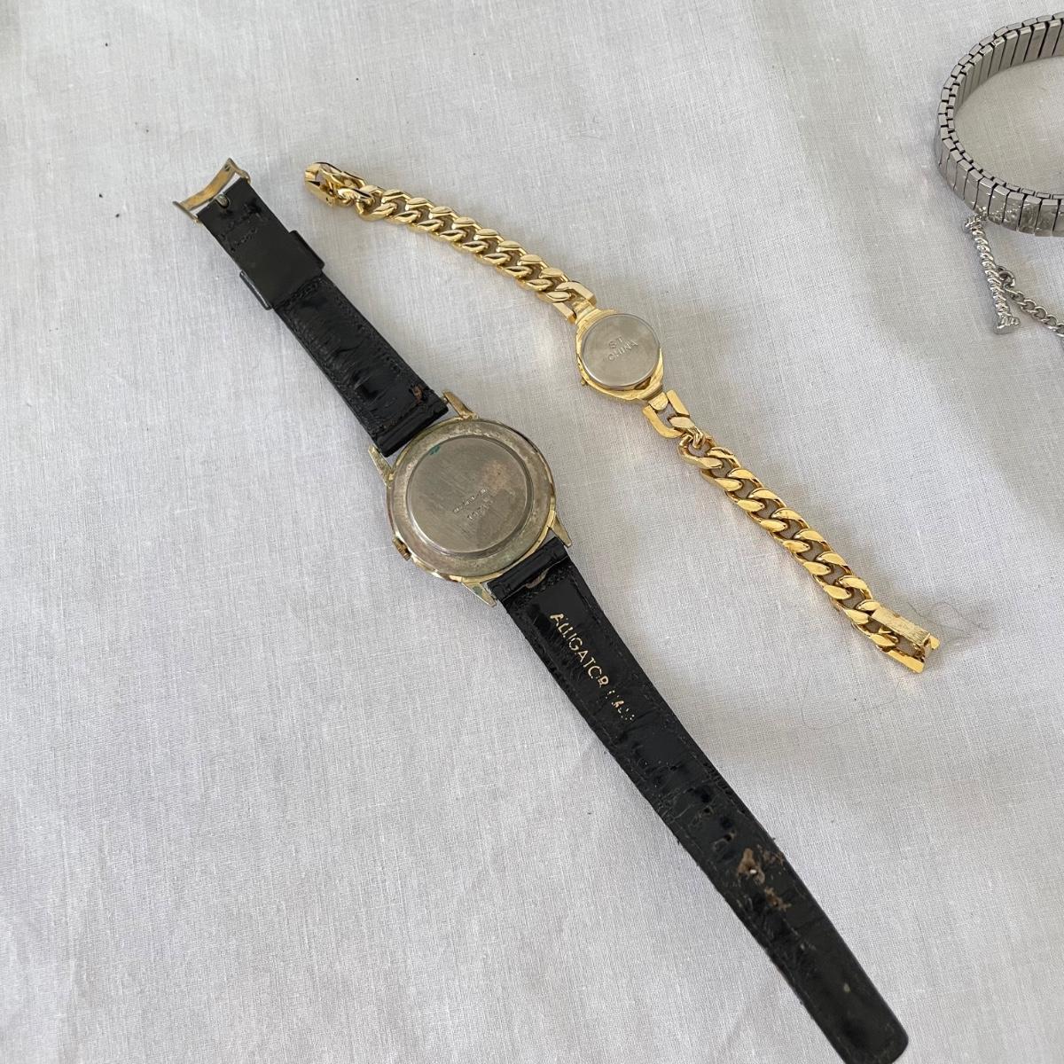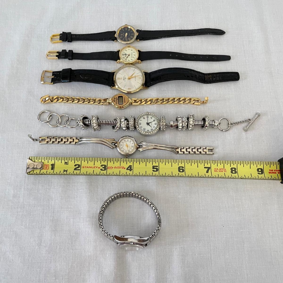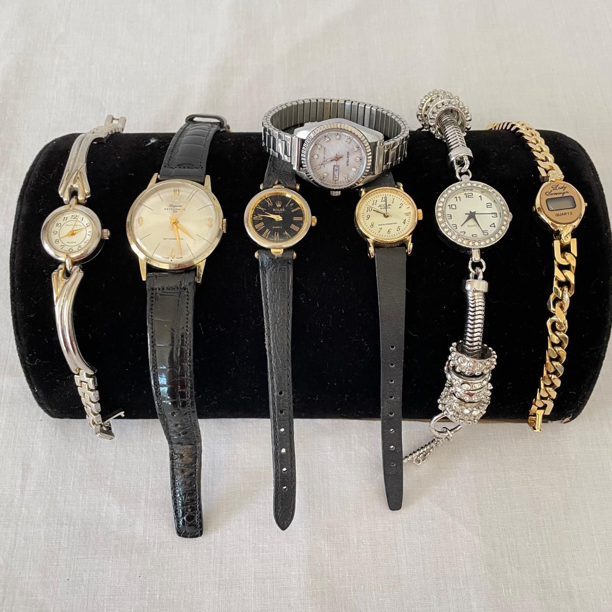 Seven watches varying from elegant to everyday styles. Brands include Armitron, Jaclyn Smith, Linguine and even a Rolex! We do not think the Rolex is genuine. Two have genuine leather markings, the third soft band is stamped Alligator. An unbranded Quartz watch has ten charms. No watches were tested, we believe they need new batteries. See images. Shipping available. All sales are final. No returns or refunds. Please bid accordingly.