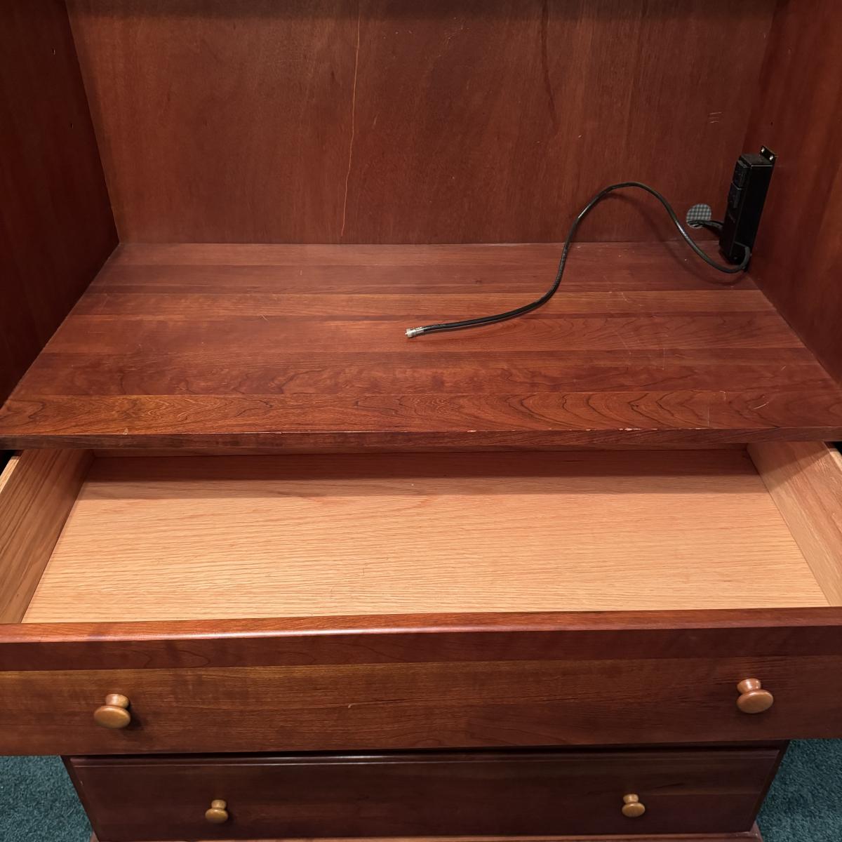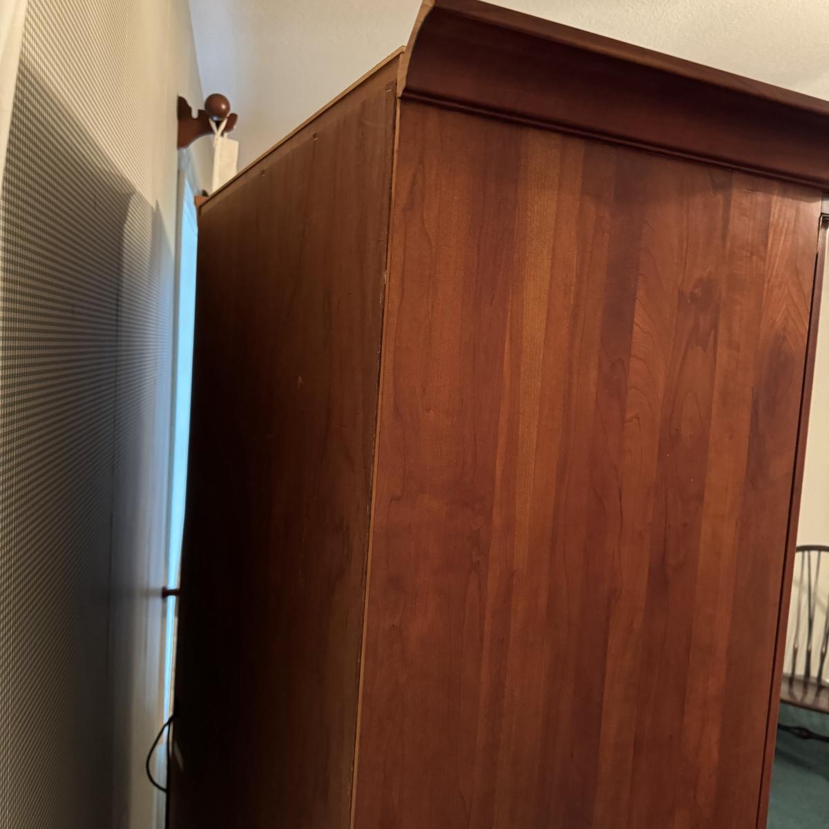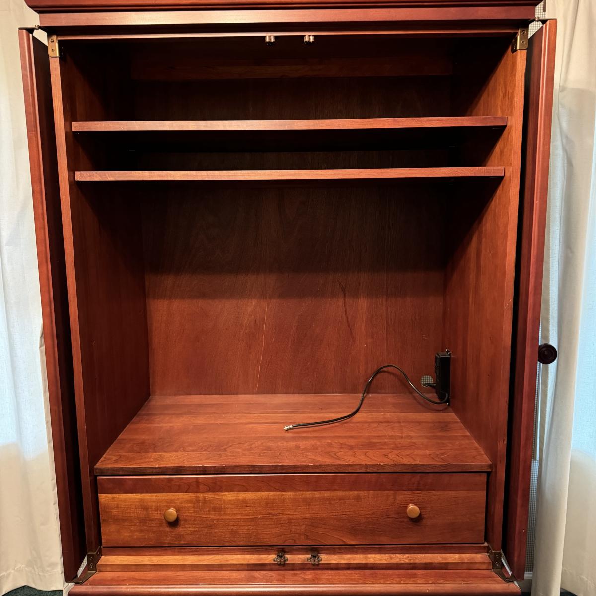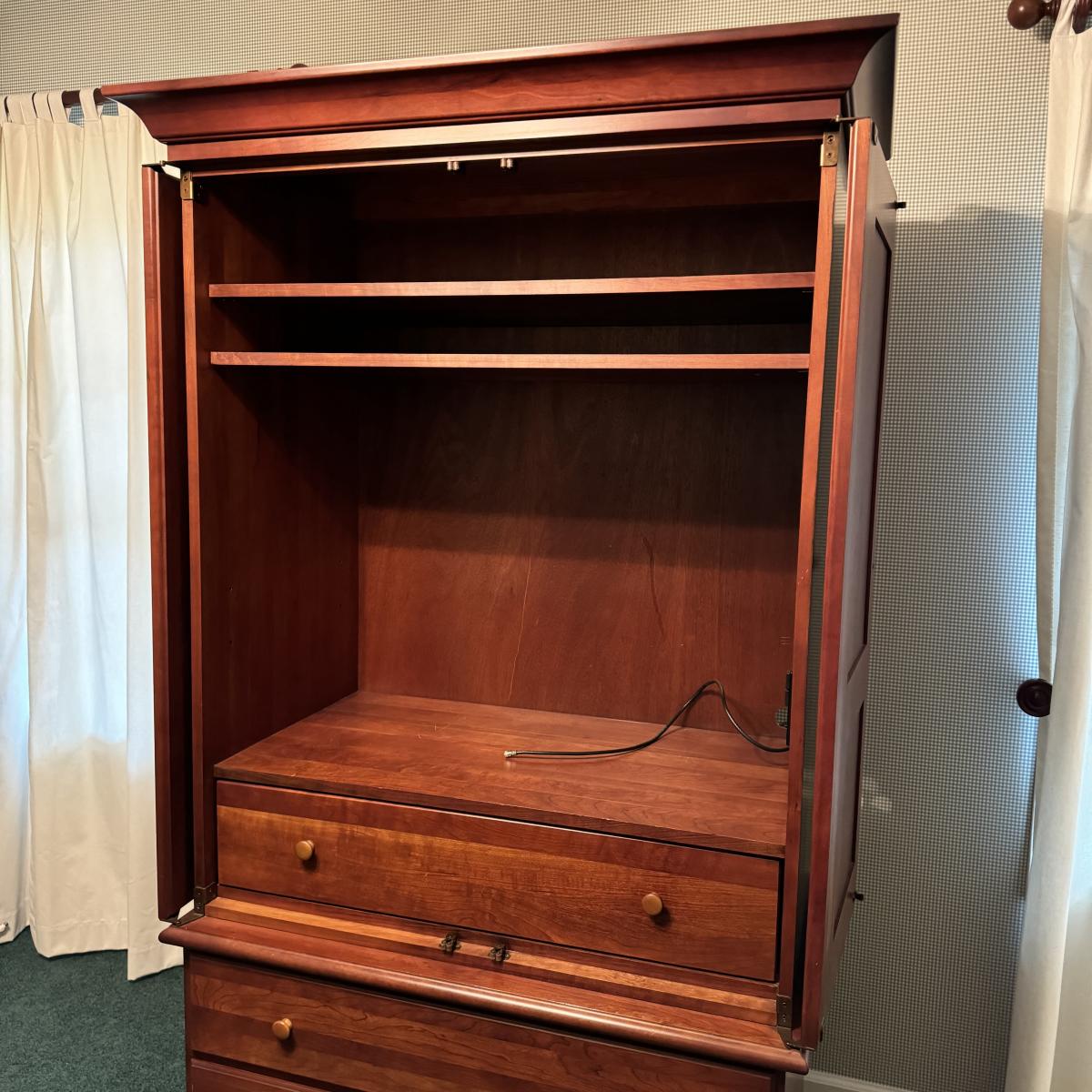Wooden Armoire can be used as wardrobe or for TV. Has attached plug and hole for electronics and adjustable shelving. Also has three dovetailed drawers, one of which is behind the armoire doors when closed. The doors lay flat on sides when open. Measures 42” x 24” x 73” H. Local pick up only. Winning bidder must bring assistance to help move and load this item due to its weight and/or size. It will need to be moved up a flight of stairs.