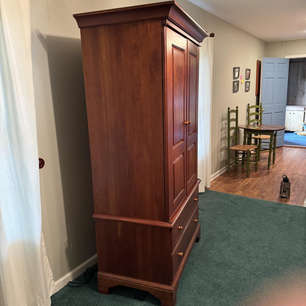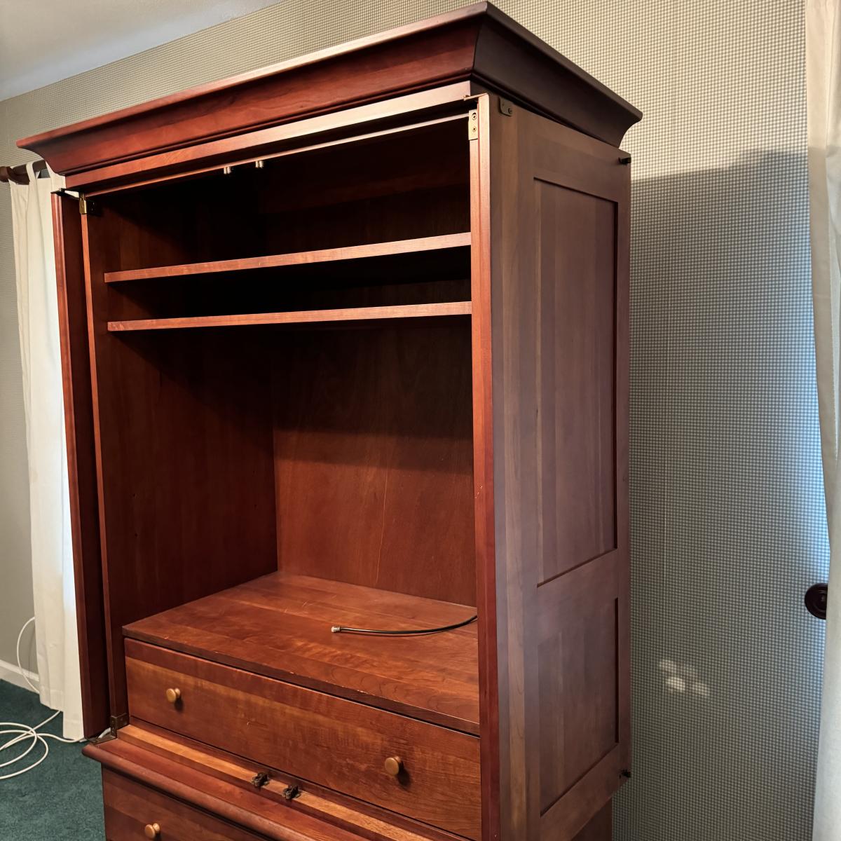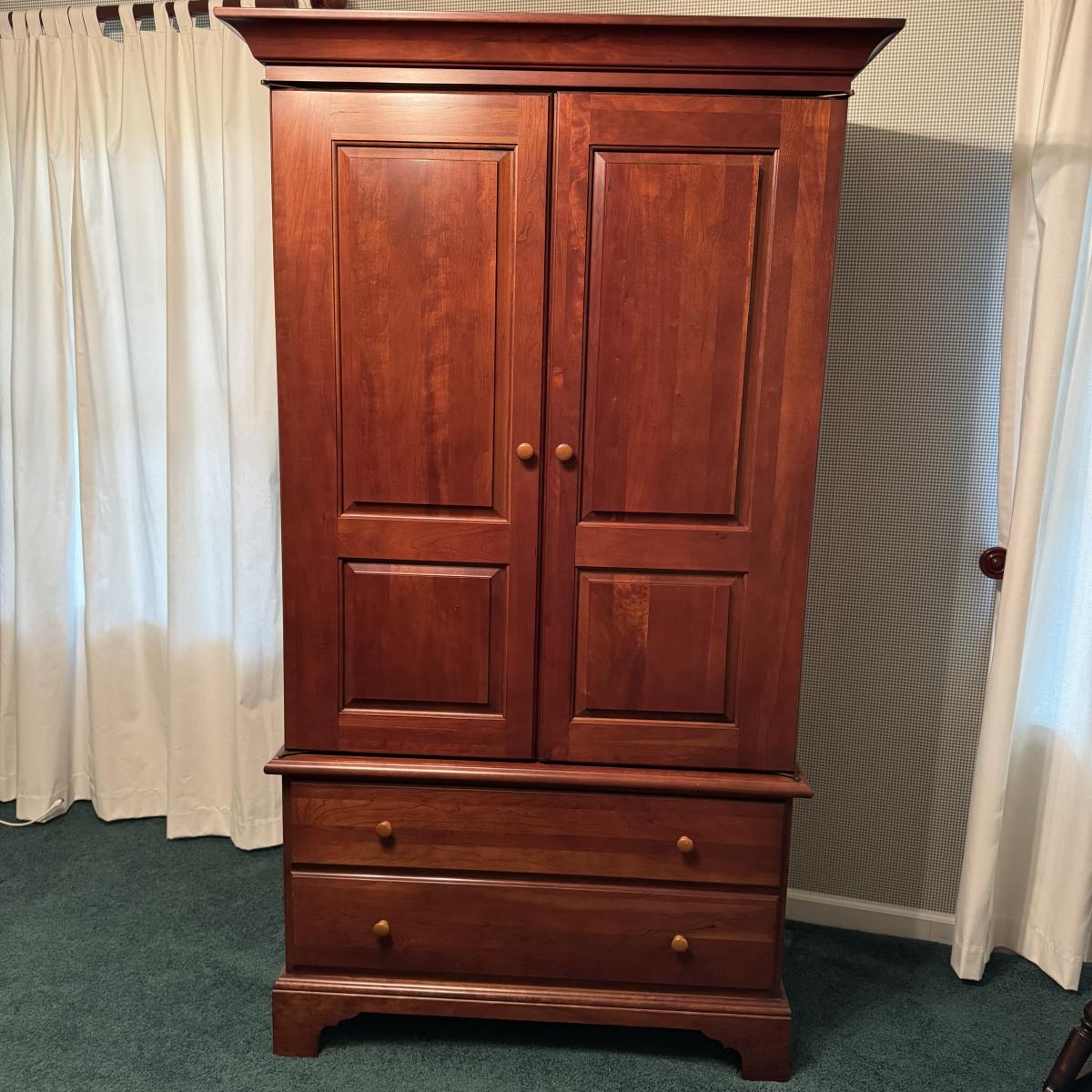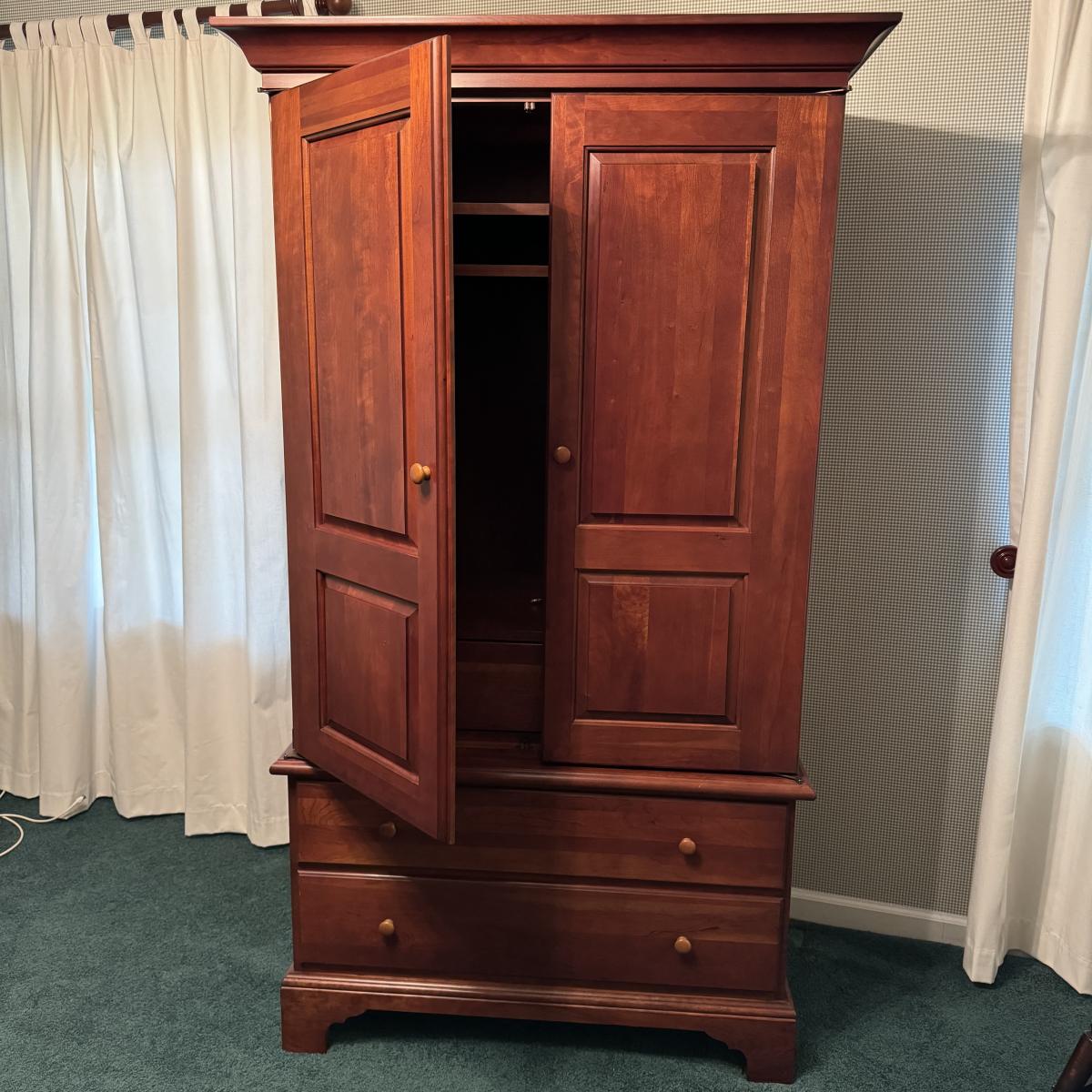 Wooden Armoire can be used as wardrobe or for TV. Has attached plug and hole for electronics and adjustable shelving. Also has three dovetailed drawers, one of which is behind the armoire doors when closed. The doors lay flat on sides when open. Measures 42” x 24” x 73” H. Local pick up only. Winning bidder must bring assistance to help move and load this item due to its weight and/or size. It will need to be moved up a flight of stairs.