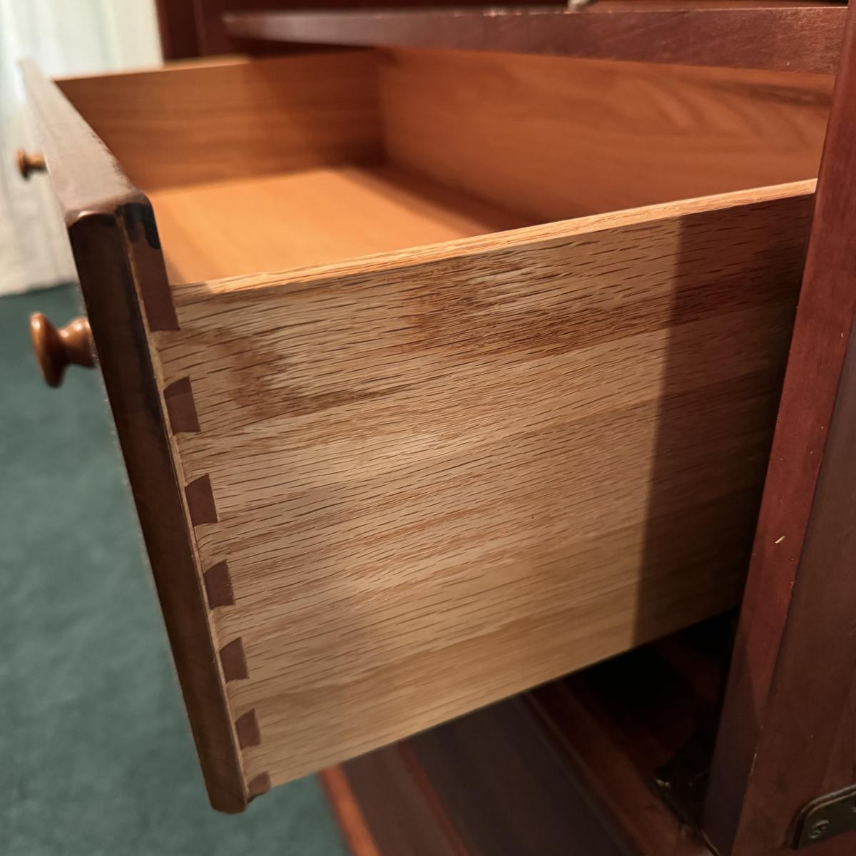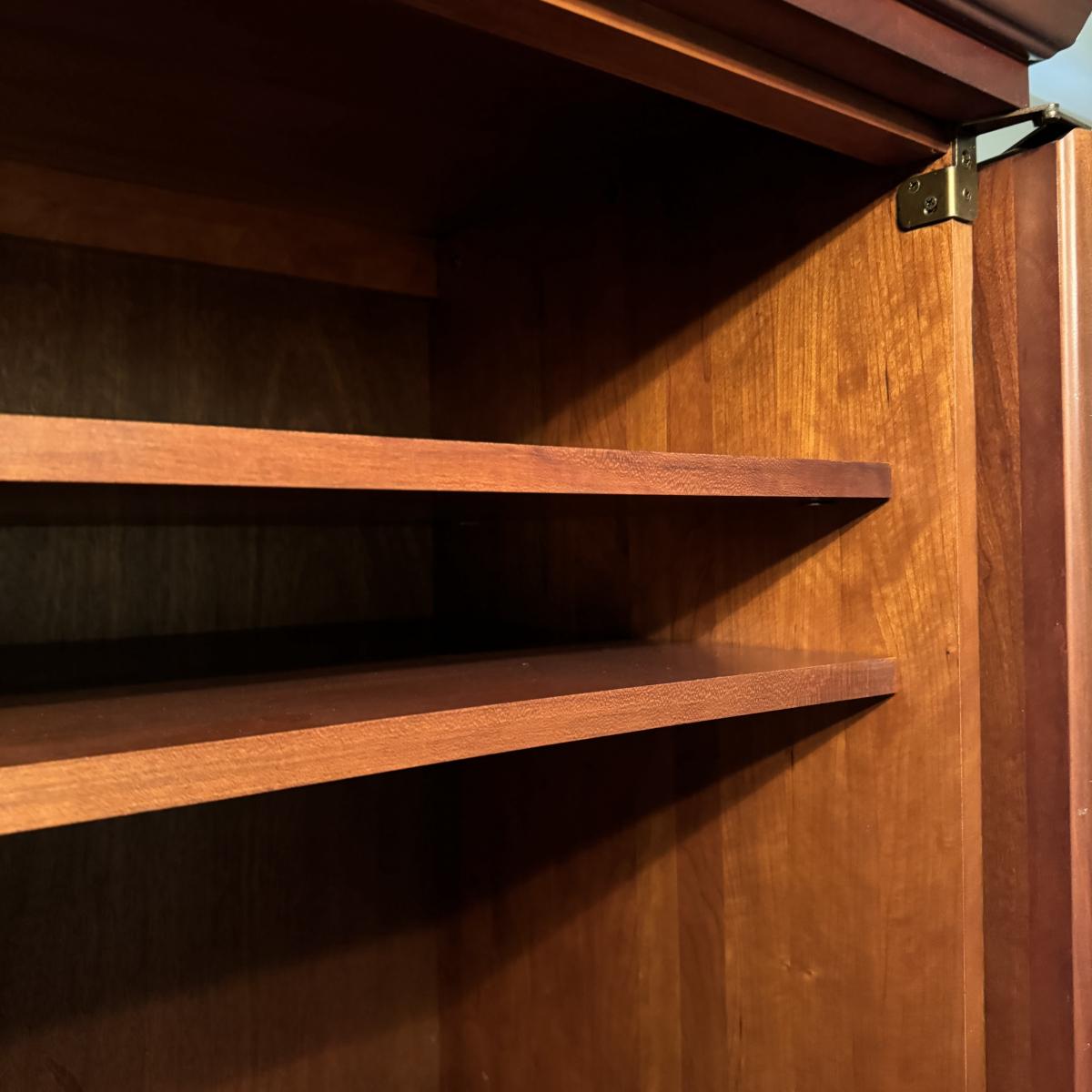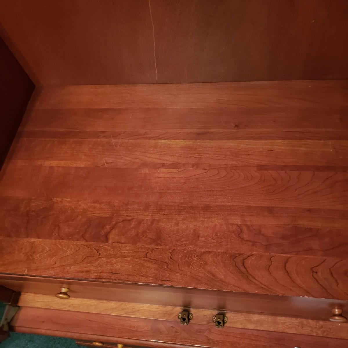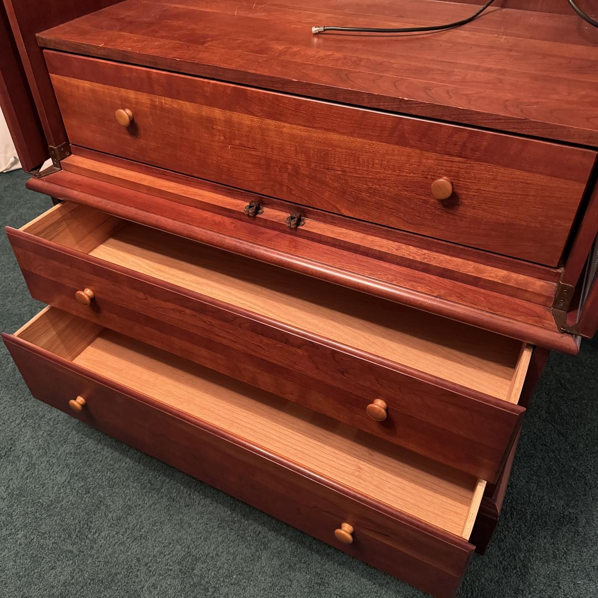 Wooden Armoire can be used as wardrobe or for TV. Has attached plug and hole for electronics and adjustable shelving. Also has three dovetailed drawers, one of which is behind the armoire doors when closed. The doors lay flat on sides when open. Measures 42” x 24” x 73” H. Local pick up only. Winning bidder must bring assistance to help move and load this item due to its weight and/or size. It will need to be moved up a flight of stairs.