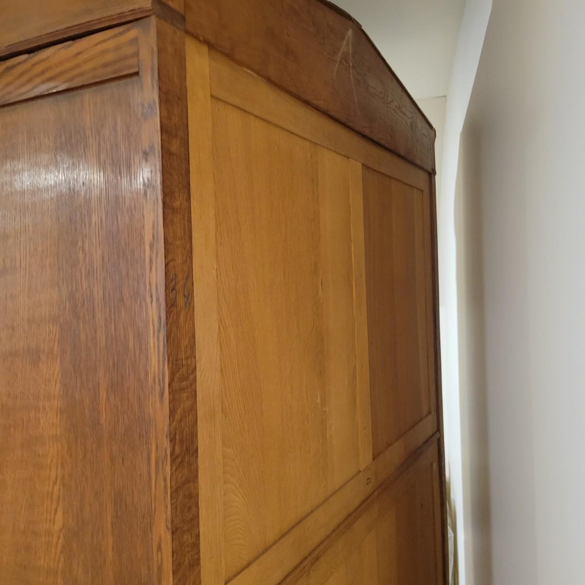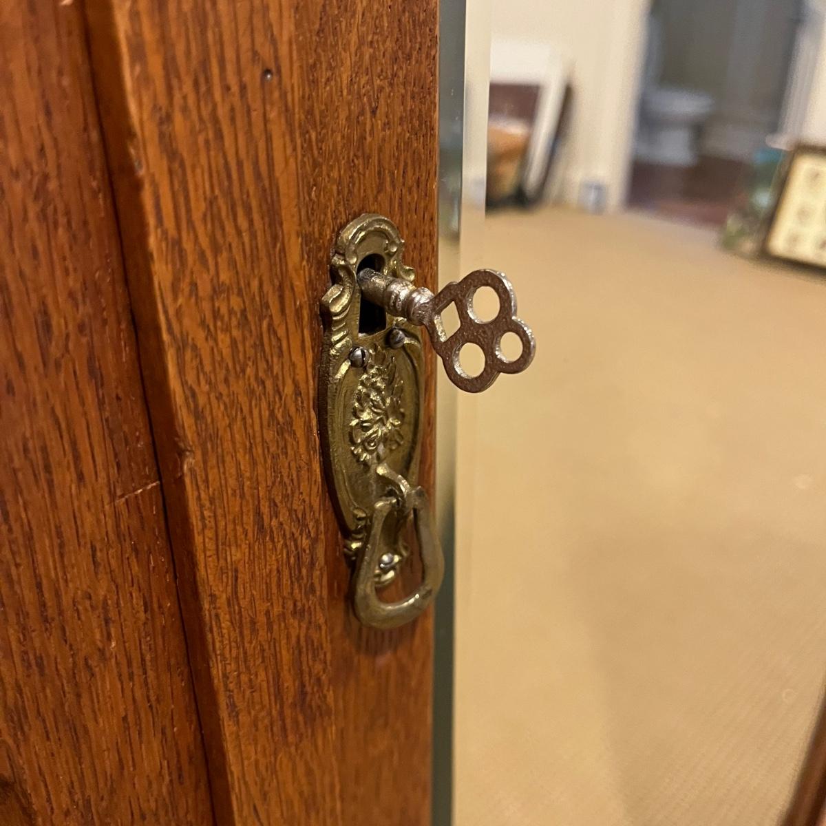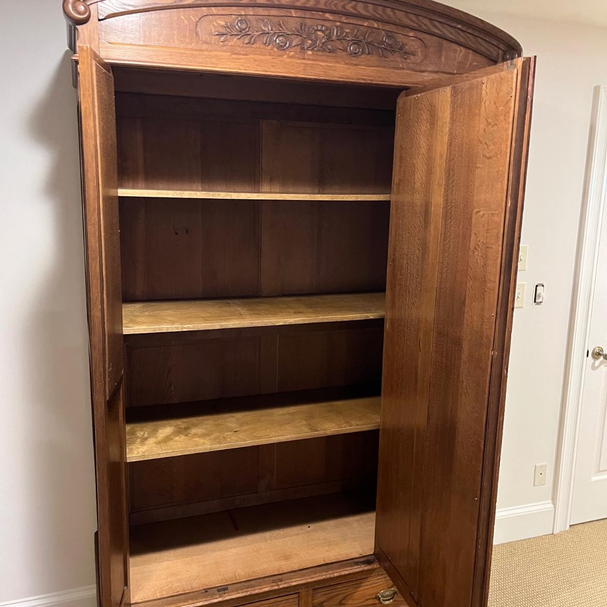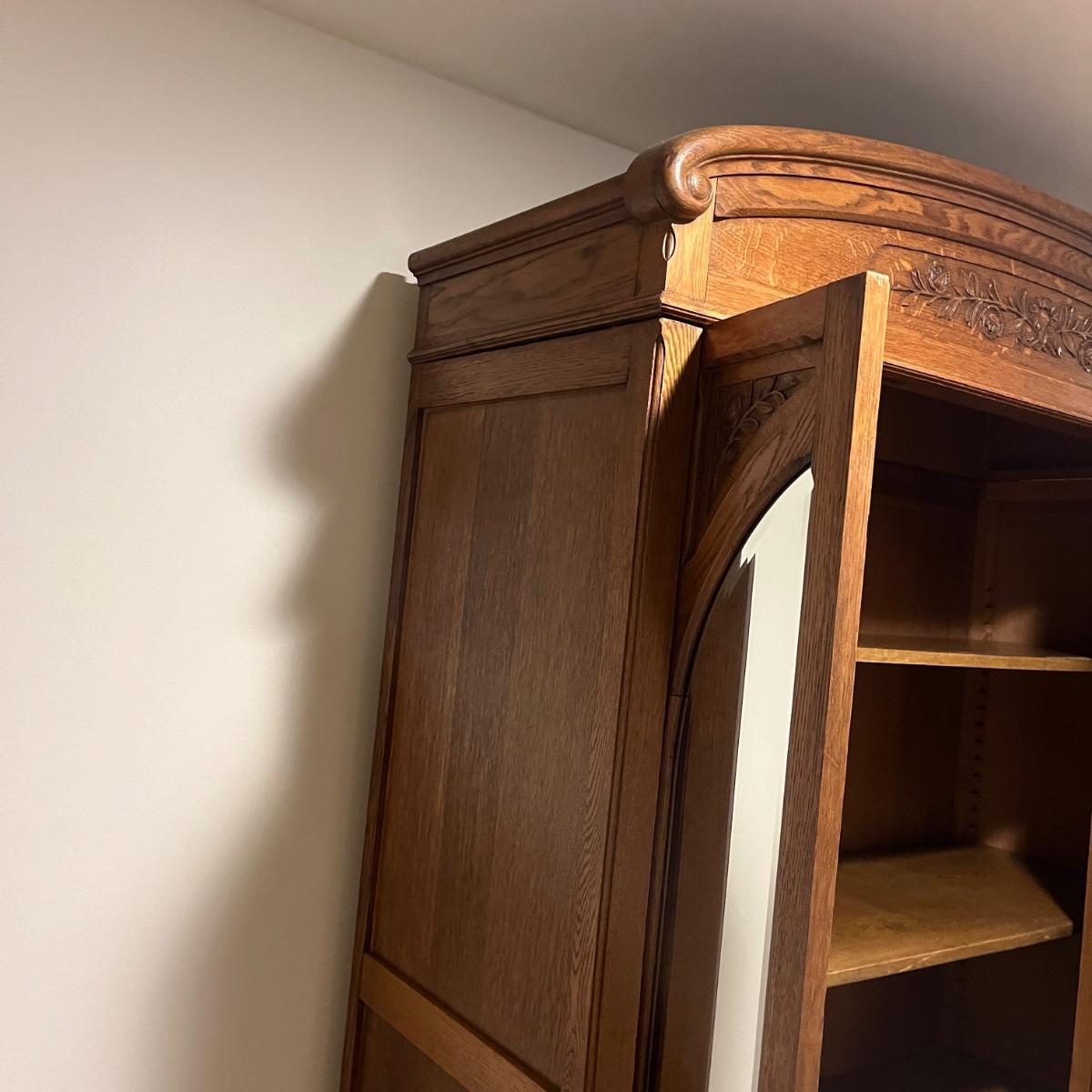Lot includes a large wooden armoire with three beveled mirrors on the front, two dovetailed drawers, key and carvings on the front. Piece has three adjustable shelves. Armoire measures 20” x 51” x 88”H. Item is up one flight of stairs, but does separate into three pieces. It is held together by carriage bolts that will require pliers, wrench, or a socket to disassemble.