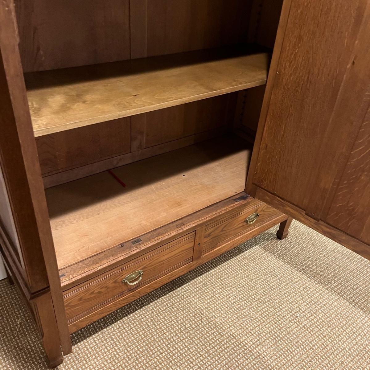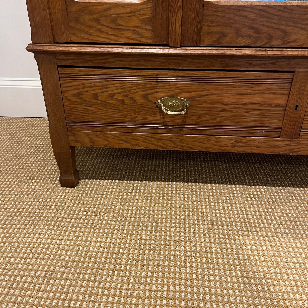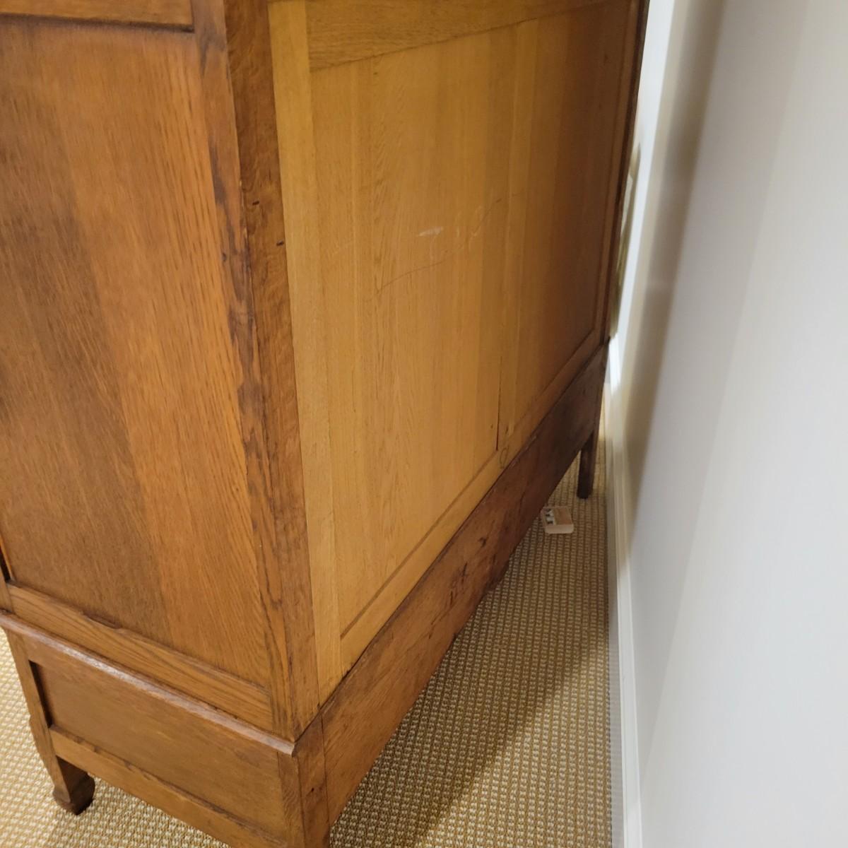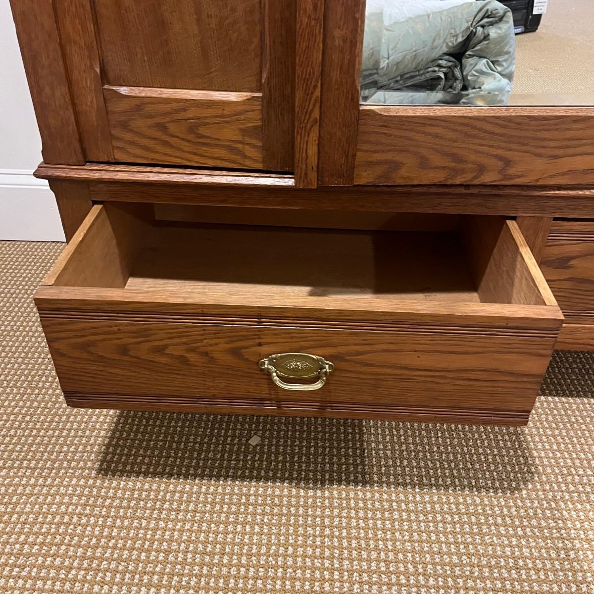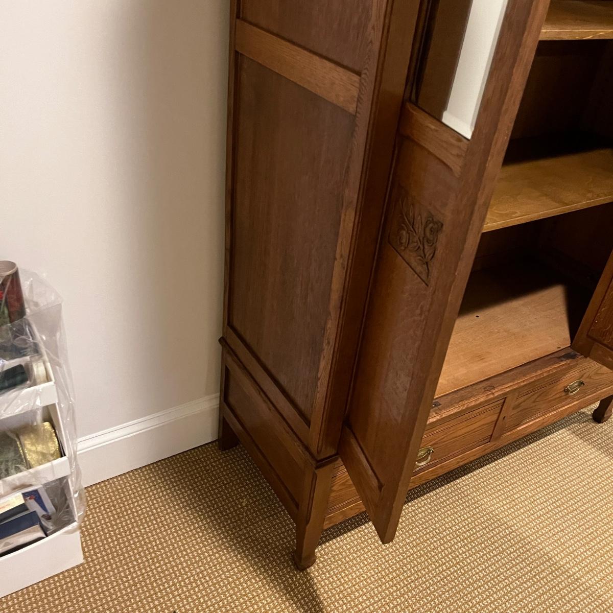 Lot includes a large wooden armoire with three beveled mirrors on the front, two dovetailed drawers, key and carvings on the front. Piece has three adjustable shelves. Armoire measures 20” x 51” x 88”H. Item is up one flight of stairs, but does separate into three pieces. It is held together by carriage bolts that will require pliers, wrench, or a socket to disassemble.