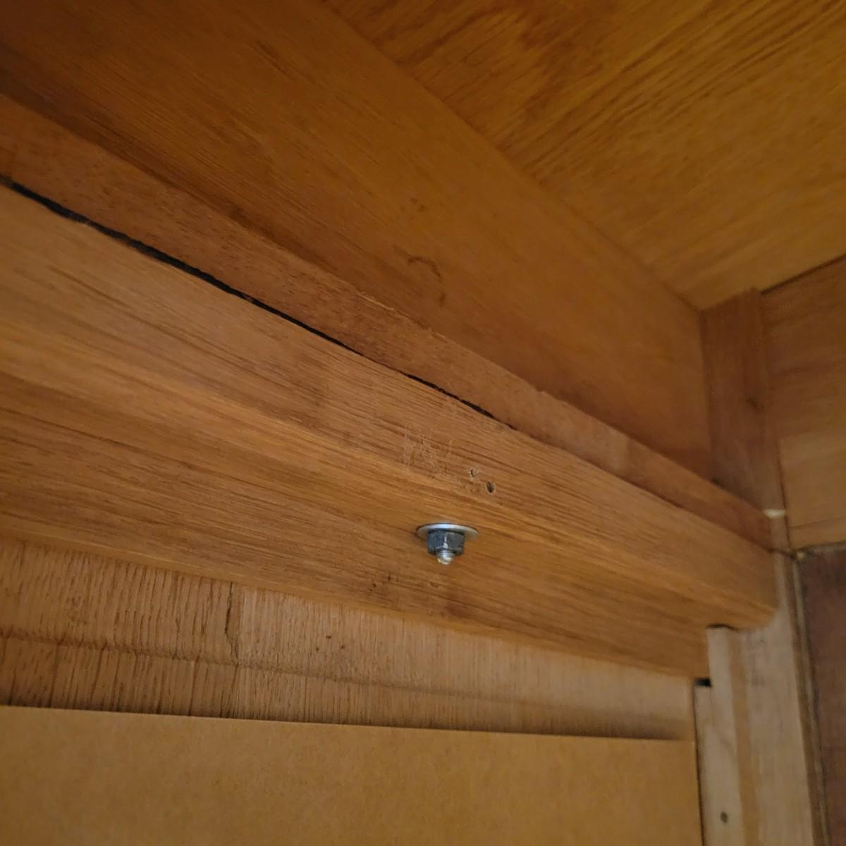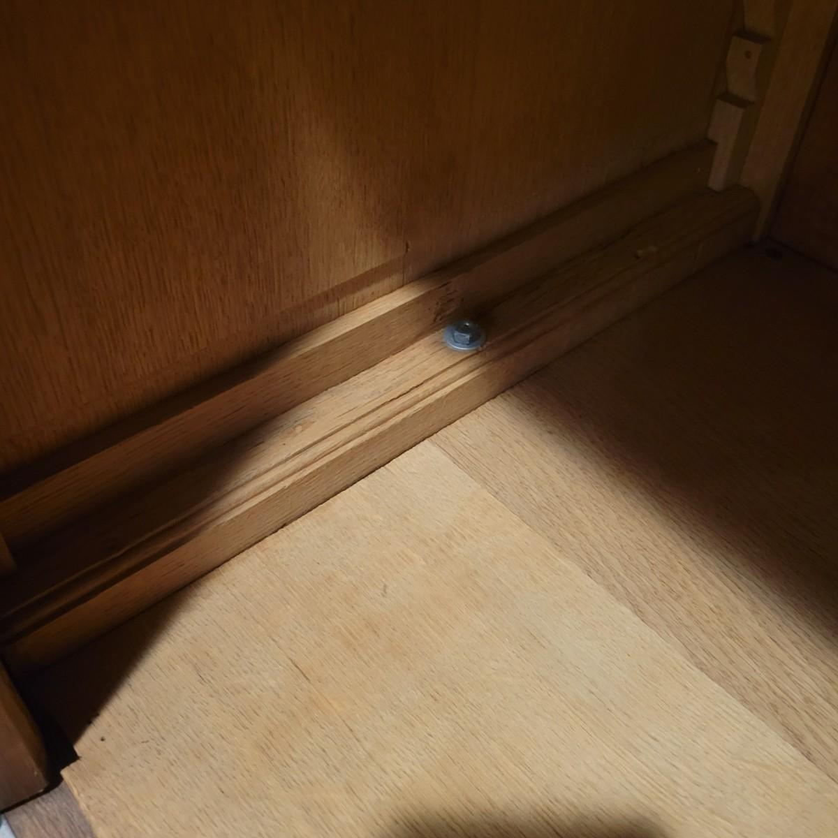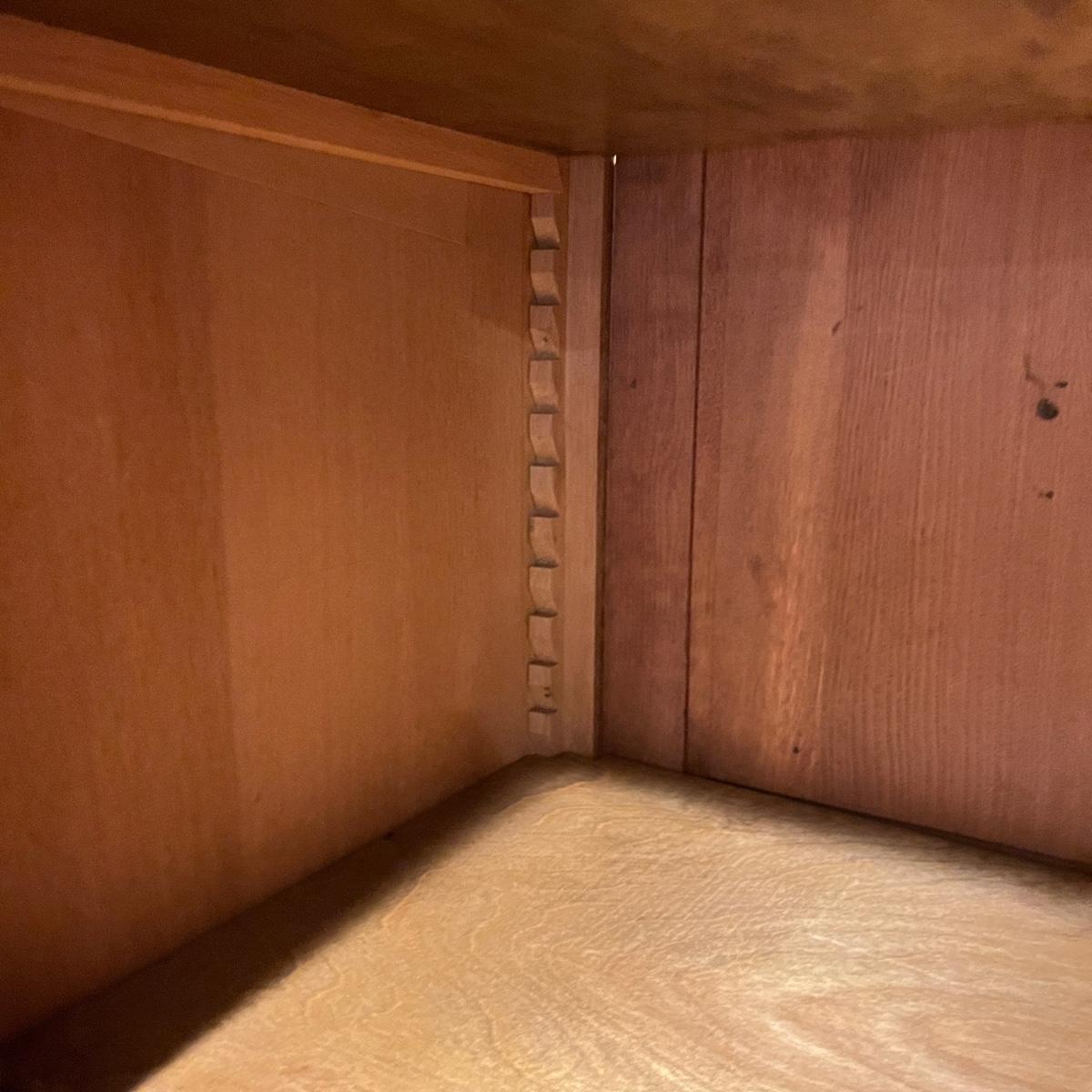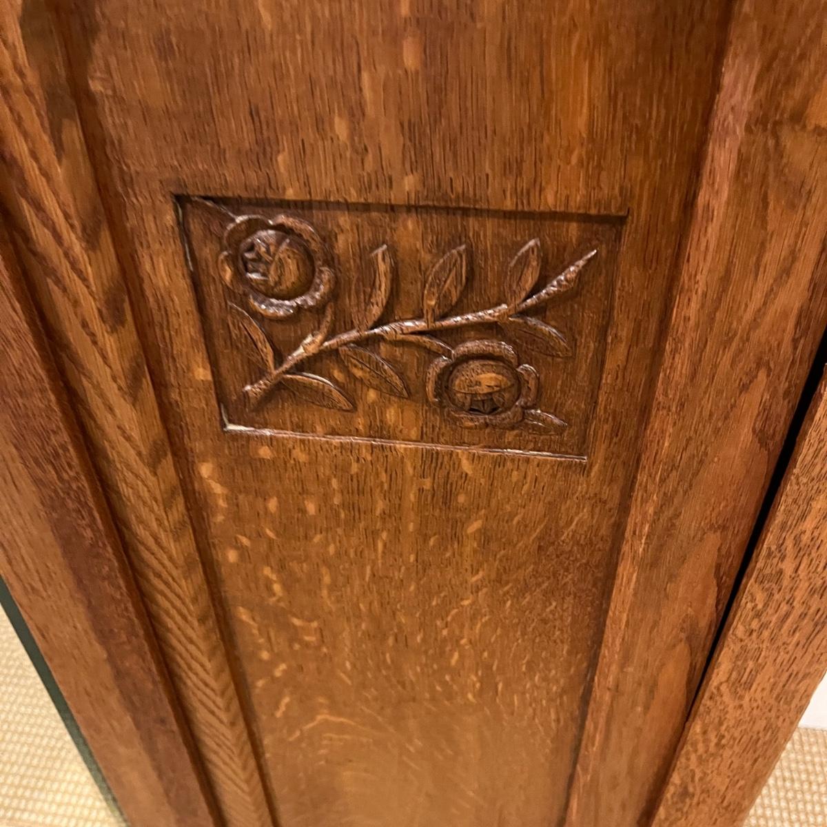 Lot includes a large wooden armoire with three beveled mirrors on the front, two dovetailed drawers, key and carvings on the front. Piece has three adjustable shelves. Armoire measures 20” x 51” x 88”H. Item is up one flight of stairs, but does separate into three pieces. It is held together by carriage bolts that will require pliers, wrench, or a socket to disassemble.