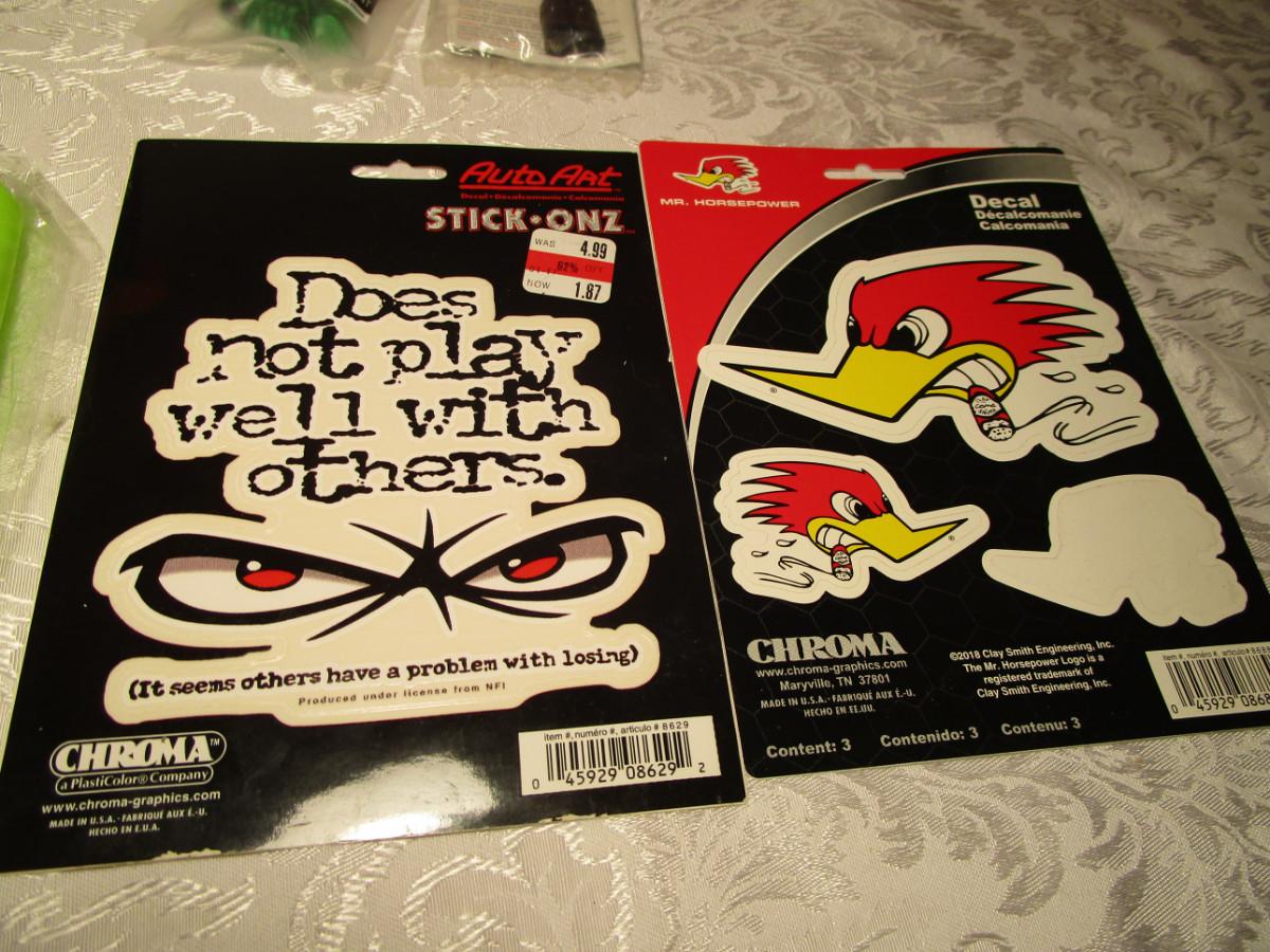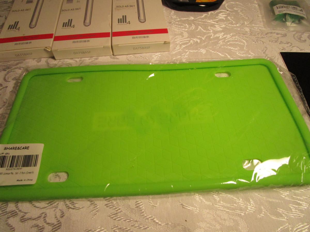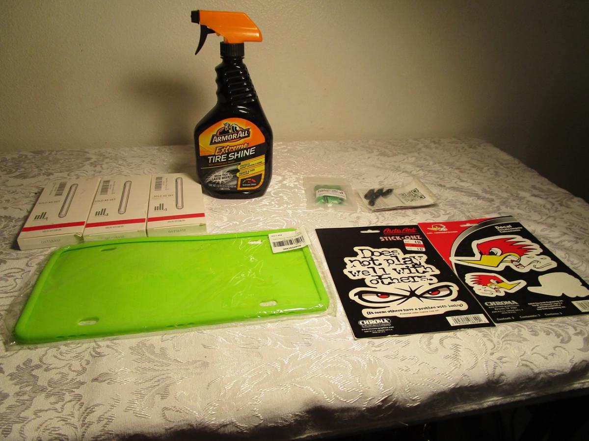 Armorall tire shine, license plate frame, window decals, valve caps (2 pkg), 3 pkg of 4 door edge protectors(all clear)
