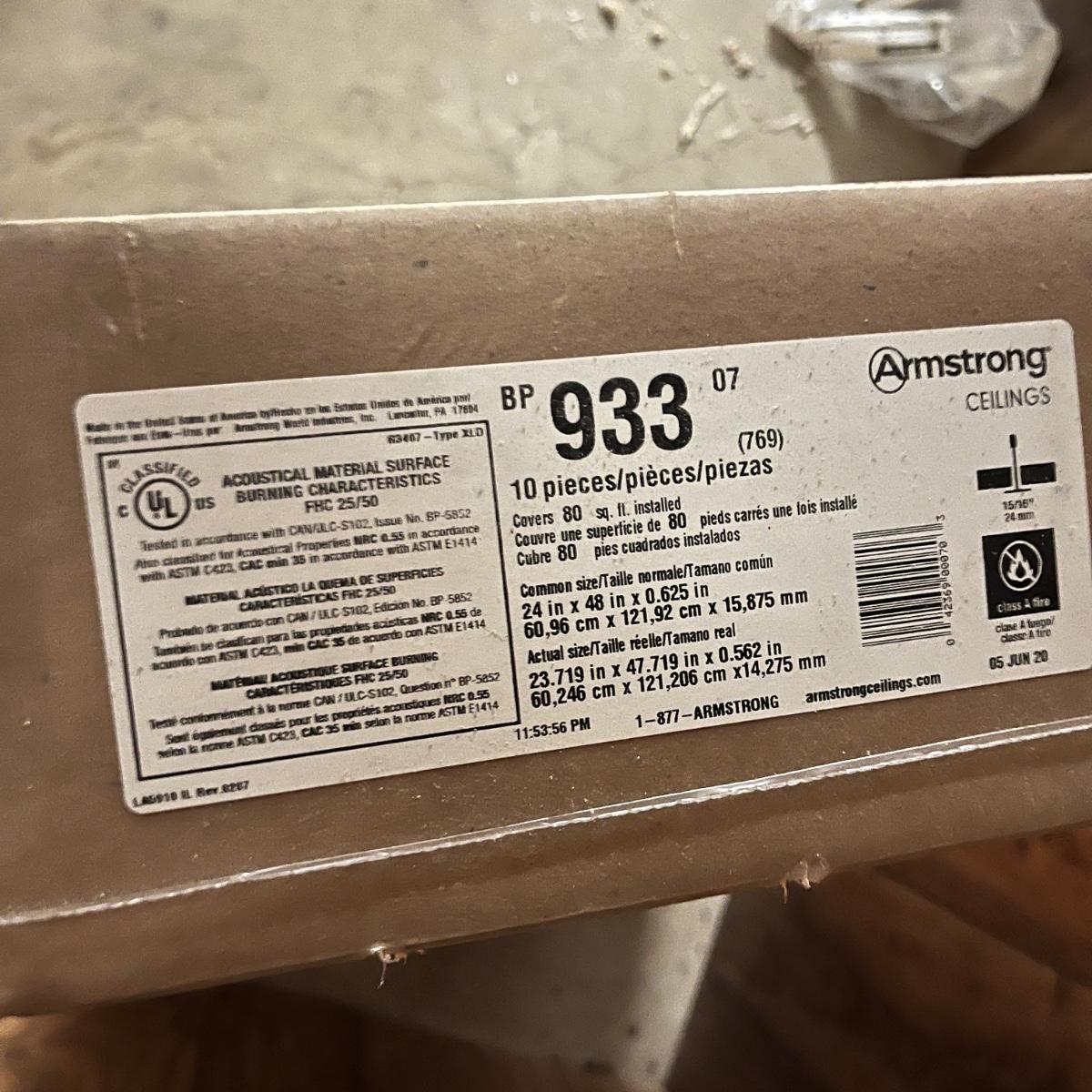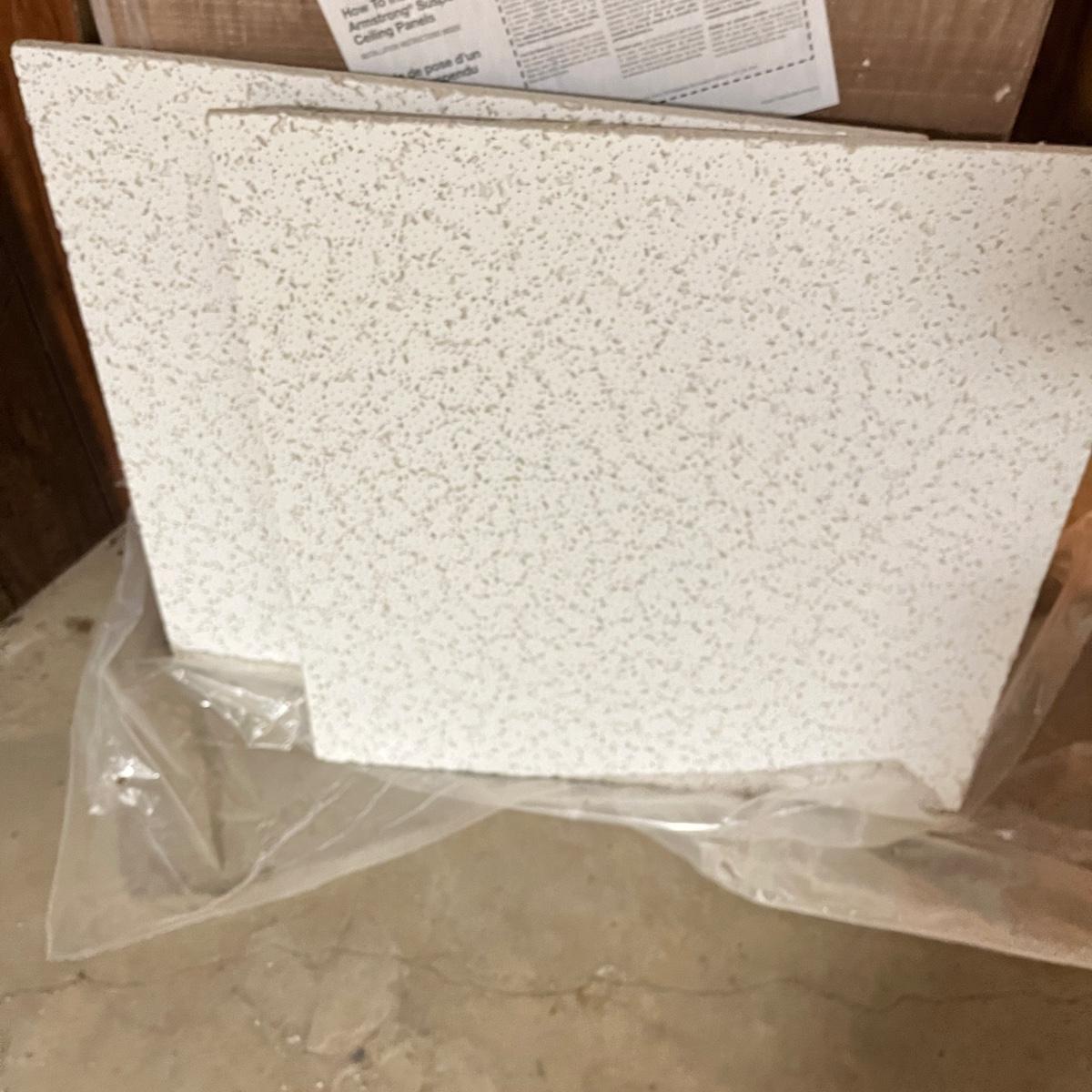 Lot includes an unopened box of ten Armstrong ceiling tiles that measure 24” x 48”. Also includes two smaller pieces of ceiling tile.