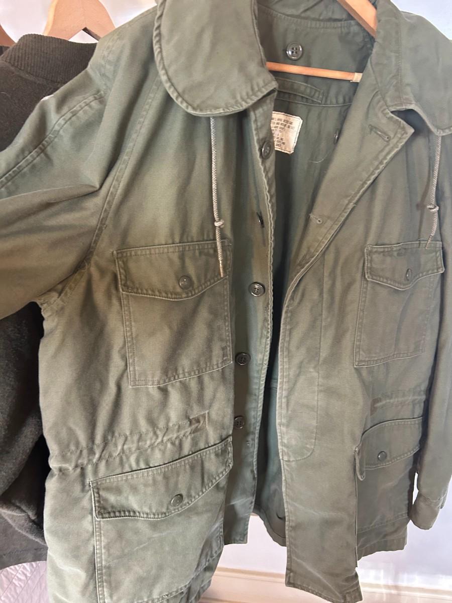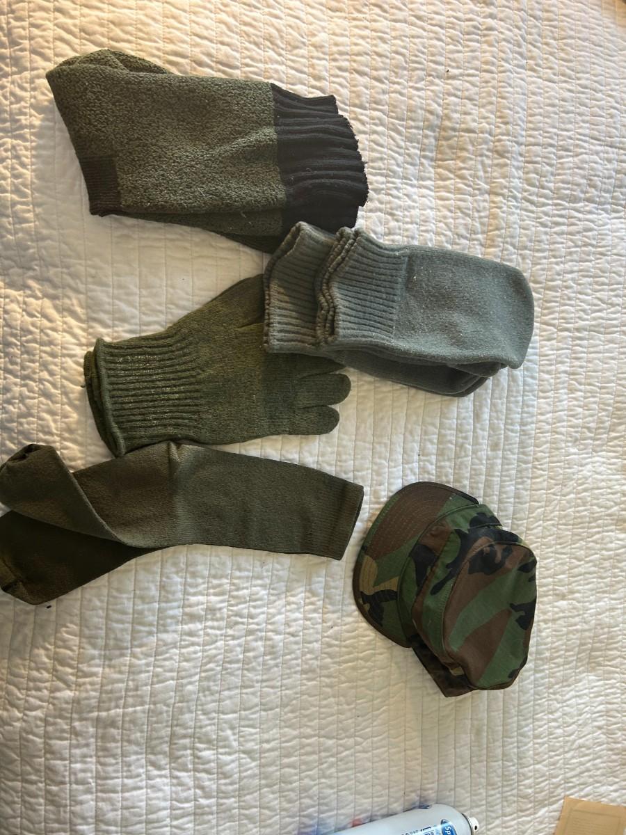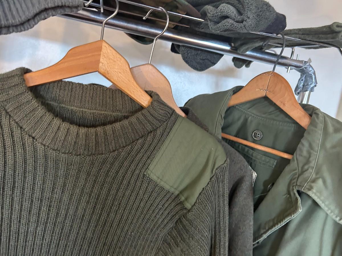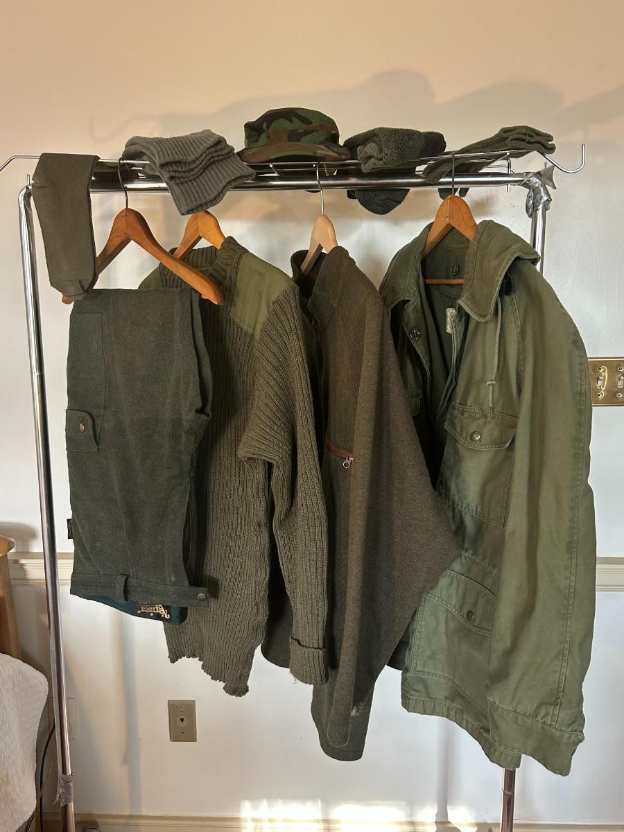 Handsome lot of wool clothing, canvas jacket and accessories all in our favorite shade of green