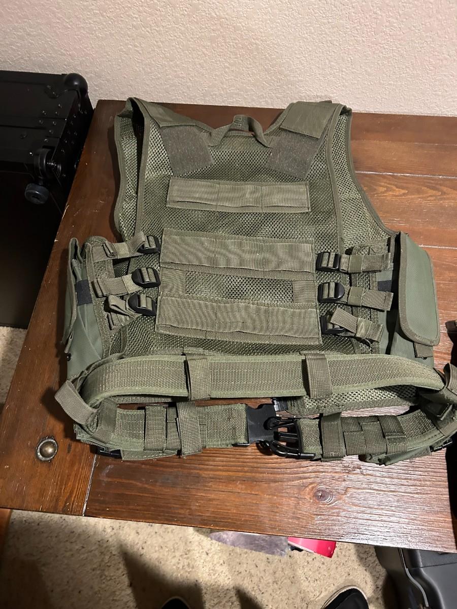 No size on any tags, these are adjustable both at the shoulder and sides.