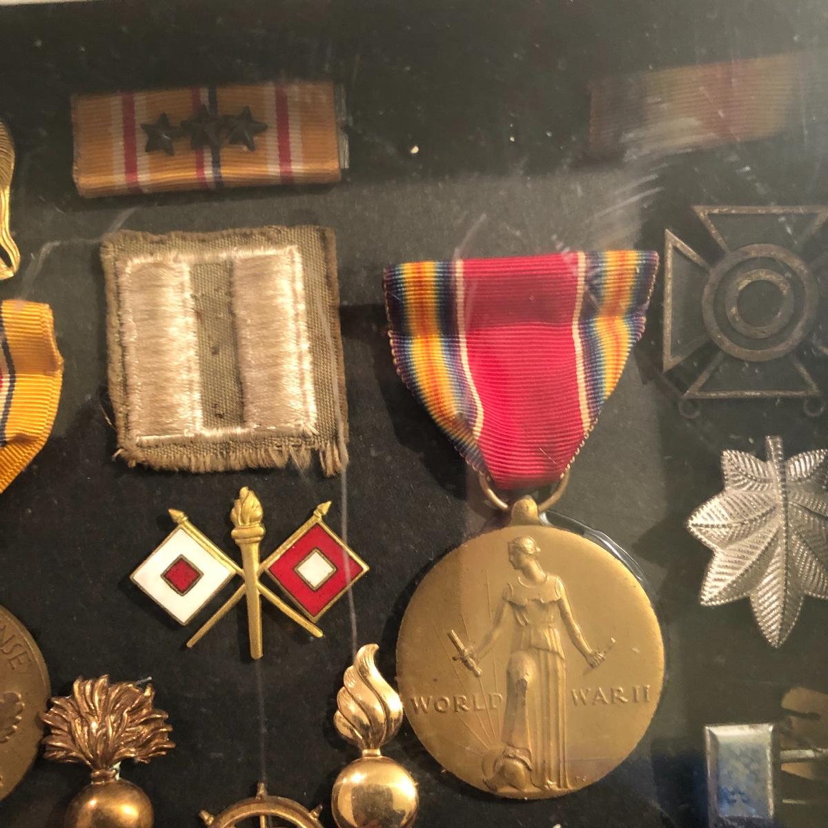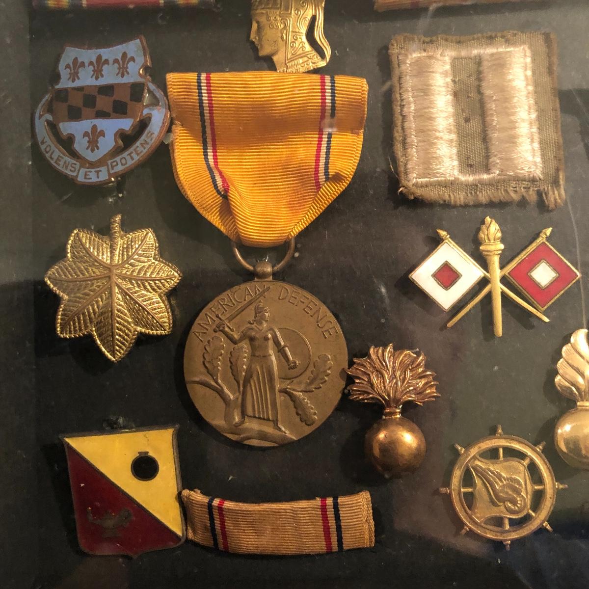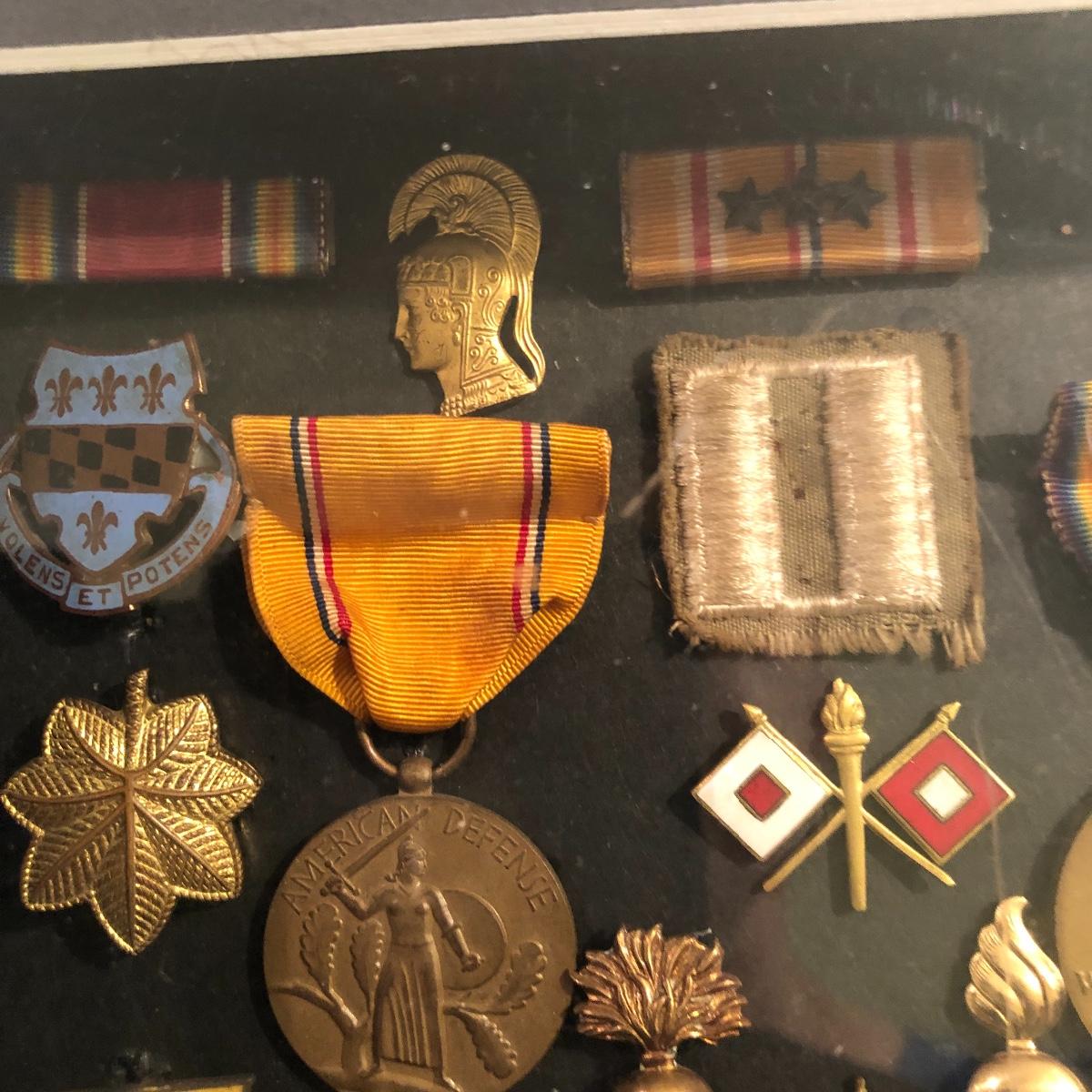 The shadow box contains Captain, Major and Lieutenant Colonel ranks along with ordinance, signal and transportation insignia. There are also ribbons and medals. The plastic shadow box measures 10” x 8”. Shipping Available.