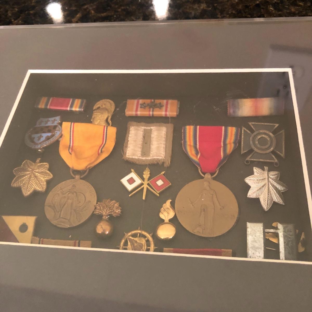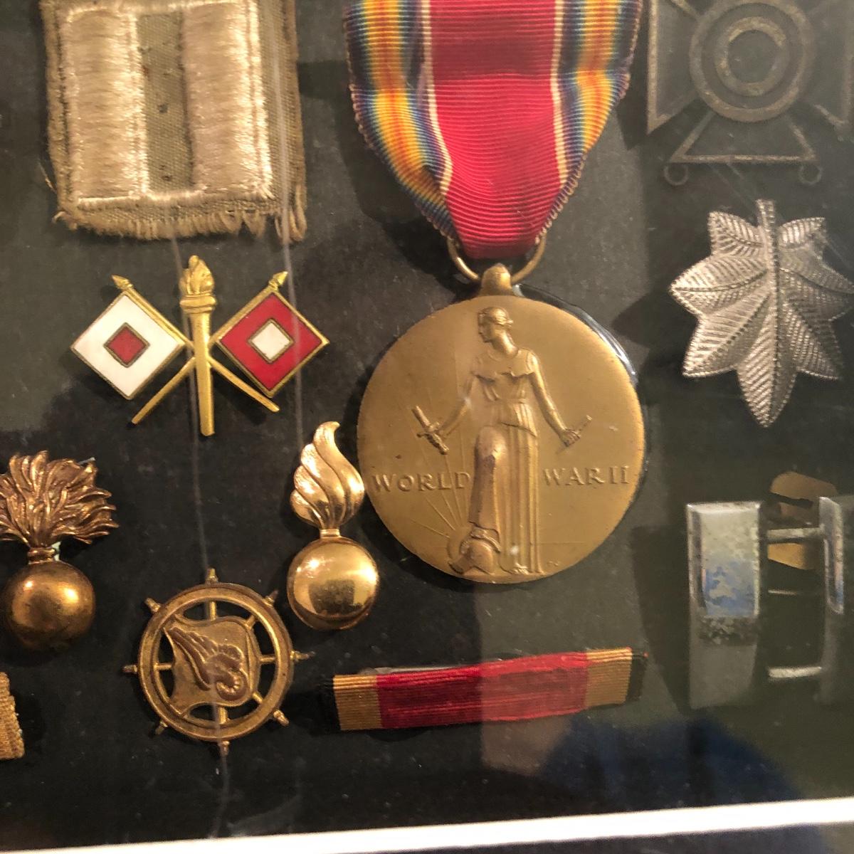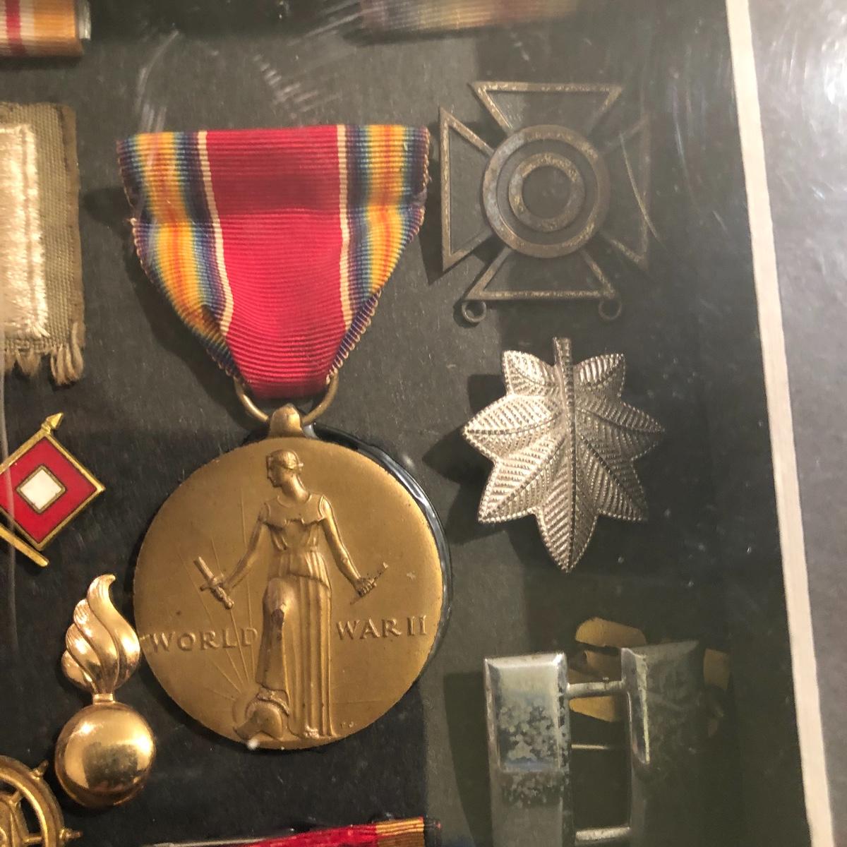 The shadow box contains Captain, Major and Lieutenant Colonel ranks along with ordinance, signal and transportation insignia. There are also ribbons and medals. The plastic shadow box measures 10” x 8”. Shipping Available.