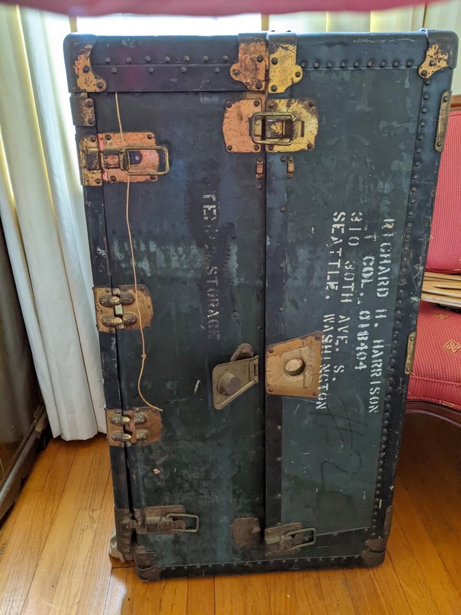 Army wardrobe, steamer style trunk. Includes wooden hangers.