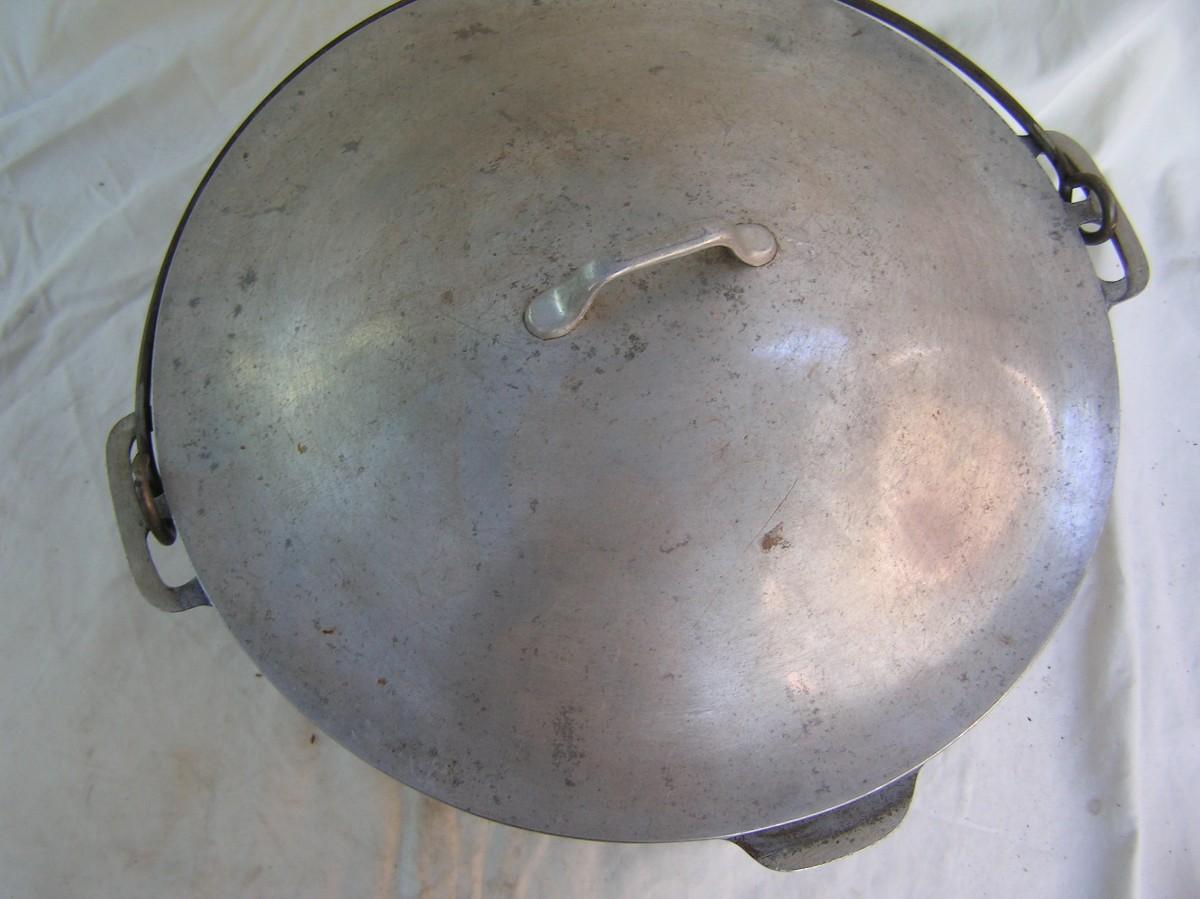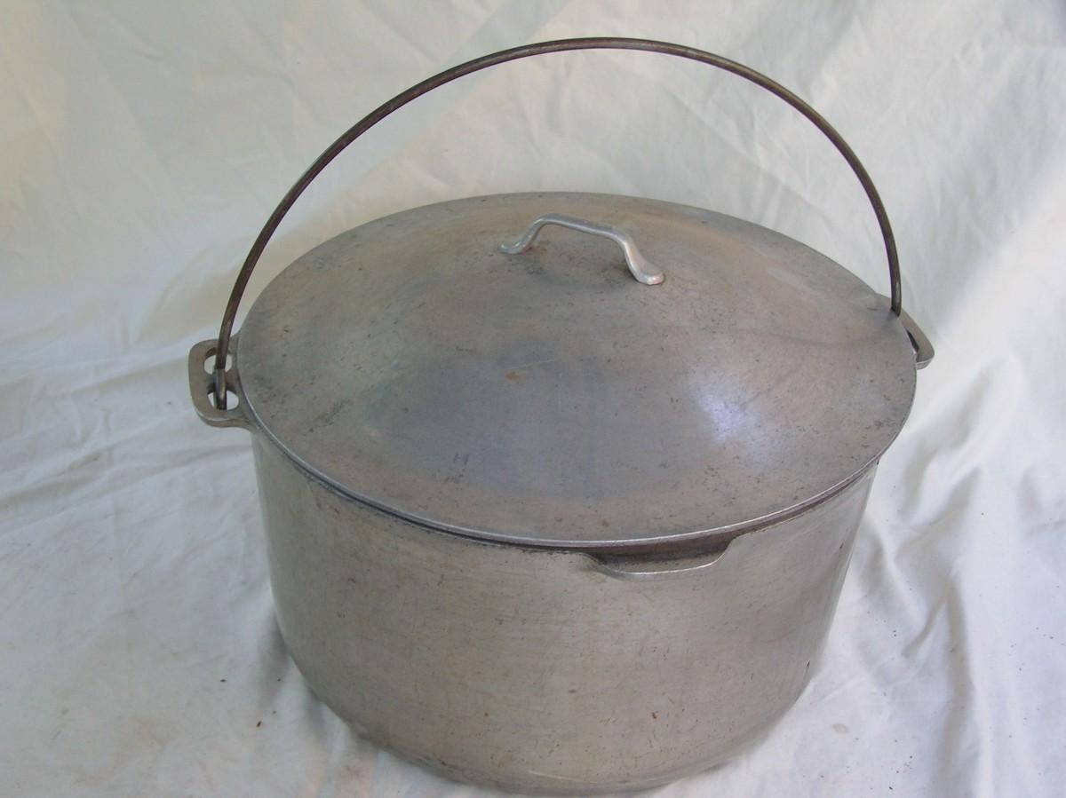 ARMY WWII era vintage aluminum cooking pot. BIG. Thick cast aluminum. W/cast lid, pouring lip and steel wire bail handle. 12" dia. at the top and about 6-1/2' deep. Good condition overall.