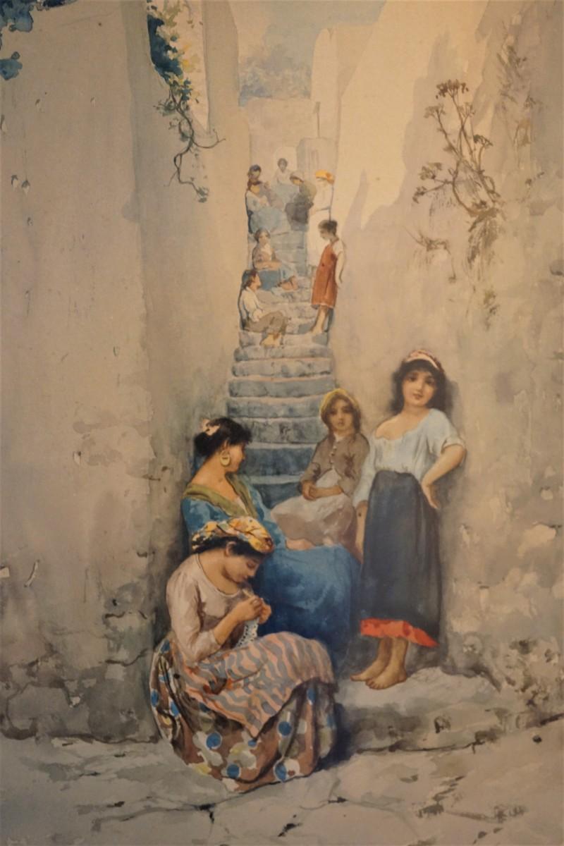 ARNOLDO DE LISIO 1869-1949  WATERCOLOR OF YOUNG WOMEN BY STAIRWELL