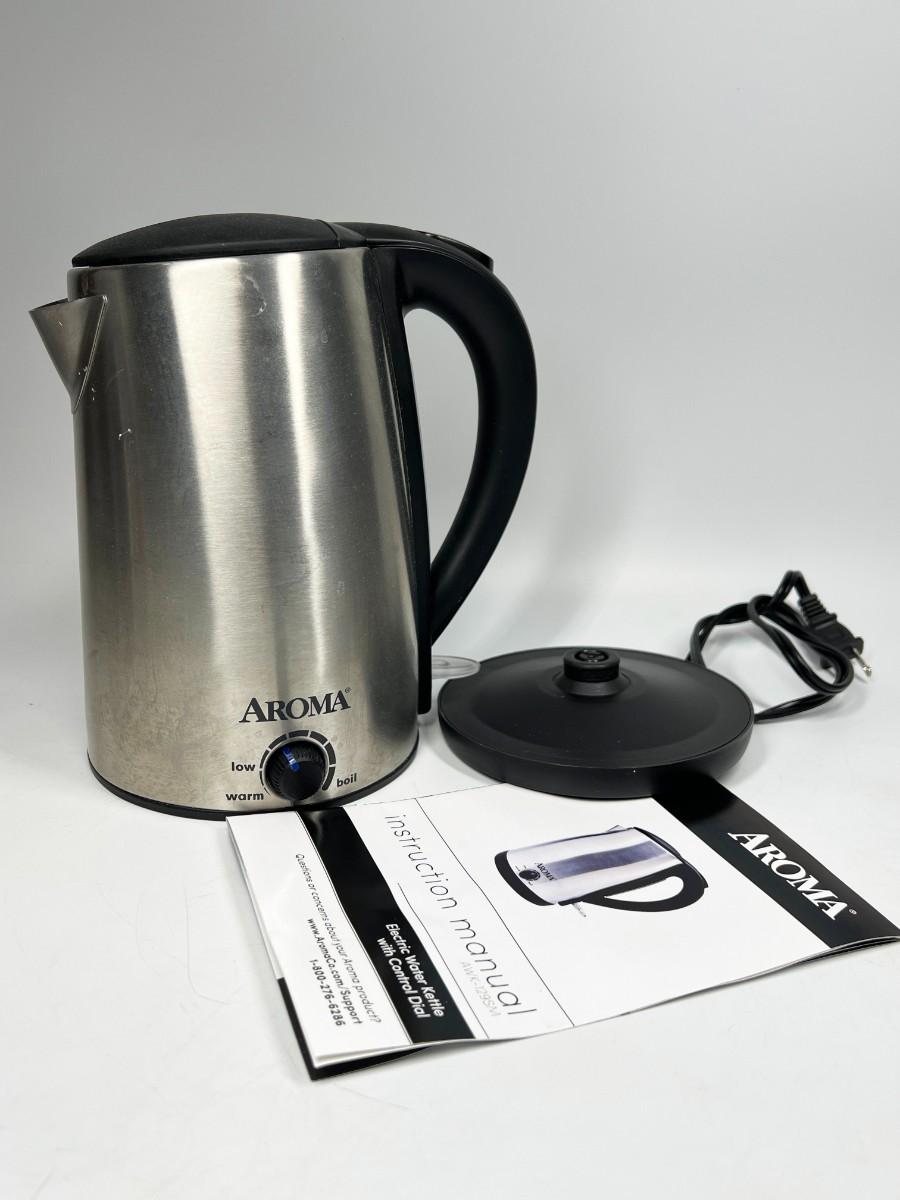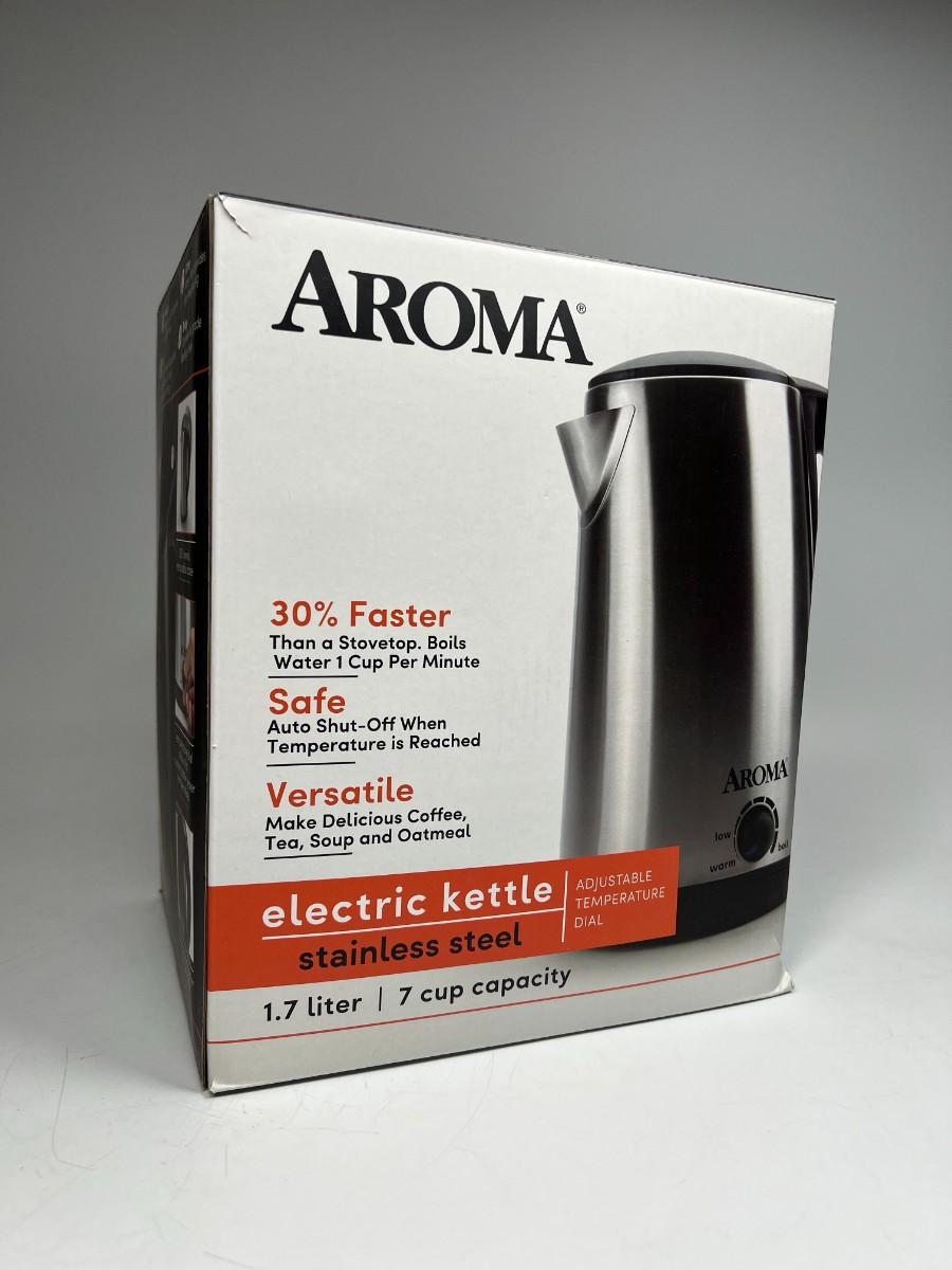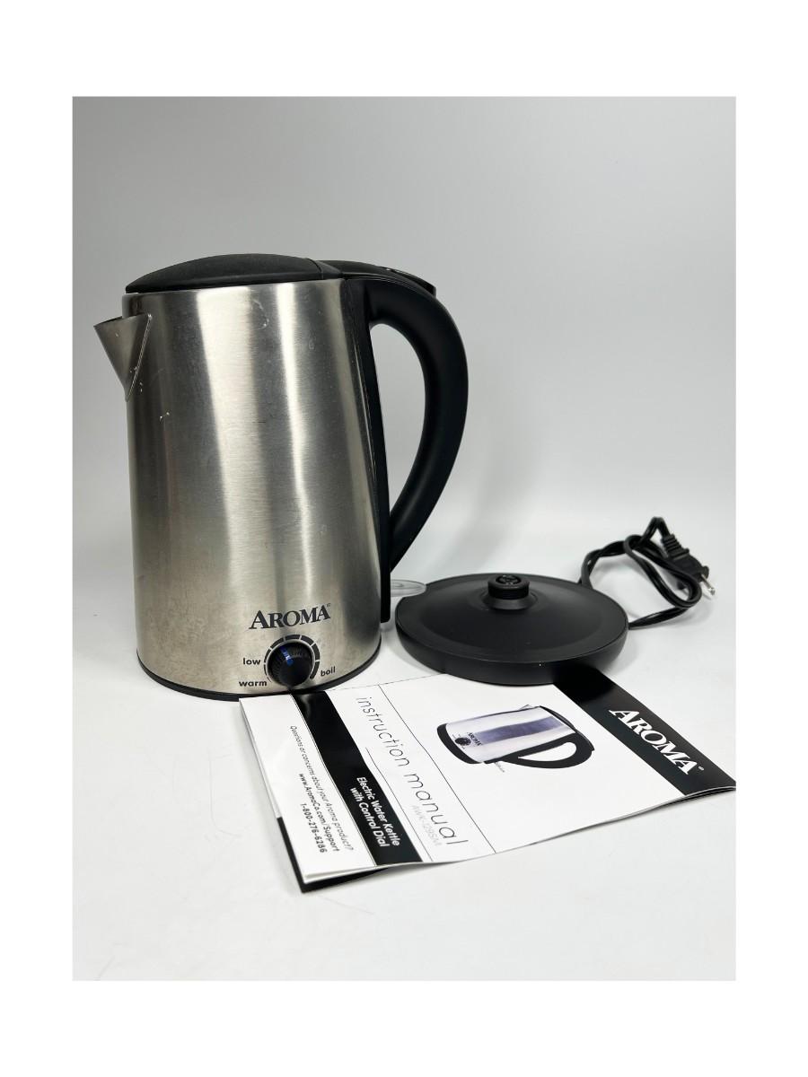 Aroma Stainless Steel Electric Kettle in Box. In good condition. Untested but is complete with manual, maybe unused.