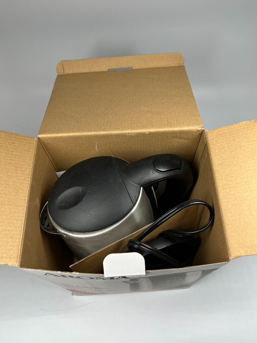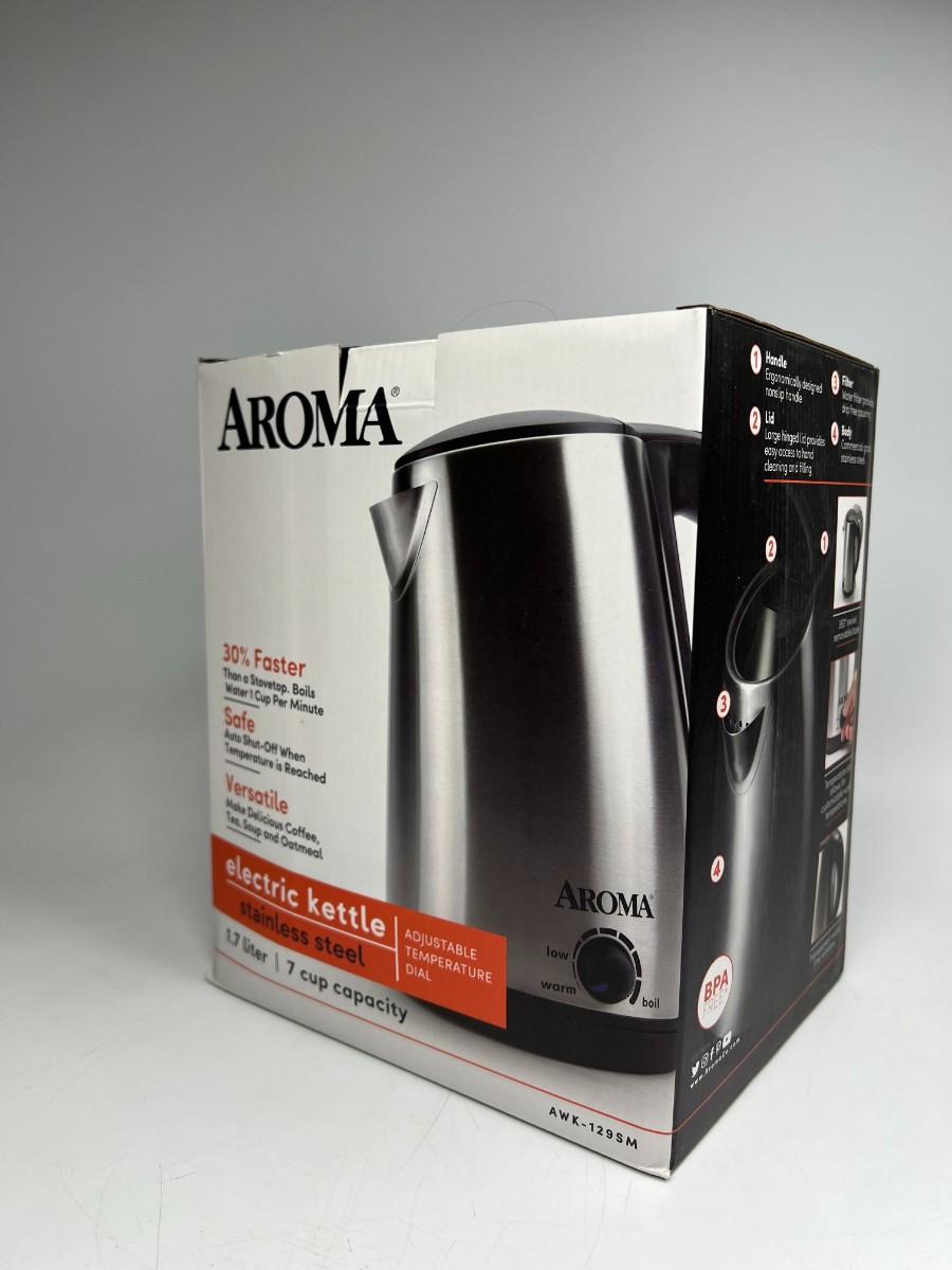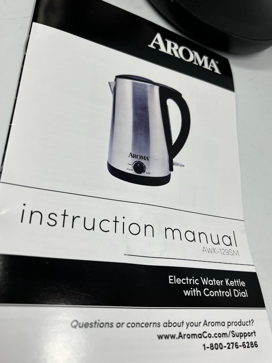 Aroma Stainless Steel Electric Kettle in Box. In good condition. Untested but is complete with manual, maybe unused.