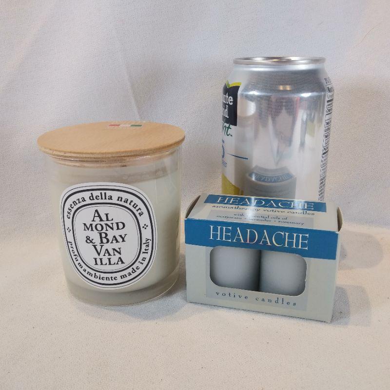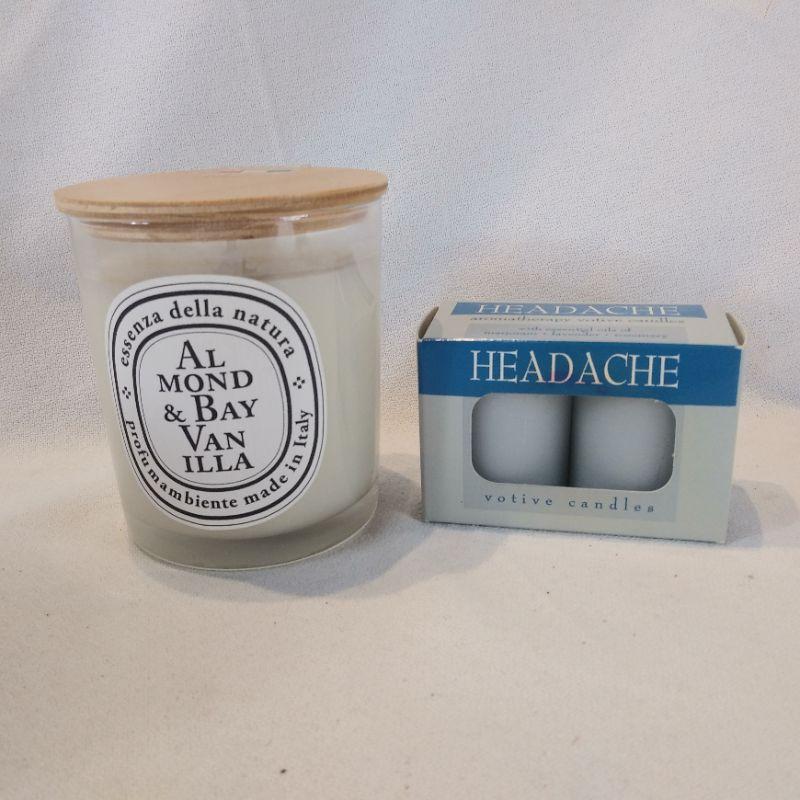 Two different candles for you to enjoy. The jar candle is made in Italy and is of an Almond and Bay Vanilla scent, has a nice wooden lid and is 3 1/2-inches tall. The pair of votive candles are designed to relieve stress and headaches. They are made up of Marjoram, Lavender and Rosemary. Both are newer and unused. Very nice scents.