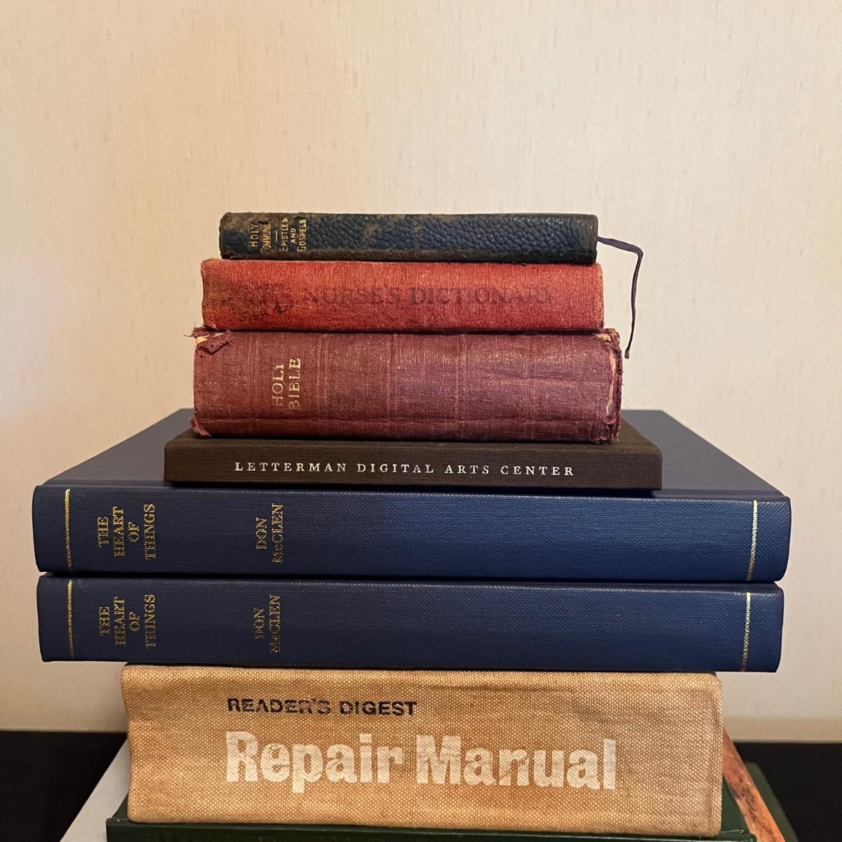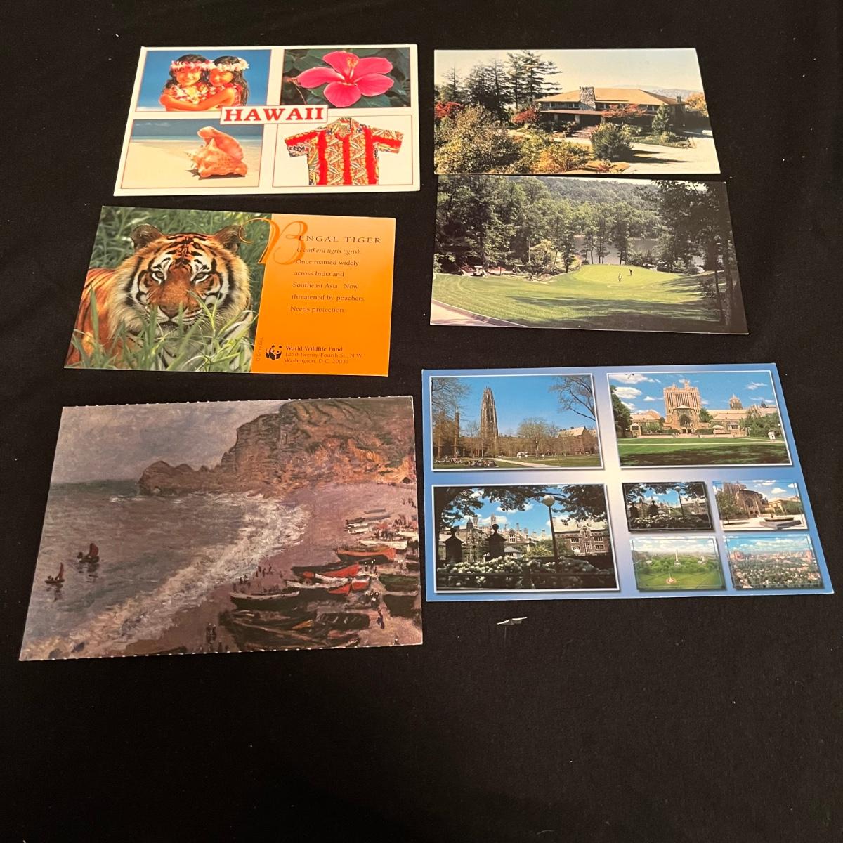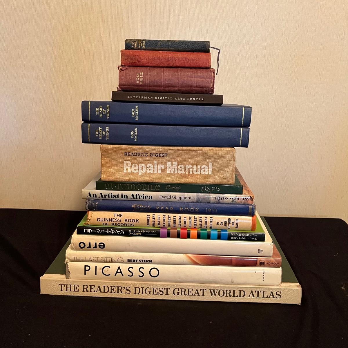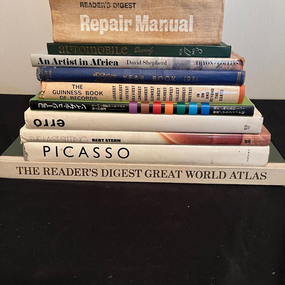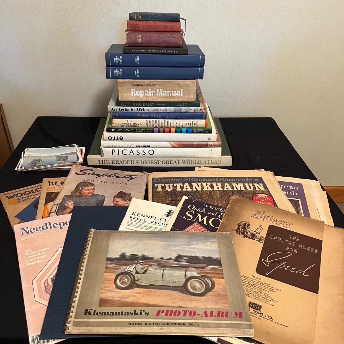 Lot includes books titled The Last Sitting, Picasso, An Artist in Africa, The Heart of Things, The Motor Yearbook 1951, The Guinness Book of Records 1965, a variety of unused postcards, sewing books and more.