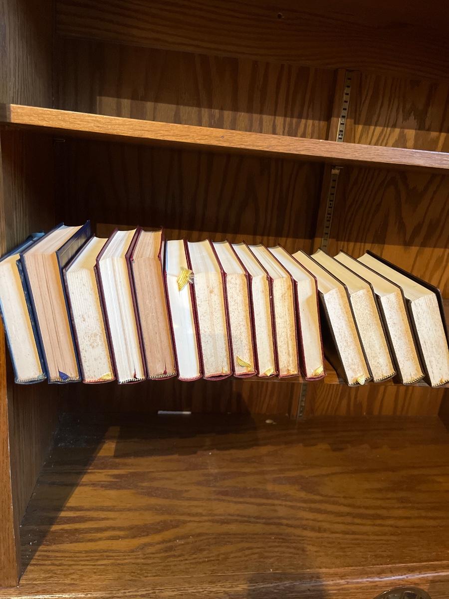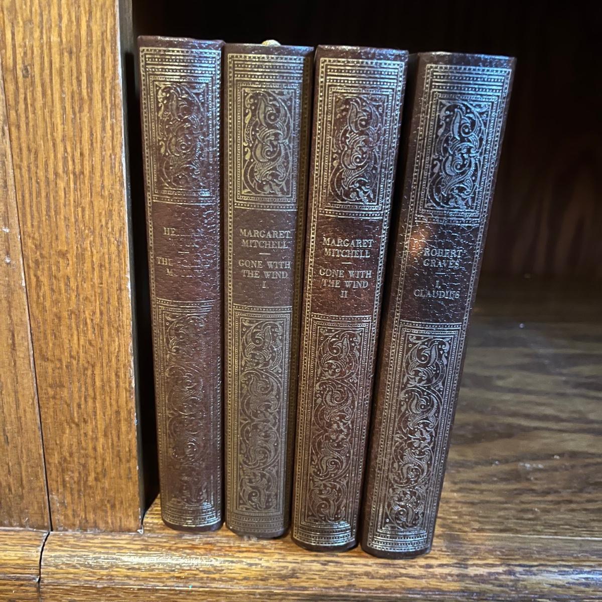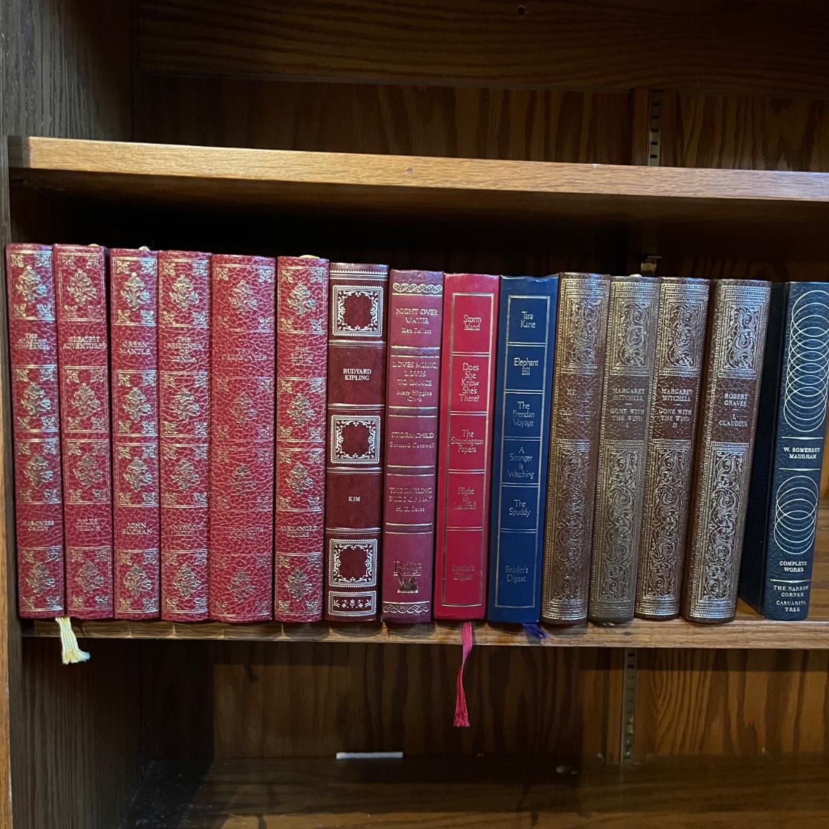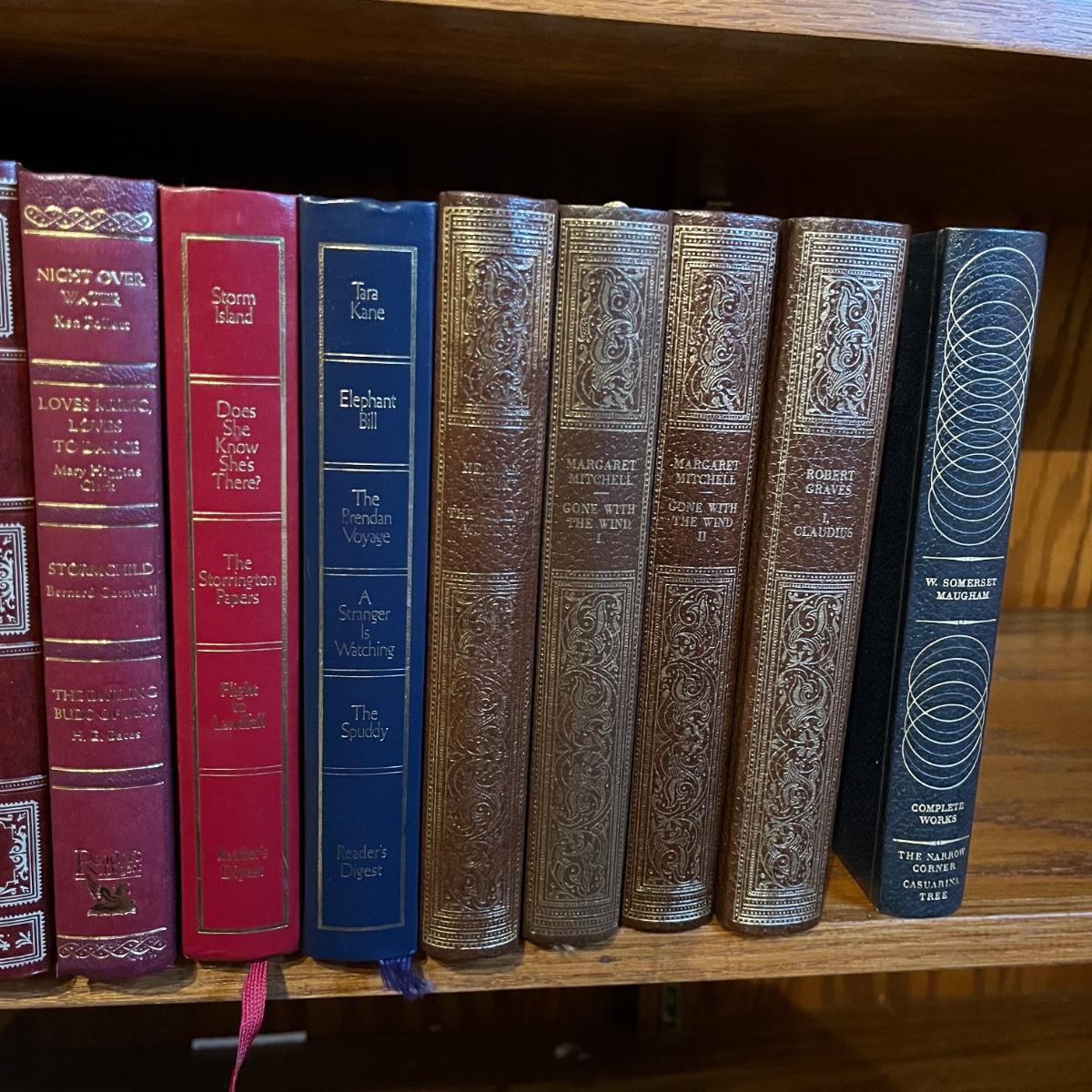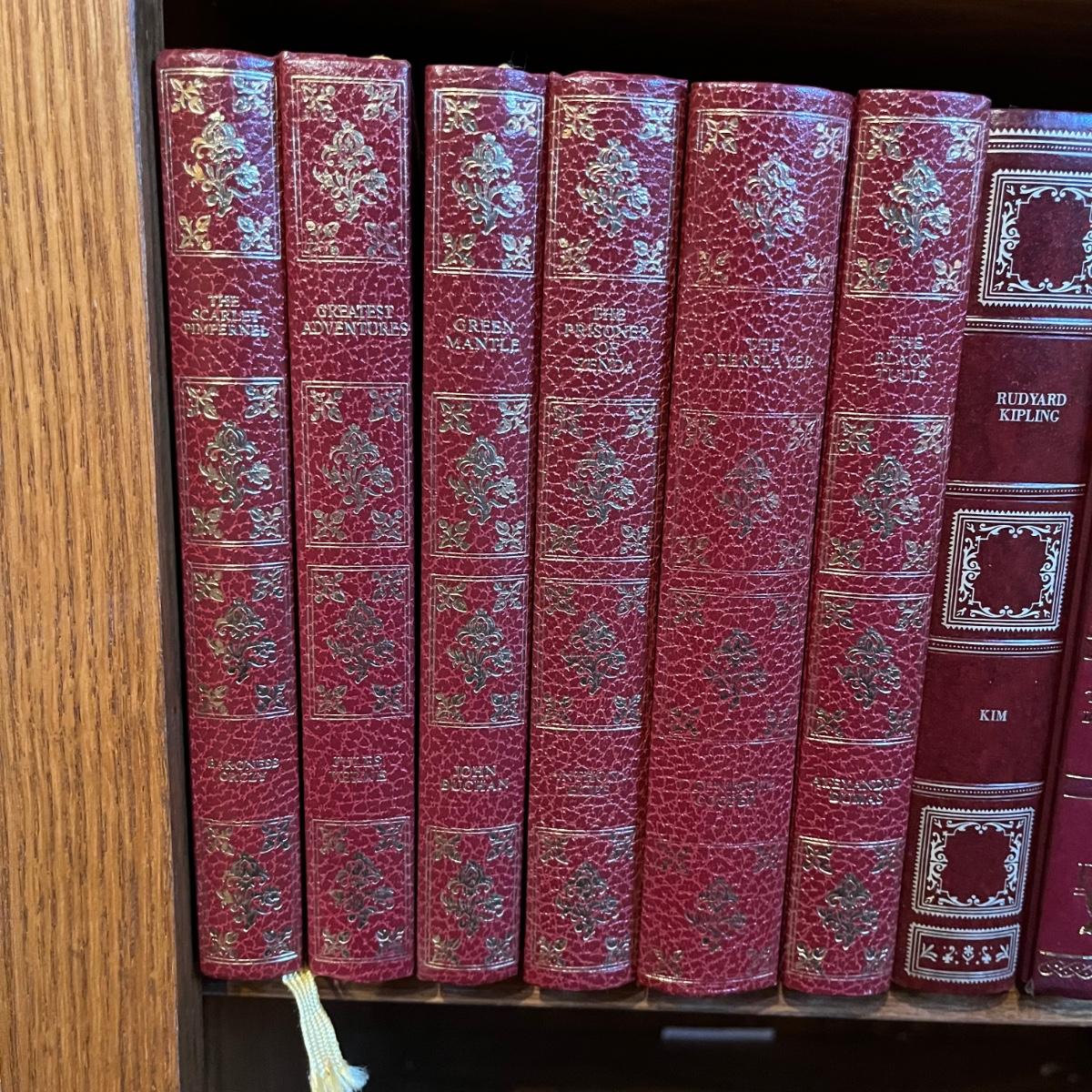 Lot contains fifteen books including Kipling, Mitchell, Buchanan, Dumas, Verne and more. All books are bound in a leatherette. These books have spots on the paper, see pictures.
