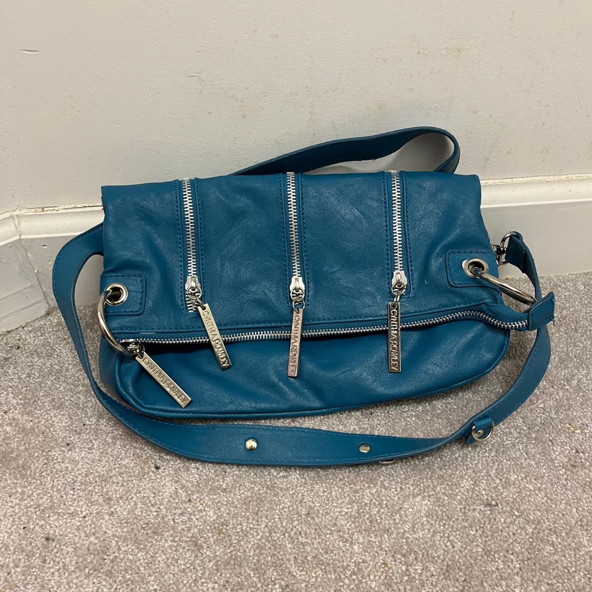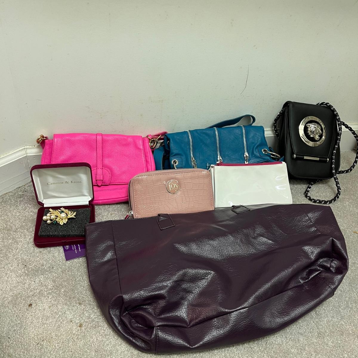Lot includes a Nima Purse, Joy Mangano wallet, Saks Fifth Ave triple wallet, Cynthia Rowley purse, pink leather purse, broach and a large tote. Tote measures 5” x 12” x 18”.