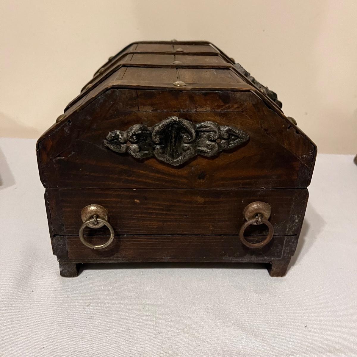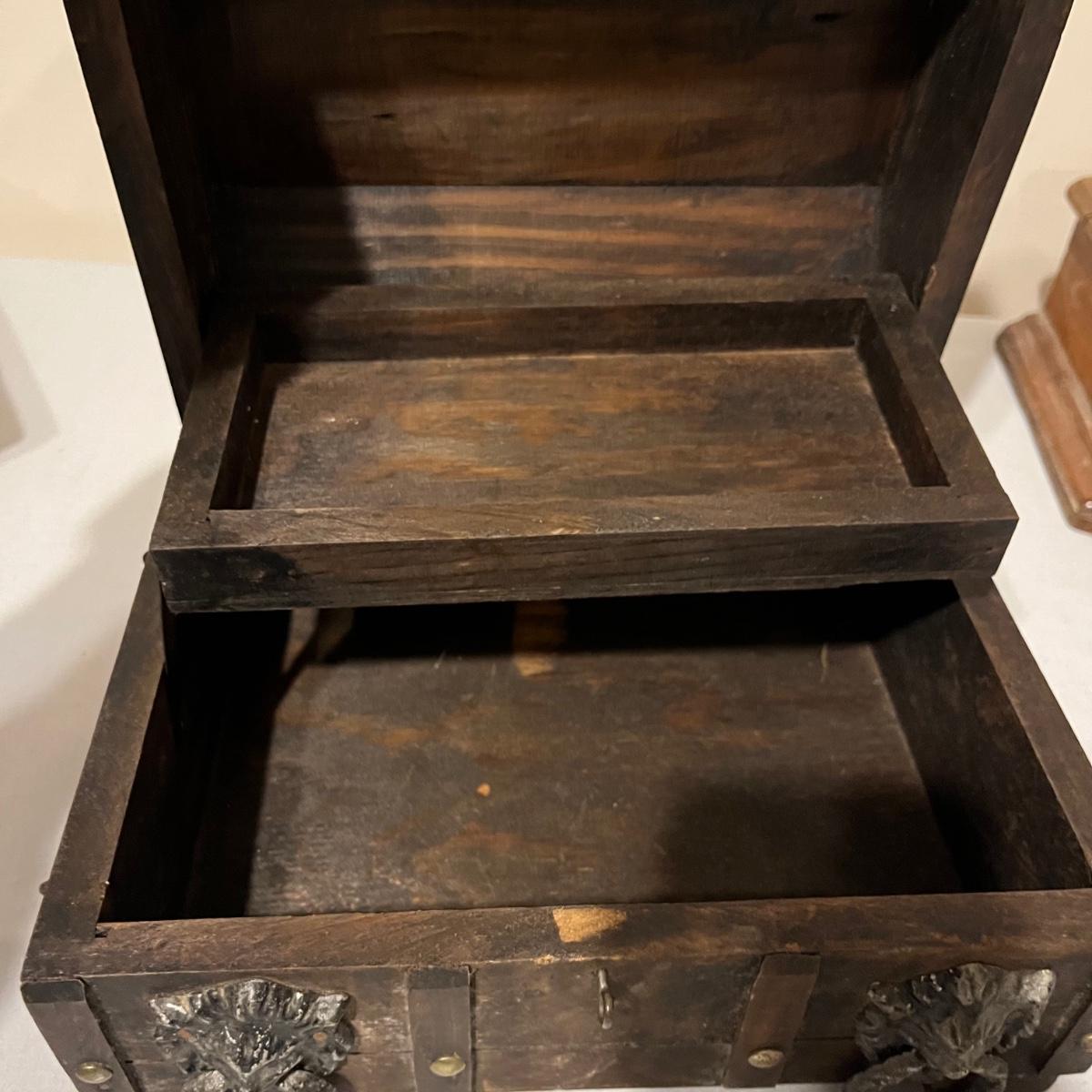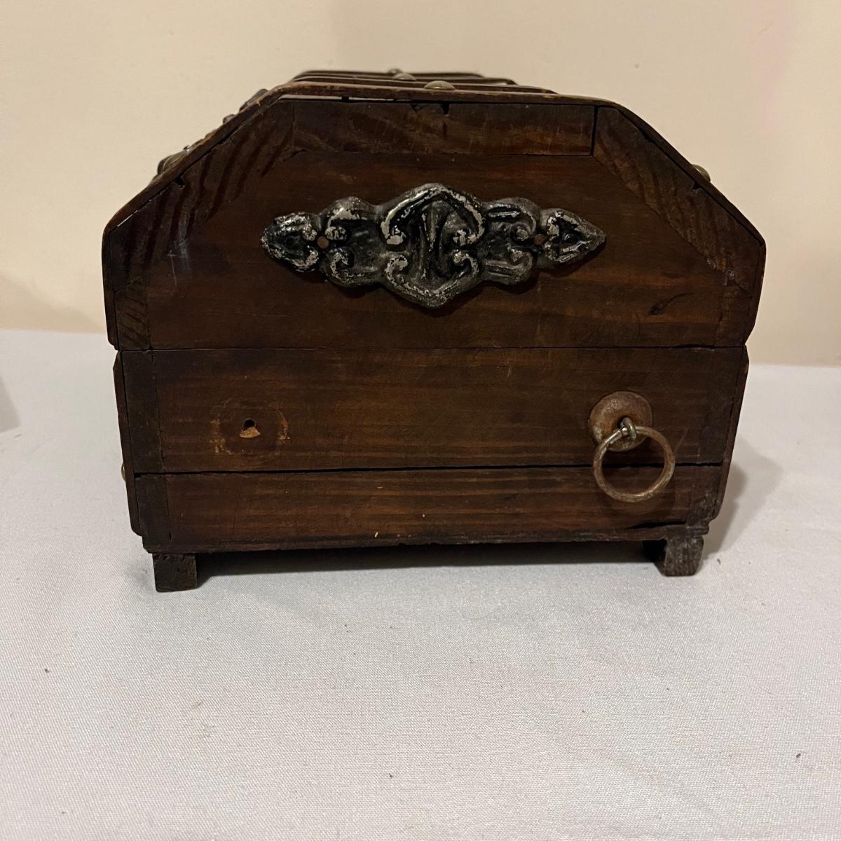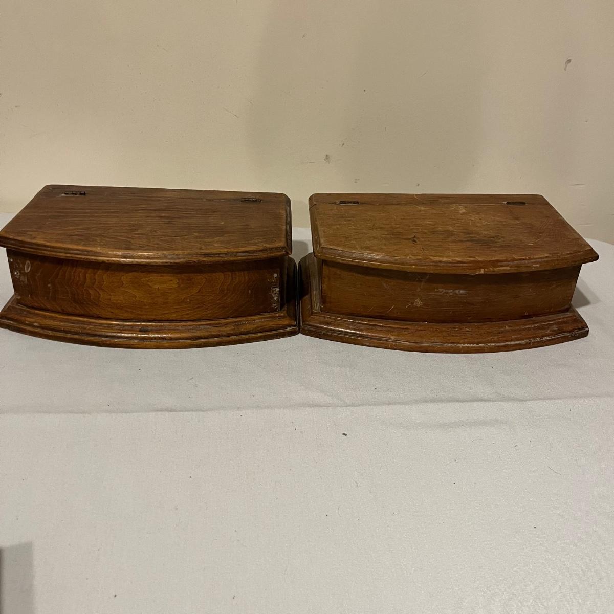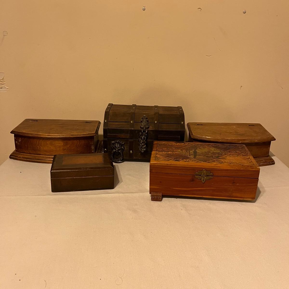 Lot contains five wooden boxes including one box with a carved top, one pair of matching boxes, a small two toned box, and a treasure type box with metal adornments. Carved box is missing one foot. Largest box measures 7.5” x 10” x 6.5”.