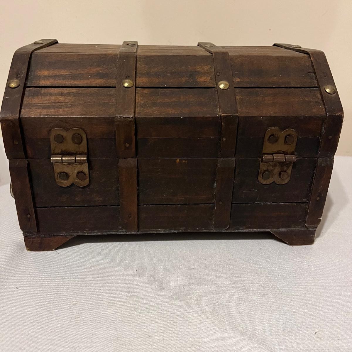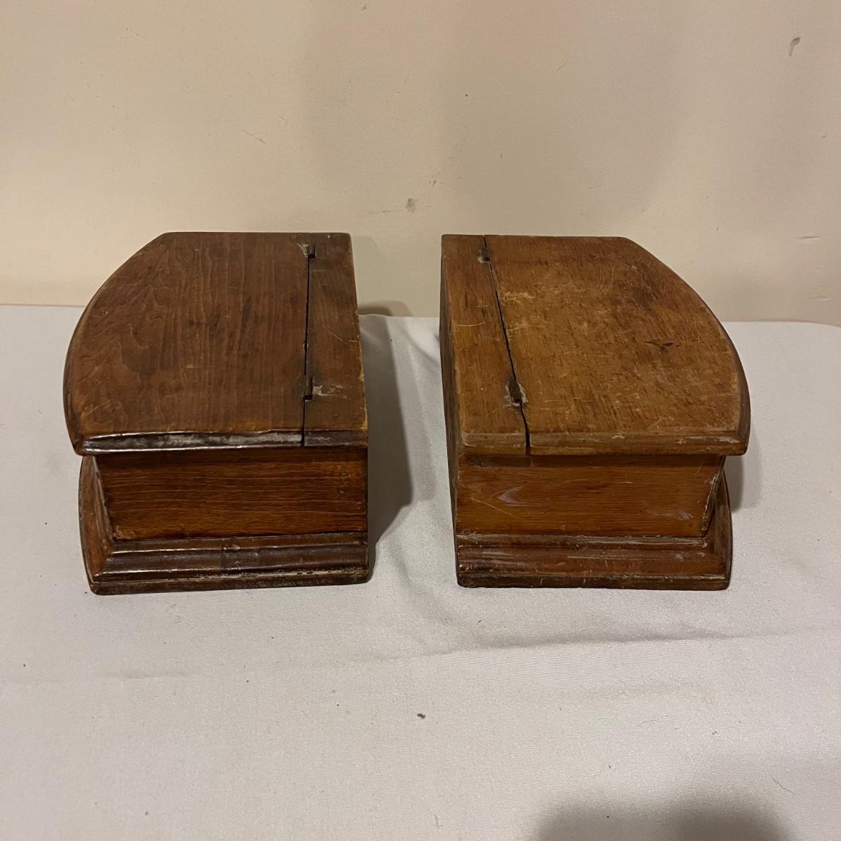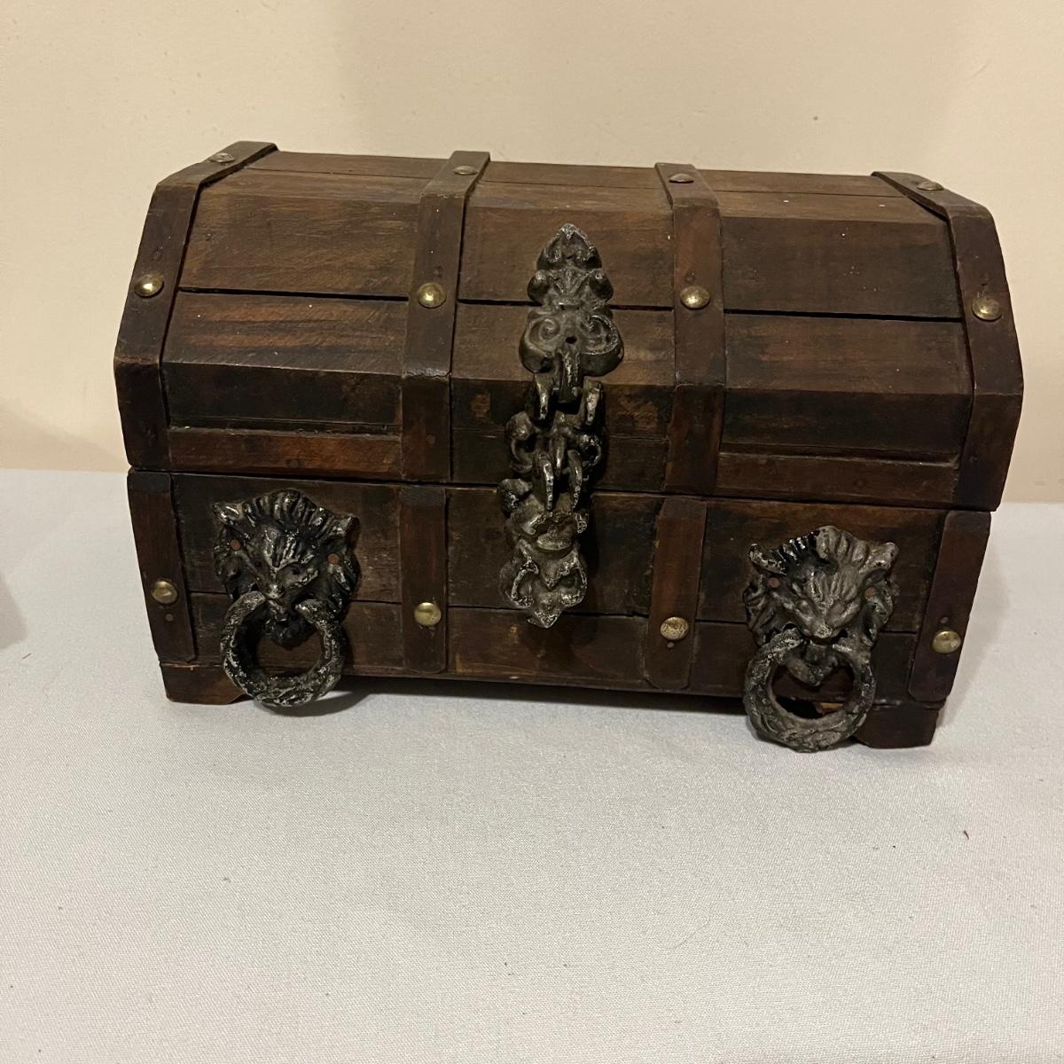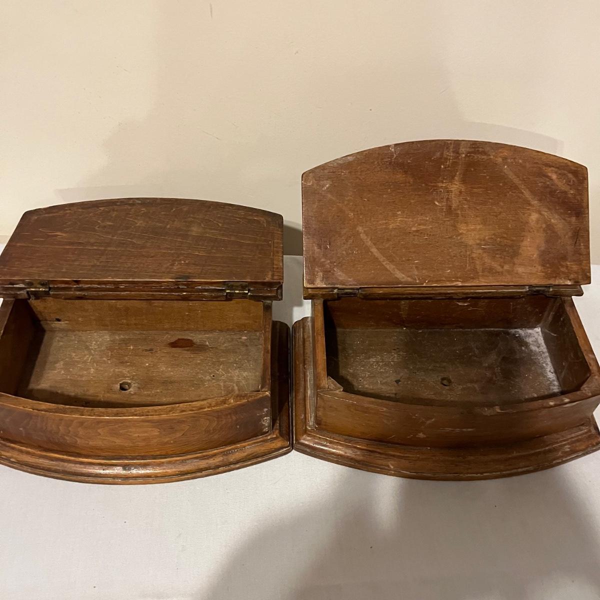 Lot contains five wooden boxes including one box with a carved top, one pair of matching boxes, a small two toned box, and a treasure type box with metal adornments. Carved box is missing one foot. Largest box measures 7.5” x 10” x 6.5”.
