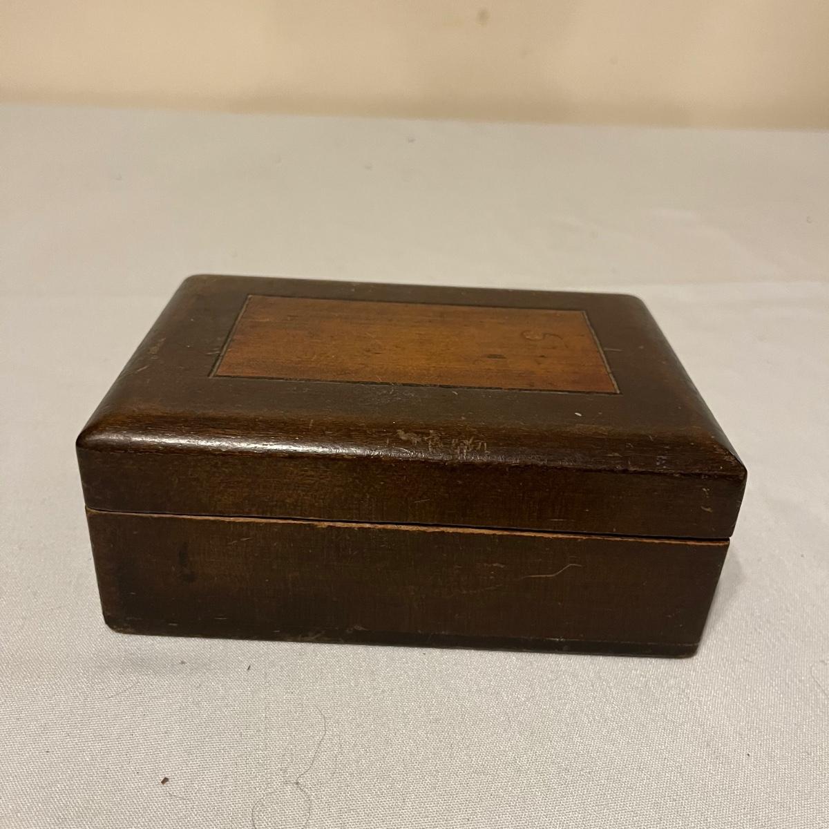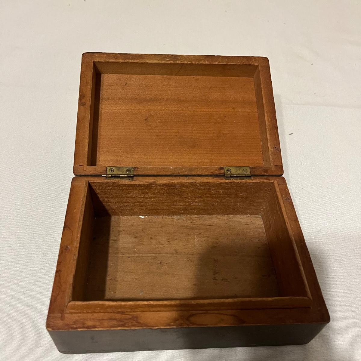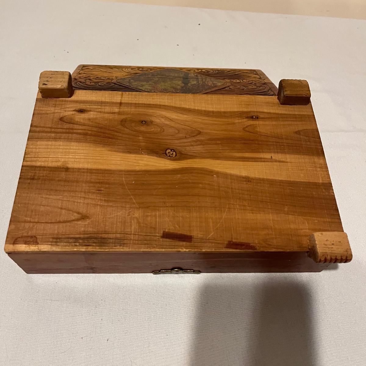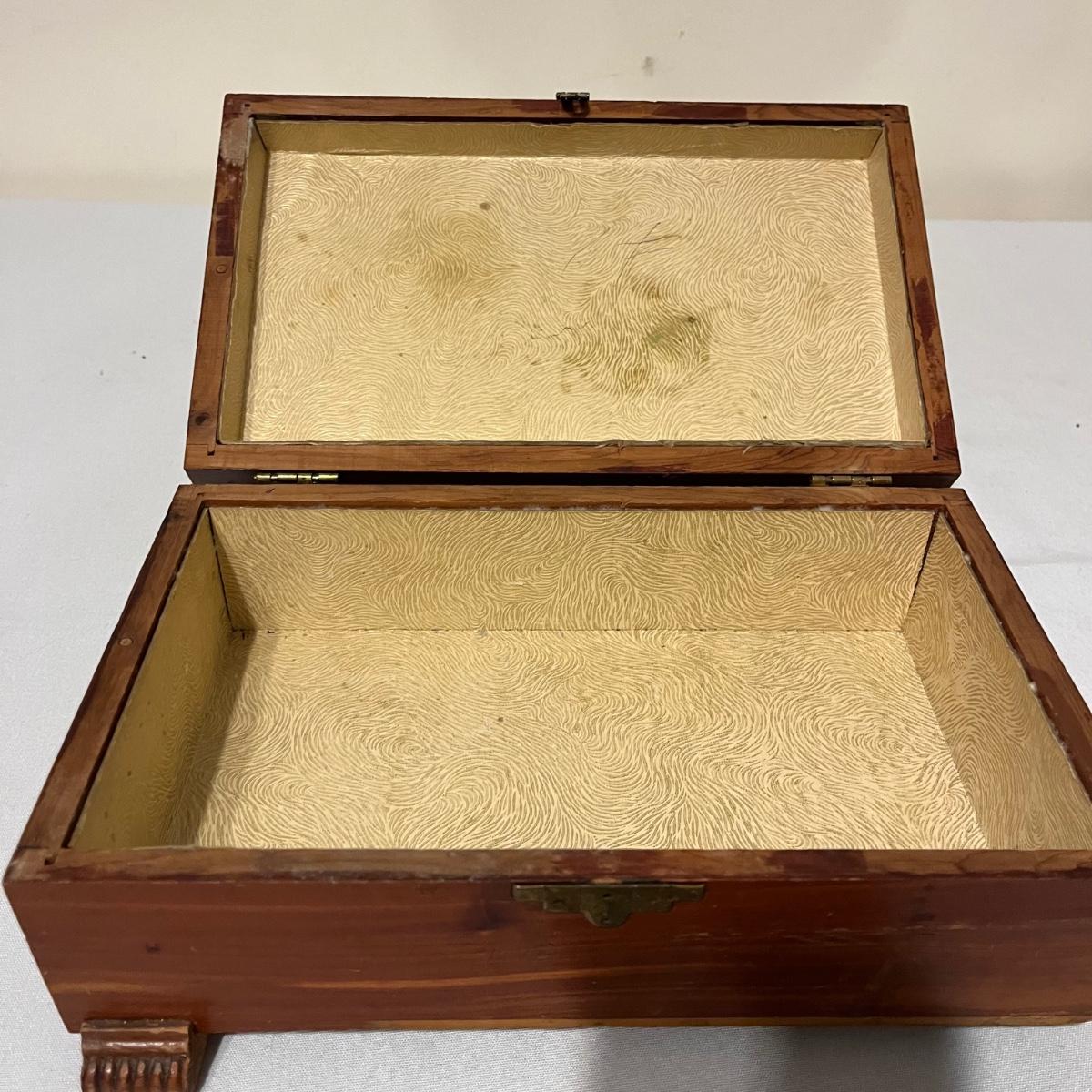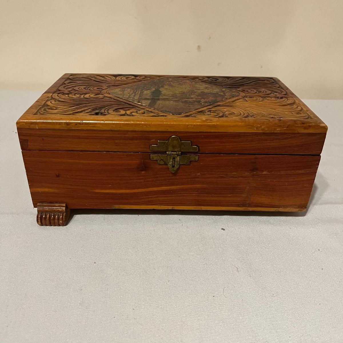 Lot contains five wooden boxes including one box with a carved top, one pair of matching boxes, a small two toned box, and a treasure type box with metal adornments. Carved box is missing one foot. Largest box measures 7.5” x 10” x 6.5”.