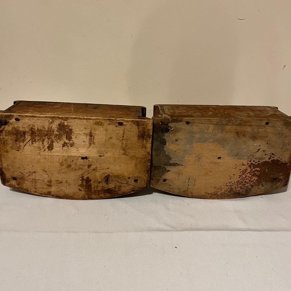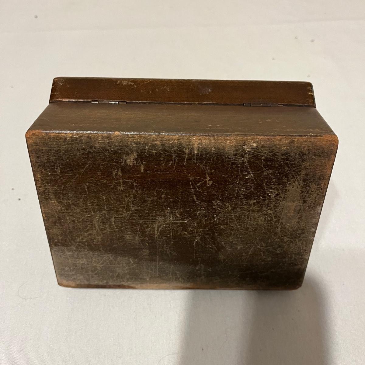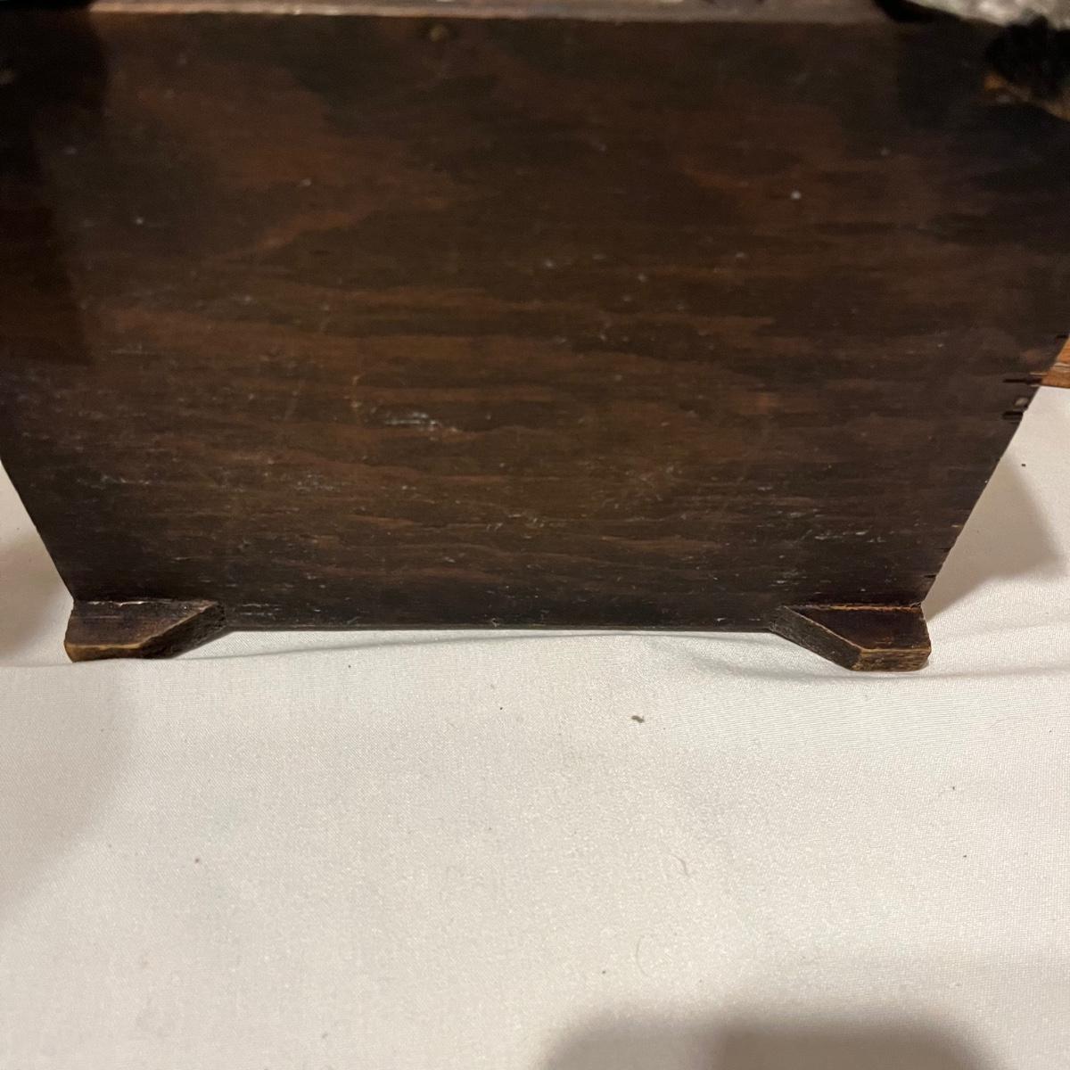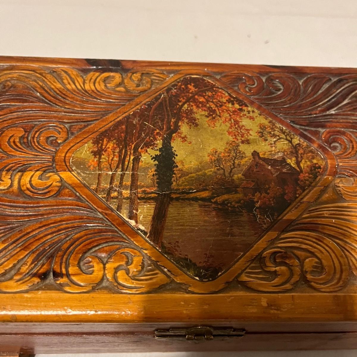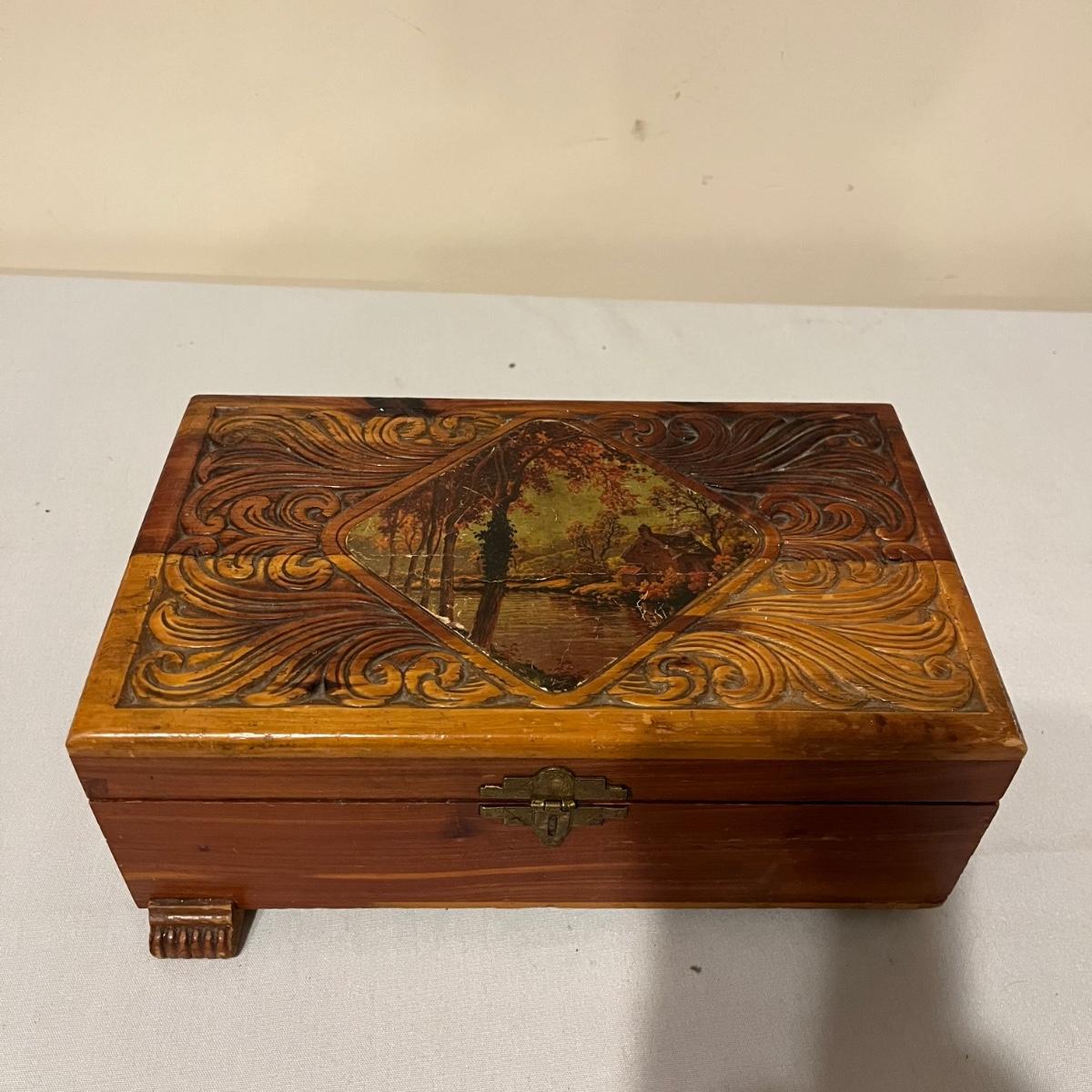 Lot contains five wooden boxes including one box with a carved top, one pair of matching boxes, a small two toned box, and a treasure type box with metal adornments. Carved box is missing one foot. Largest box measures 7.5” x 10” x 6.5”.